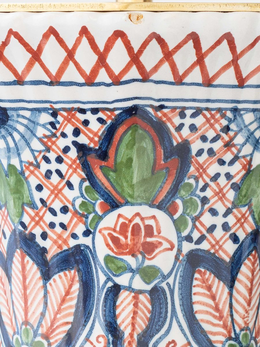 Une paire magnifiquement équilibrée de lampes de table hollandaises de Delft (Delftware) du milieu du 20e siècle, fabriquées en céramique peinte à la main par Koninklijke (Royal) Tichelaar Makkum. Les bases présentent une palette polychrome vive de Delft - bleu de cobalt, rouge brique et vert - arrangée en fleurs stylisées et en motifs symétriques à volutes qui se lisent de manière classique, recueillie et vivante.