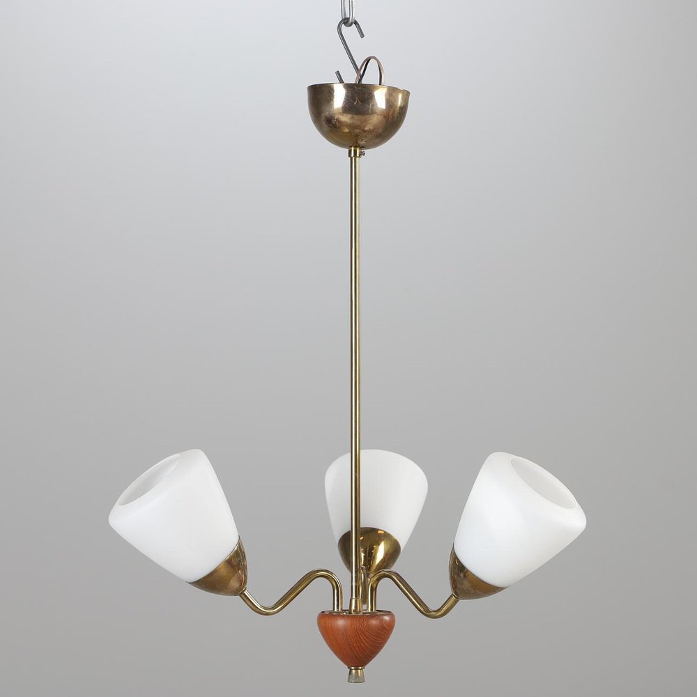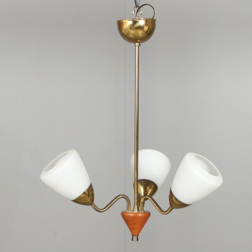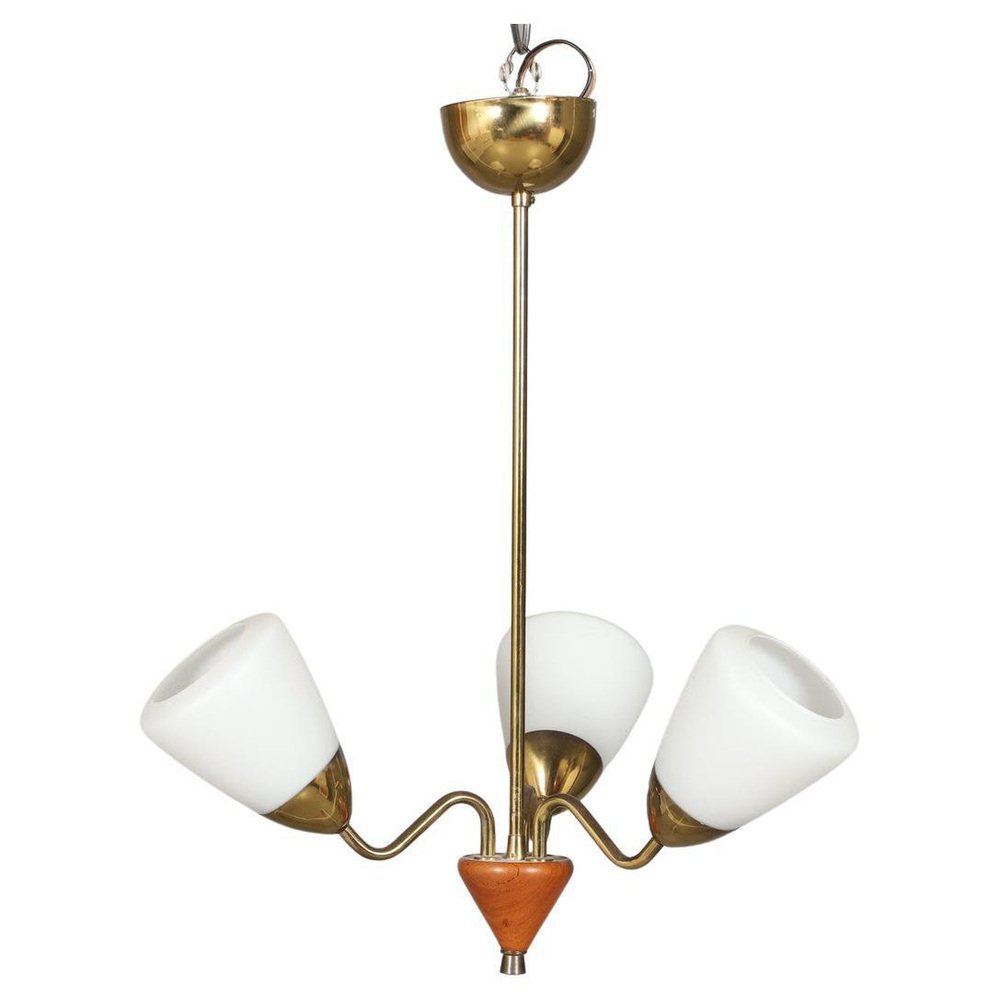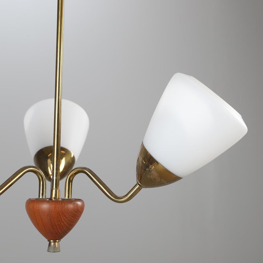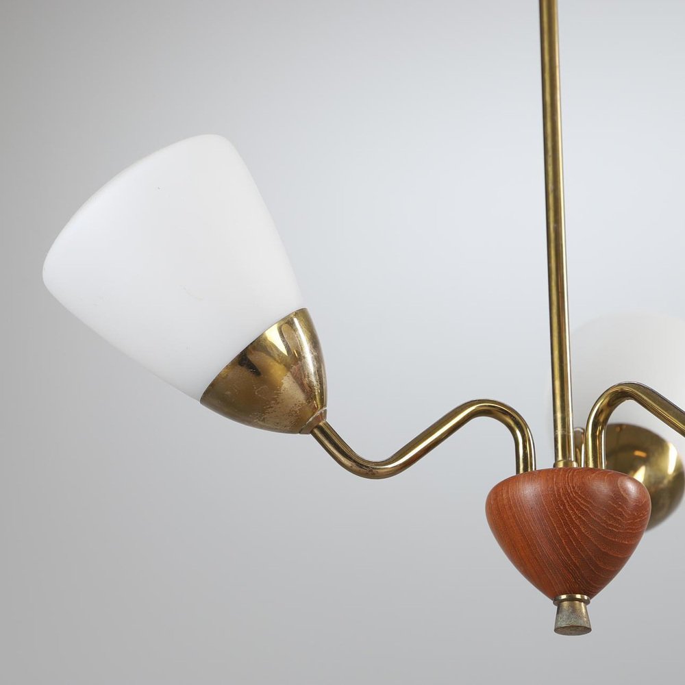 Elegant Swedish mid-century modern chandelier crafted in the 1950s, featuring a refined combination of solid teak, polished brass, and white opaline glass shades. The fixture is composed of three gracefully curved brass arms, each supporting a conical opaline glass shade with brass detailing, creating a warm and softly diffused light. The central column is executed in brass and accented with a beautifully turned solid teak element, adding warmth and a distinctly Scandinavian character to the design. The balanced proportions and organic lines reflect the clean, modernist aesthetic associated with mid-century Swedish lighting. A sophisticated and timeless piece, ideal above a dining table, in a living room, or as a statement fixture in an entryway.