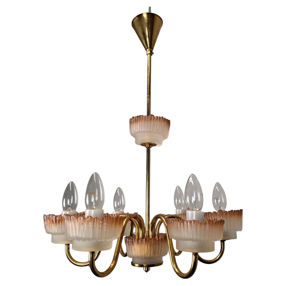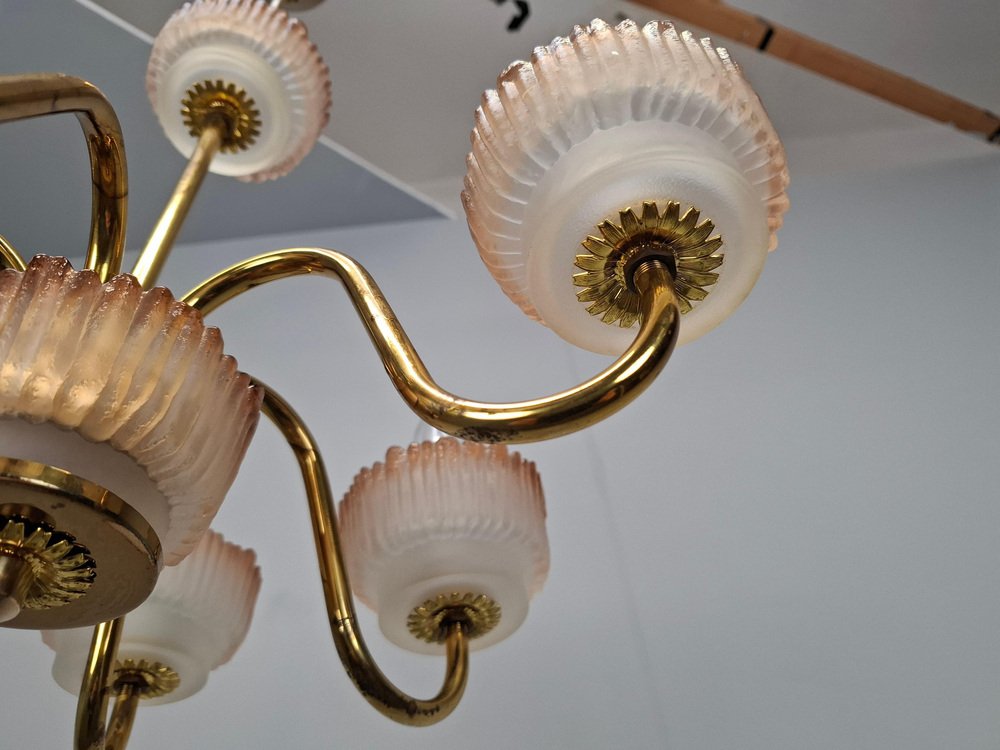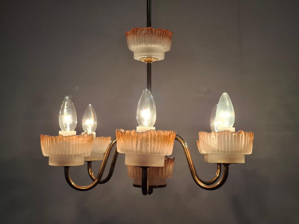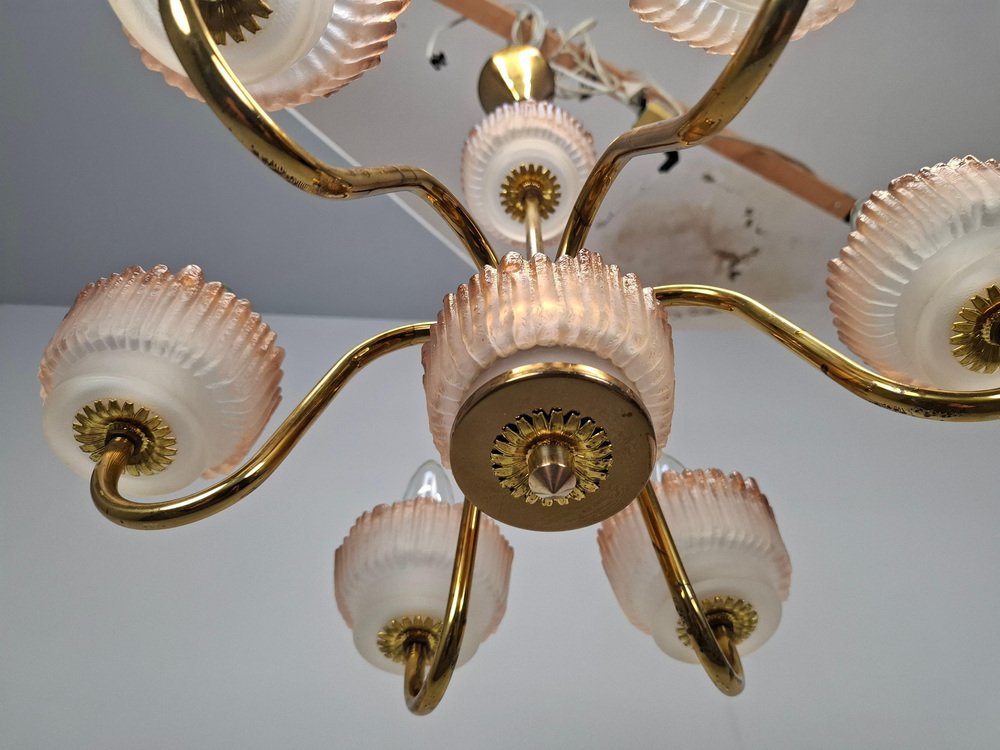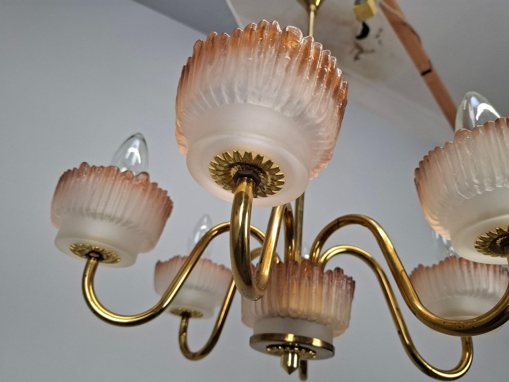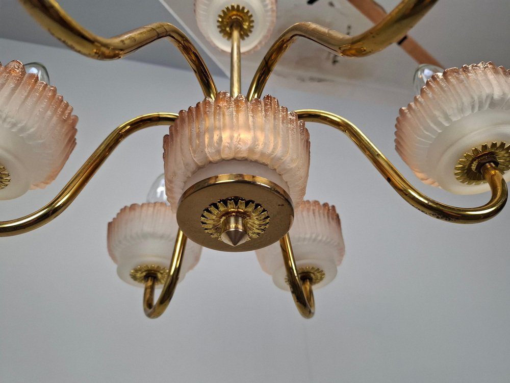 Lustre à 6 Bras Mid-Century en Laiton et Verre Givré, elezný Brod, 1960s