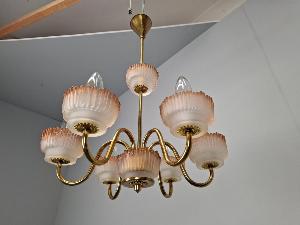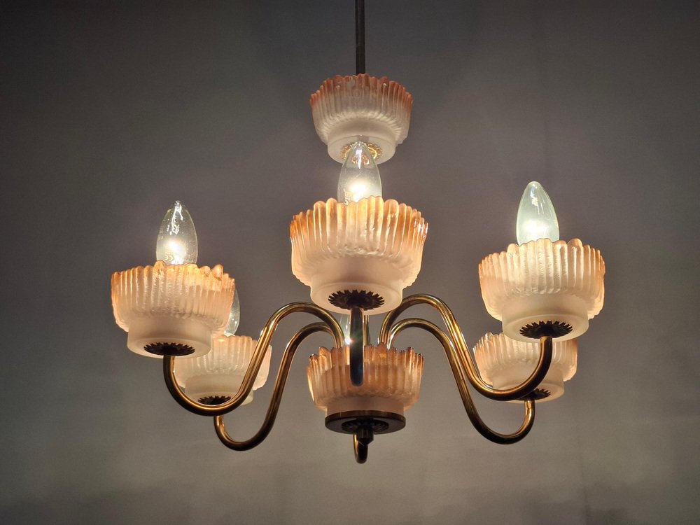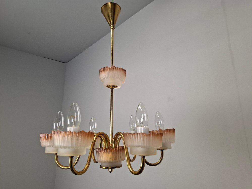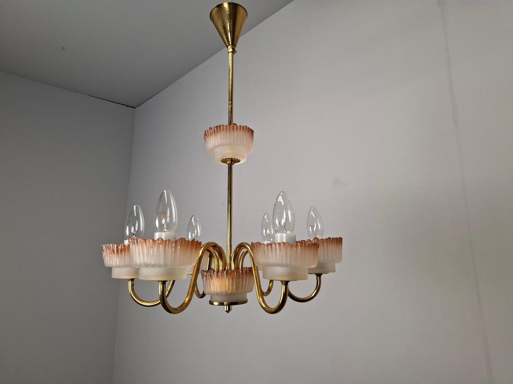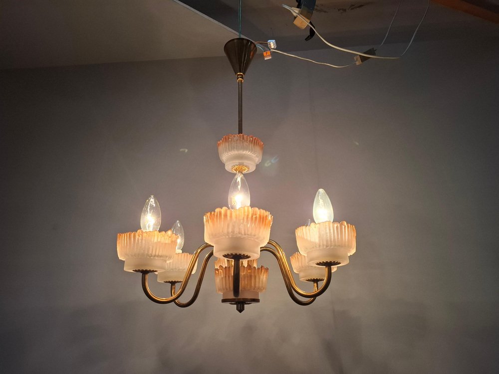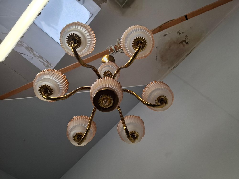 Lustre à 6 Bras Mid-Century en Laiton et Verre Givré, elezný Brod, 1960s