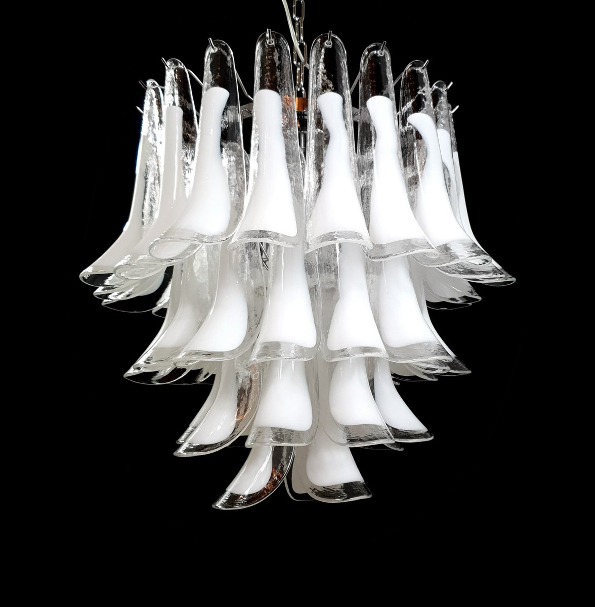 Lustre vintage de Murano, style Mazzega, des années 1980, rond et adapté à tout espace. Ce lustre est composé de 44 pièces de verre de Murano en forme de pétales, en cristal avec un cœur blanc laiteux. Le lustre présente des reflets de lumière très particuliers lorsqu'il est observé sous différents angles. Le cristal en forme de pétale avec un cœur blanc dégage une impression de raffinement et de finesse. La finition en chrome poli est d'une grande beauté et d'une grande élégance. Très exclusif, il remplit la pièce de couleurs et de sobriété. Avec sa forme pleine et ample, vous ne pourrez pas vous empêcher de le regarder sous les innombrables angles de lumière. Vu d'en bas, le lustre ressemble à une fleur qui s'épanouit au printemps, une marguerite parfumée. Ce lustre a un diamètre de 65 cm et une hauteur de 60 cm. Il peut être alimenté par 3 ampoules E27. Ce lustre a été créé et produit dans notre usine par nos maîtres artisans.