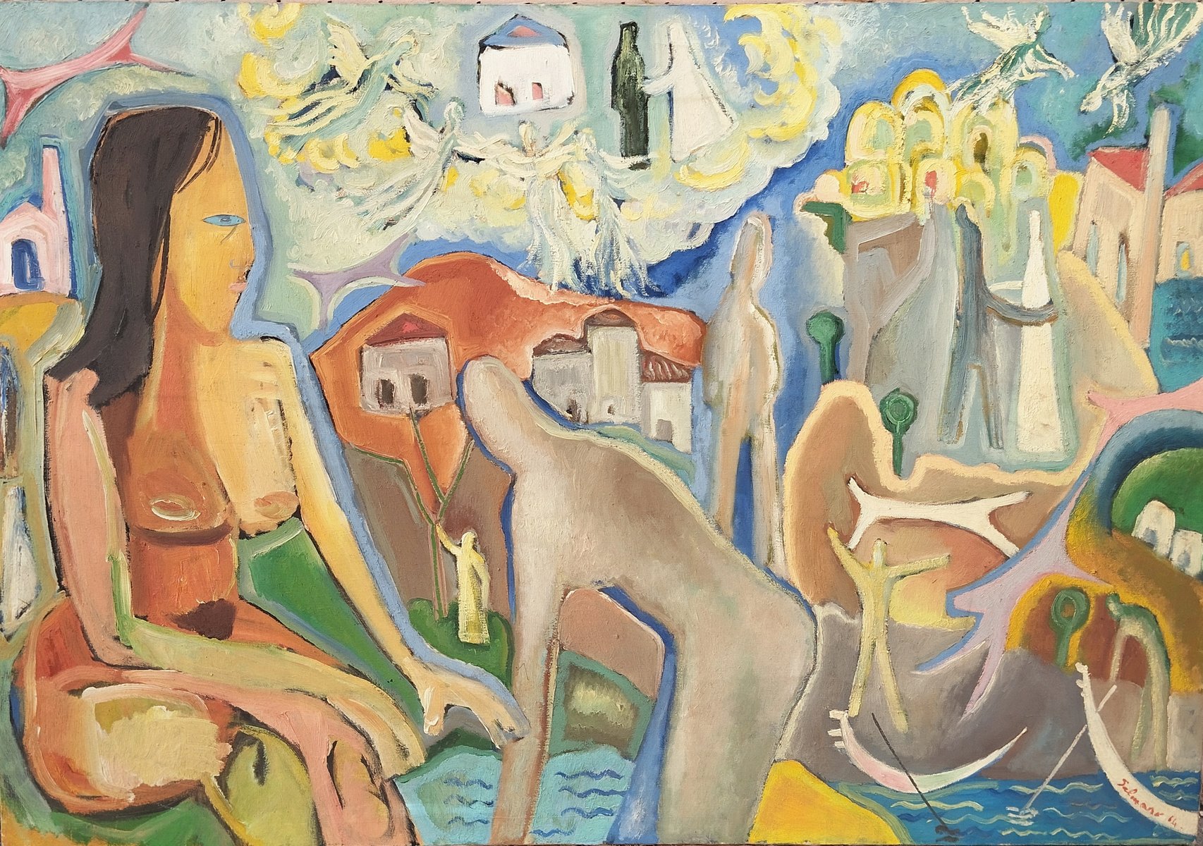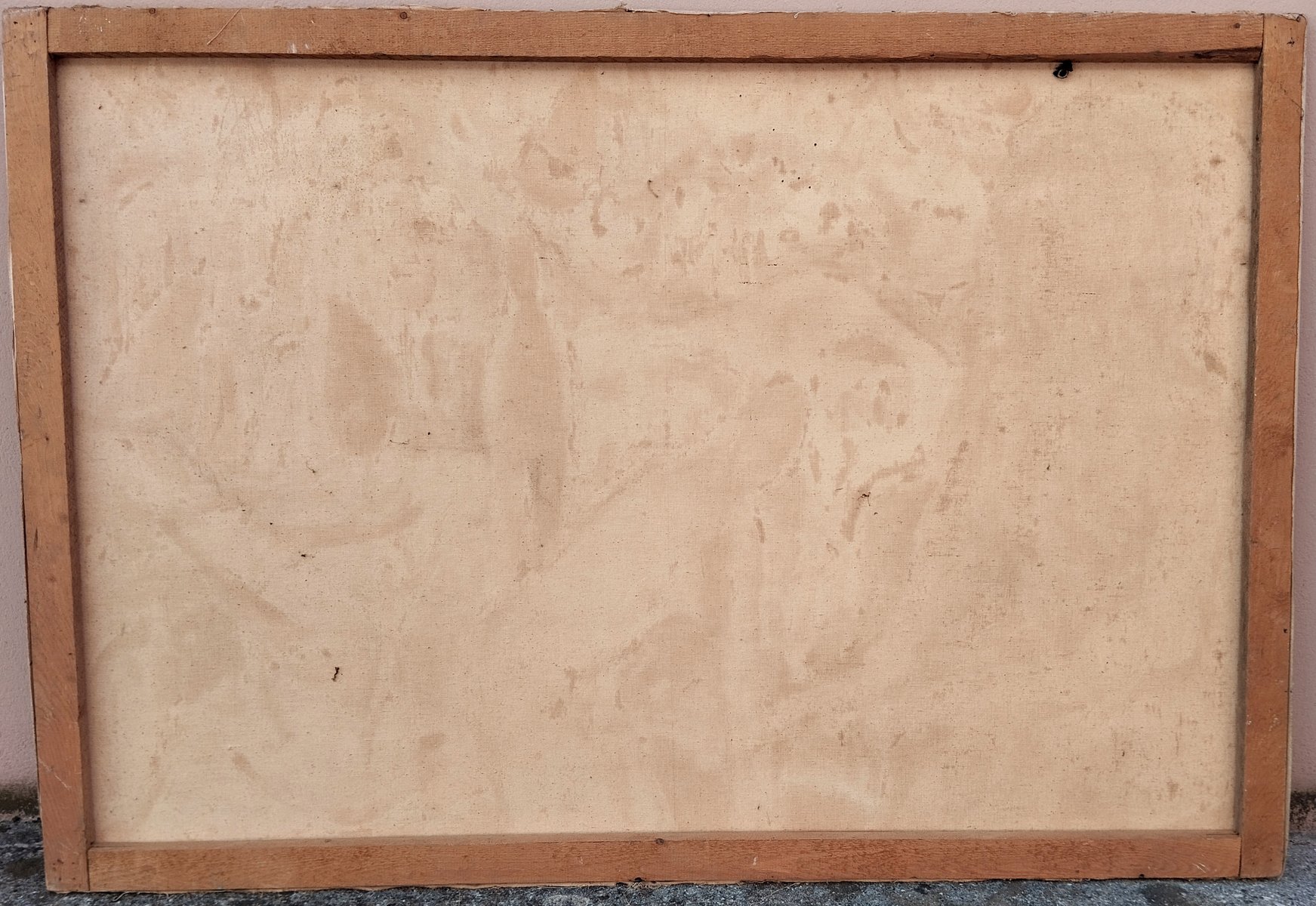 This large oil on canvas of considerable size captures a significant moment in Salmaso's artistic production. The work features a complex figurative and abstract composition, rich in symbolism and narrative, with elements reminiscent of dreamlike landscapes, human figures, and celestial forms, all expressed in a vibrant and dynamic color palette. Its imposing scale makes it a focal point for any space.