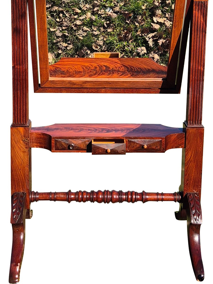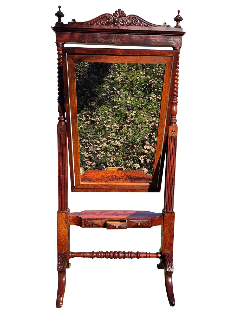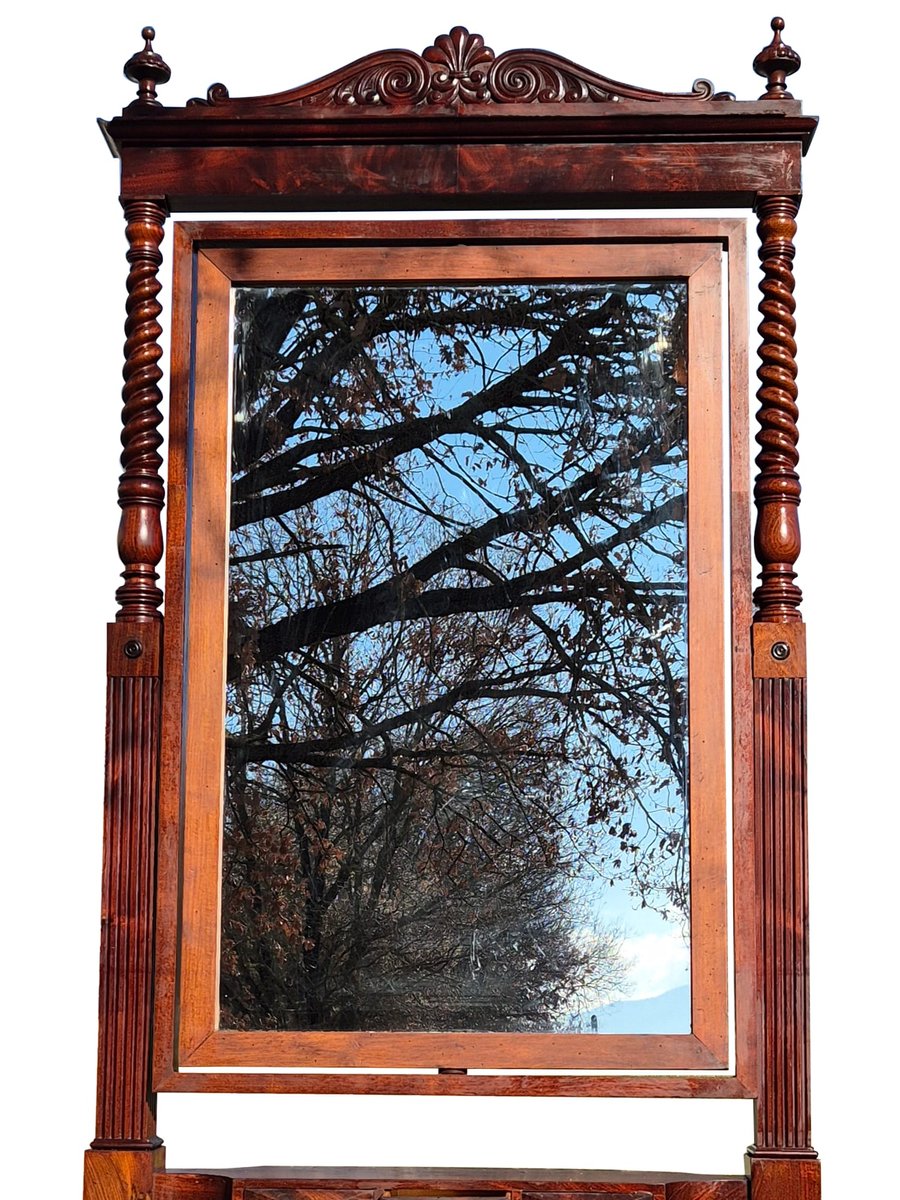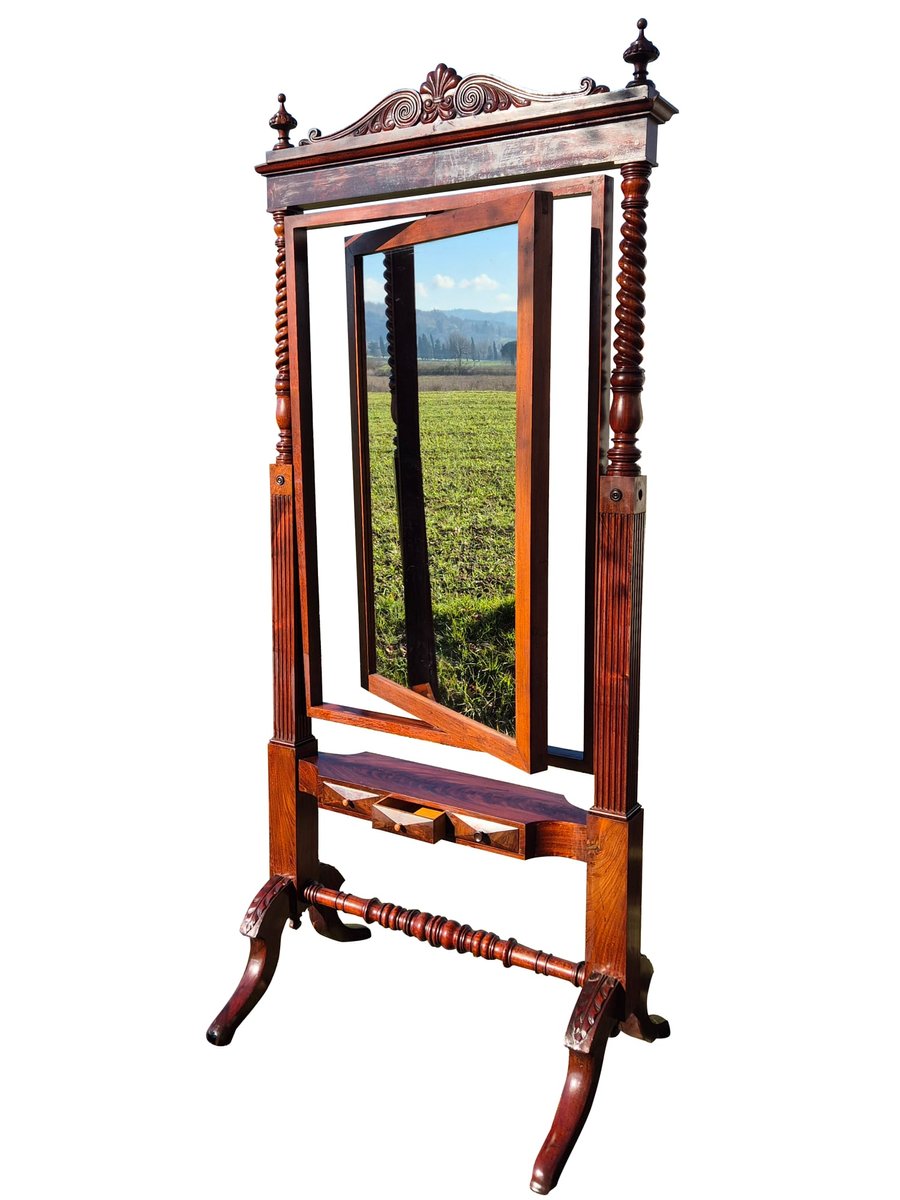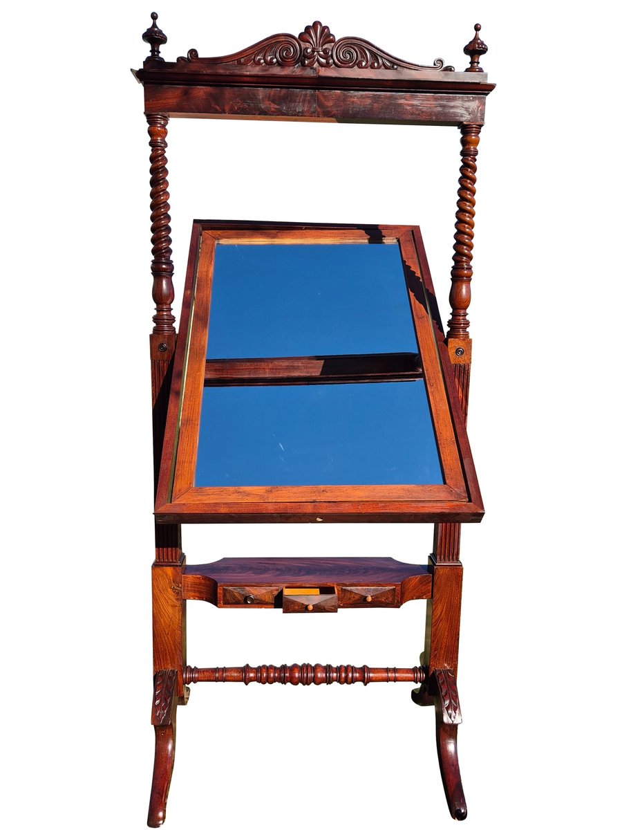 La pièce présente un cadre rectangulaire avec un verre biseauté d'origine, monté sur une structure robuste avec un mécanisme d'inclinaison entièrement fonctionnel, permettant de régler le miroir à différents angles. Le design est enrichi par des colonnes tournées en forme de torsade, une crête supérieure sculptée avec des volutes et des fleurons, et une base profilée avec un traversier tourné et des pieds courbés. Une petite étagère inférieure avec des tiroirs complète la composition, initialement destinée aux accessoires de toilette, renforçant à la fois la fonctionnalité et l'attrait décoratif.