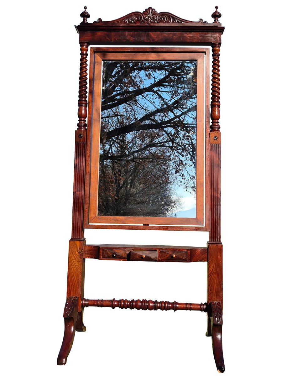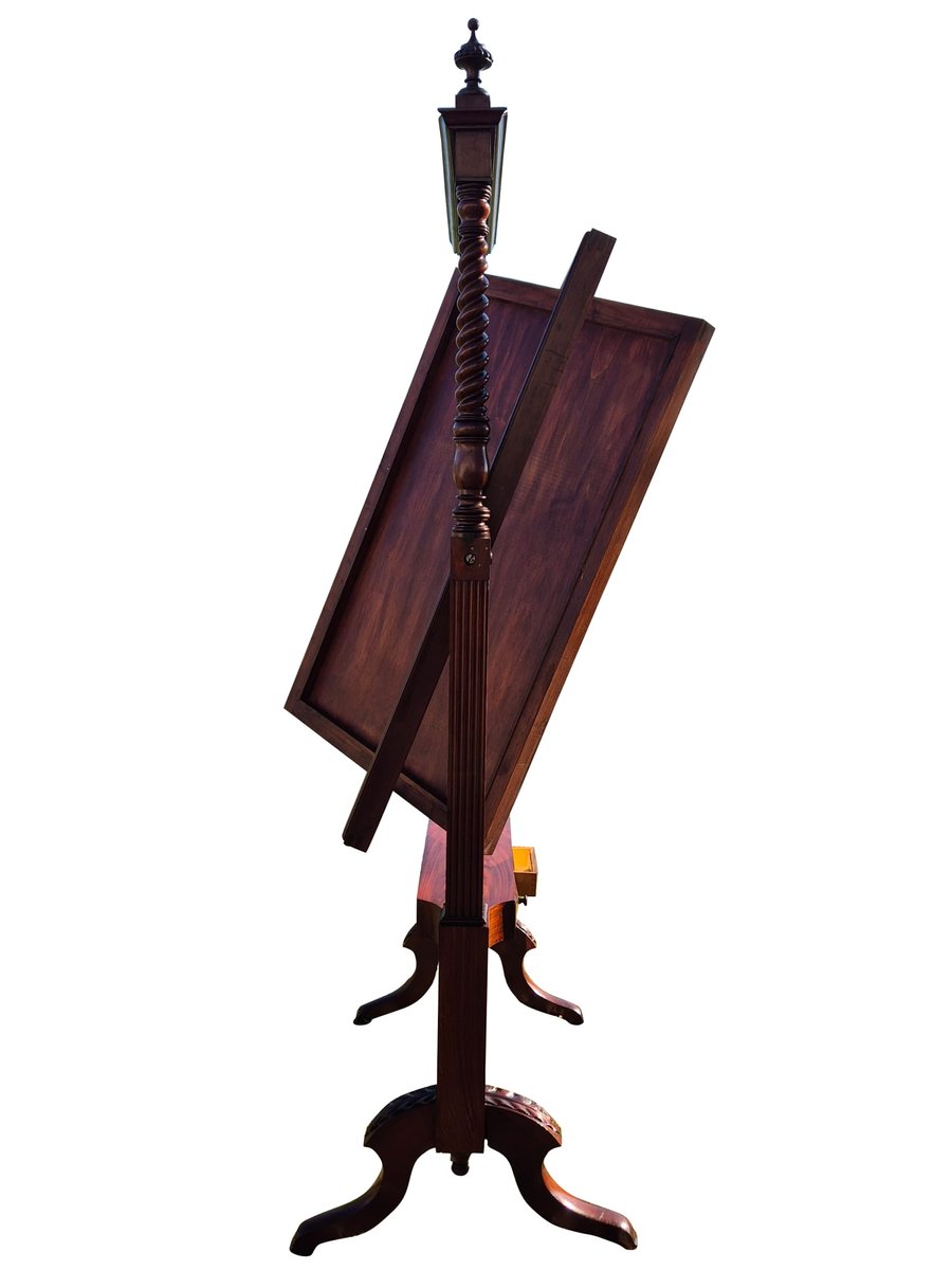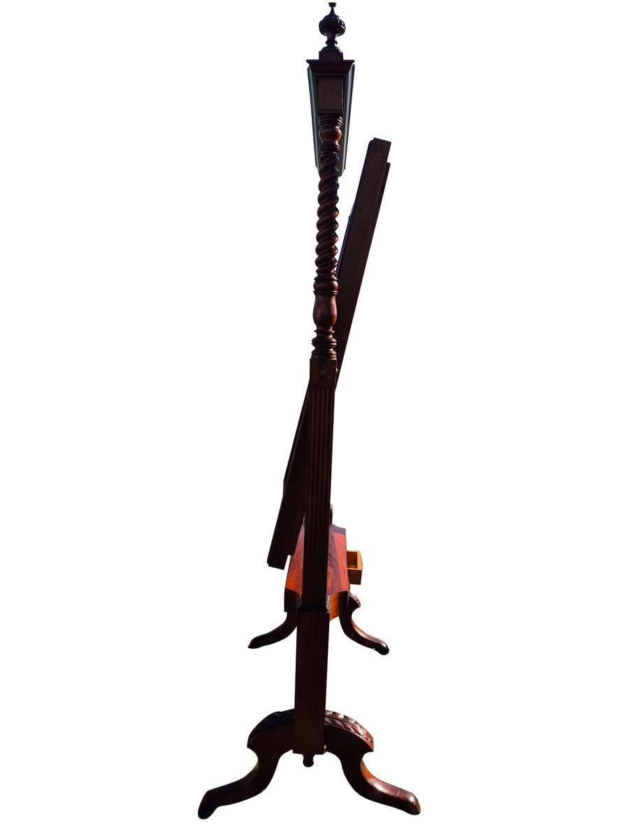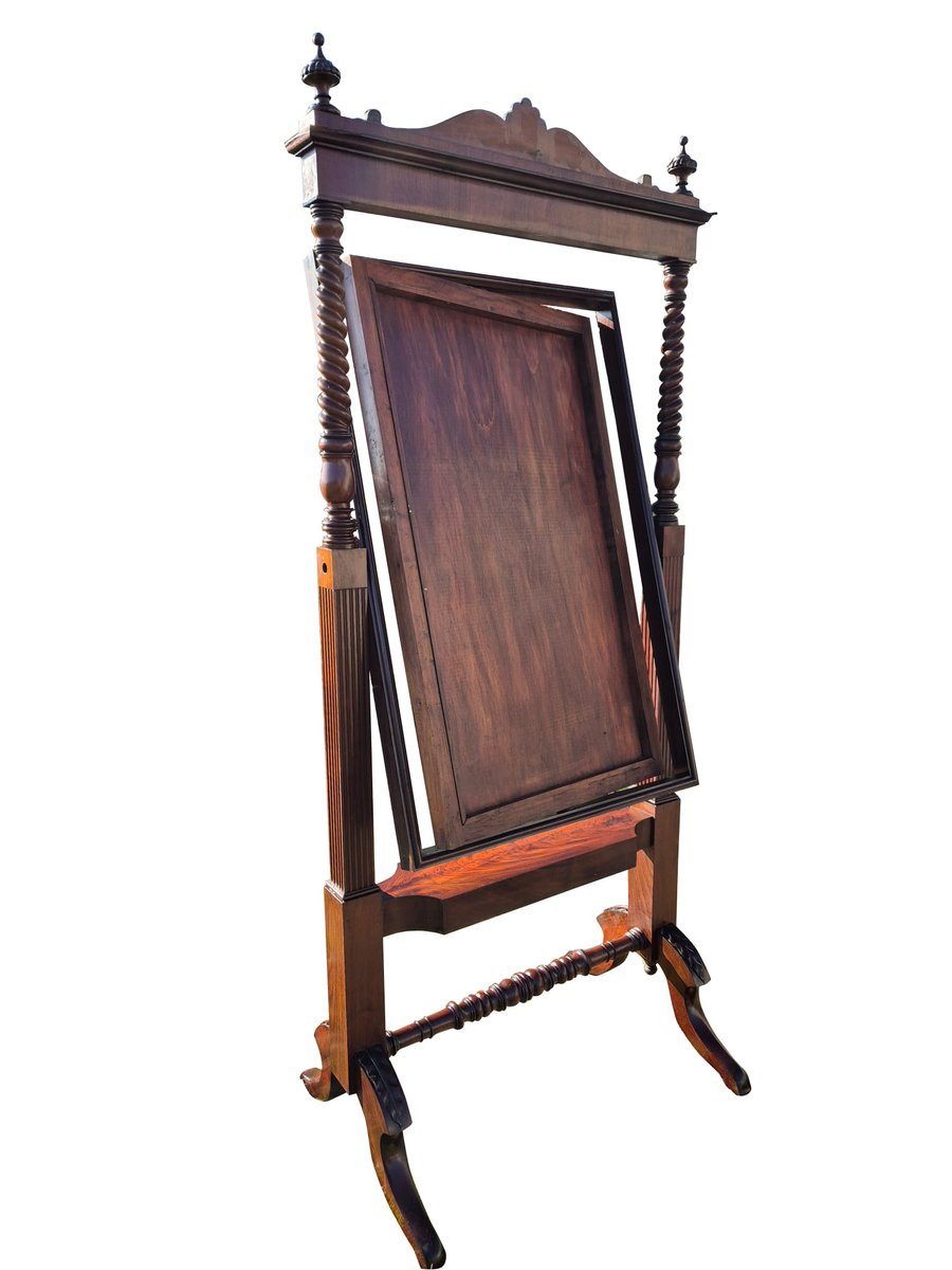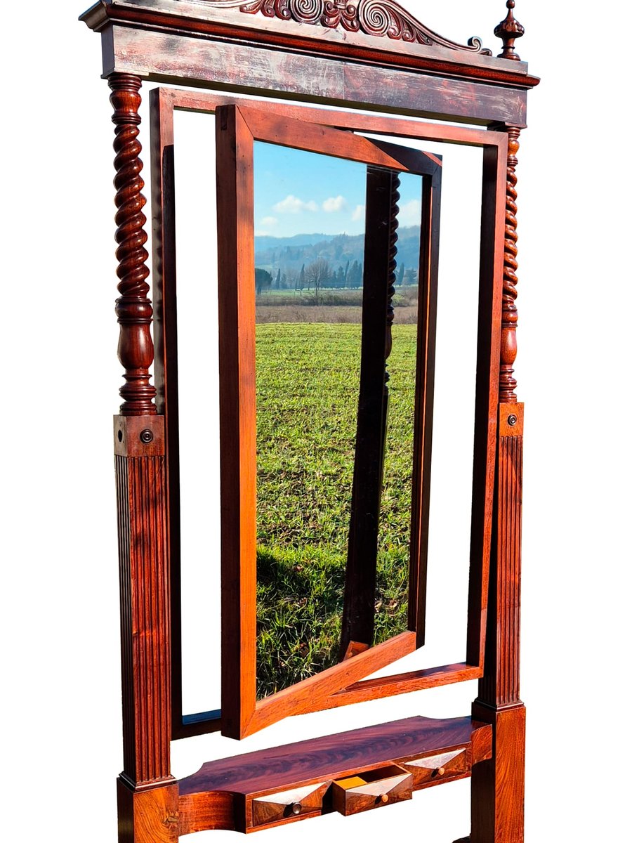 Elegant antique tilting floor mirror crafted in solid mahogany, dating to the late 19th / early 20th century.