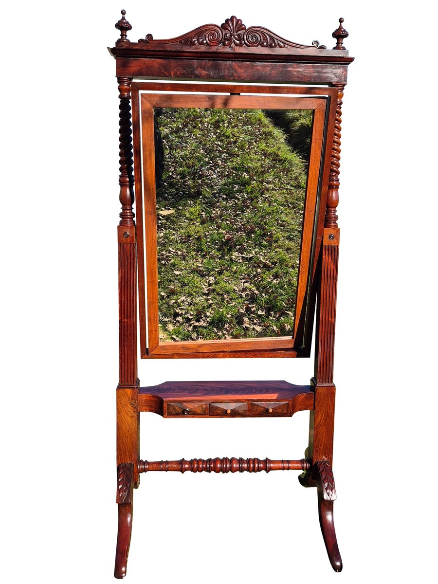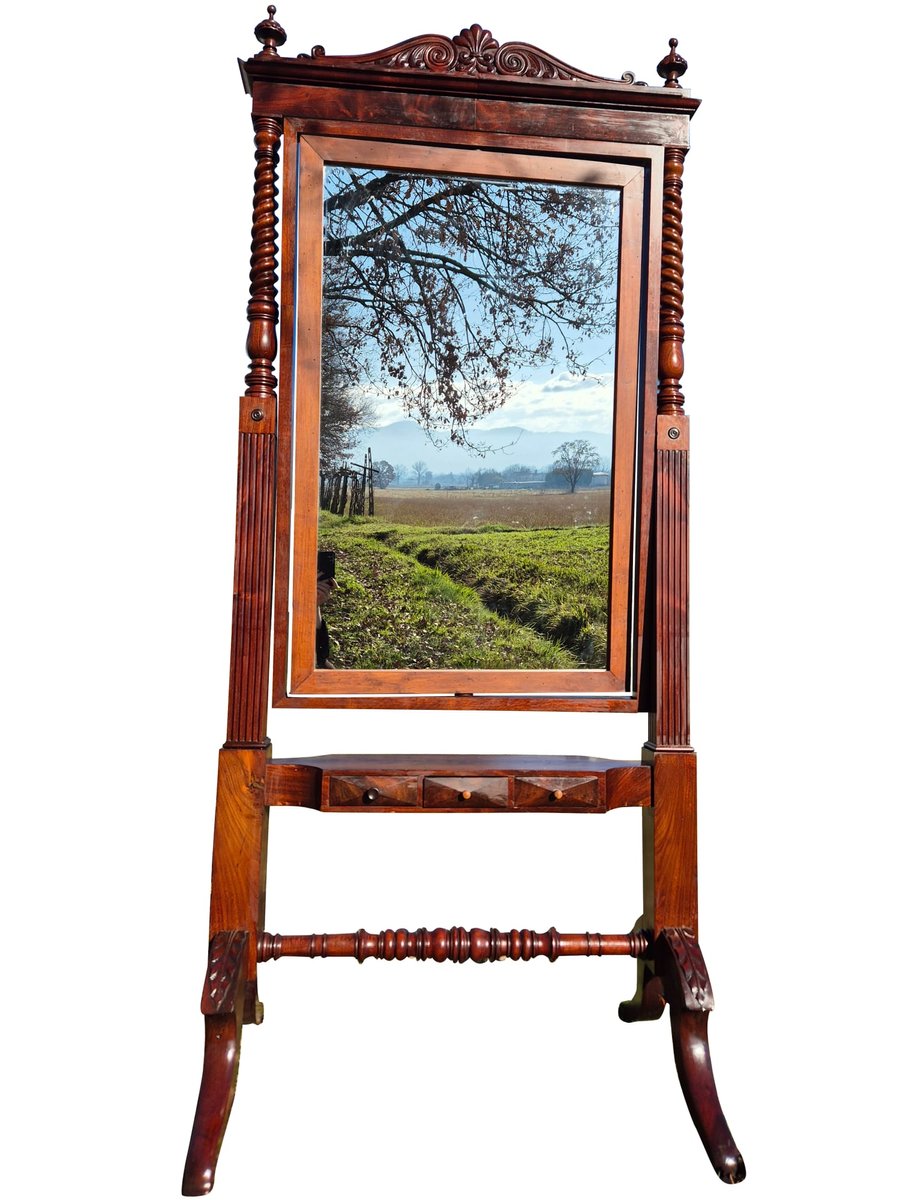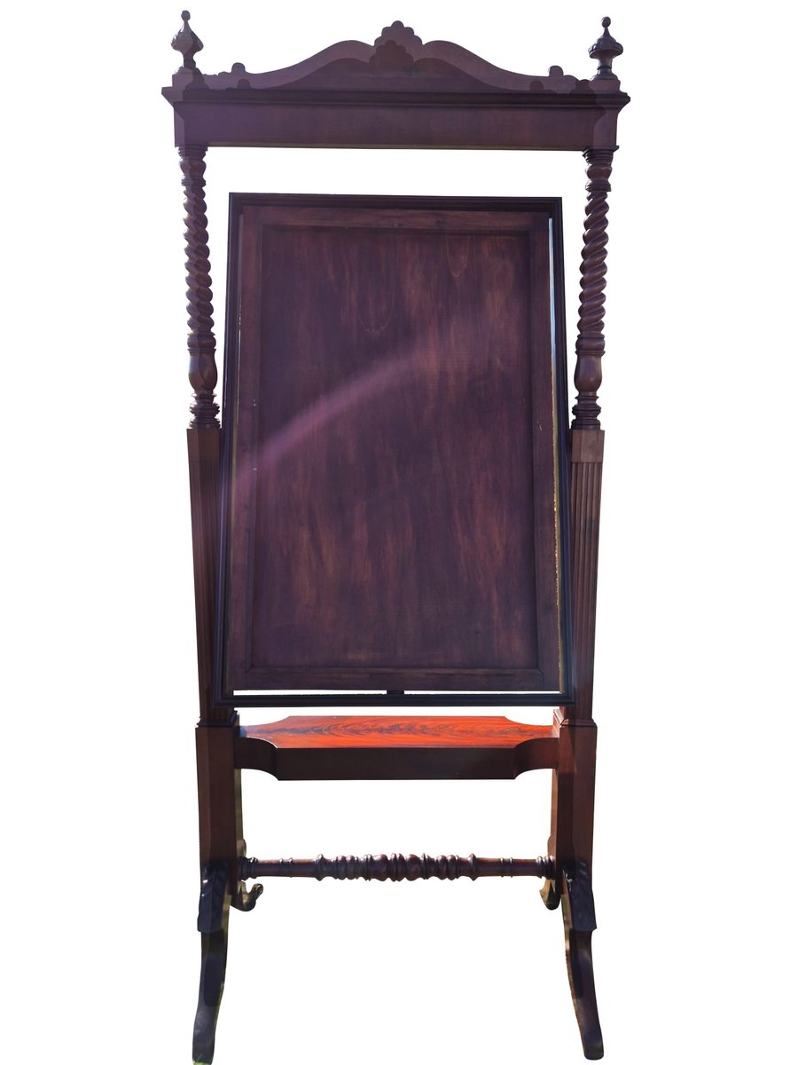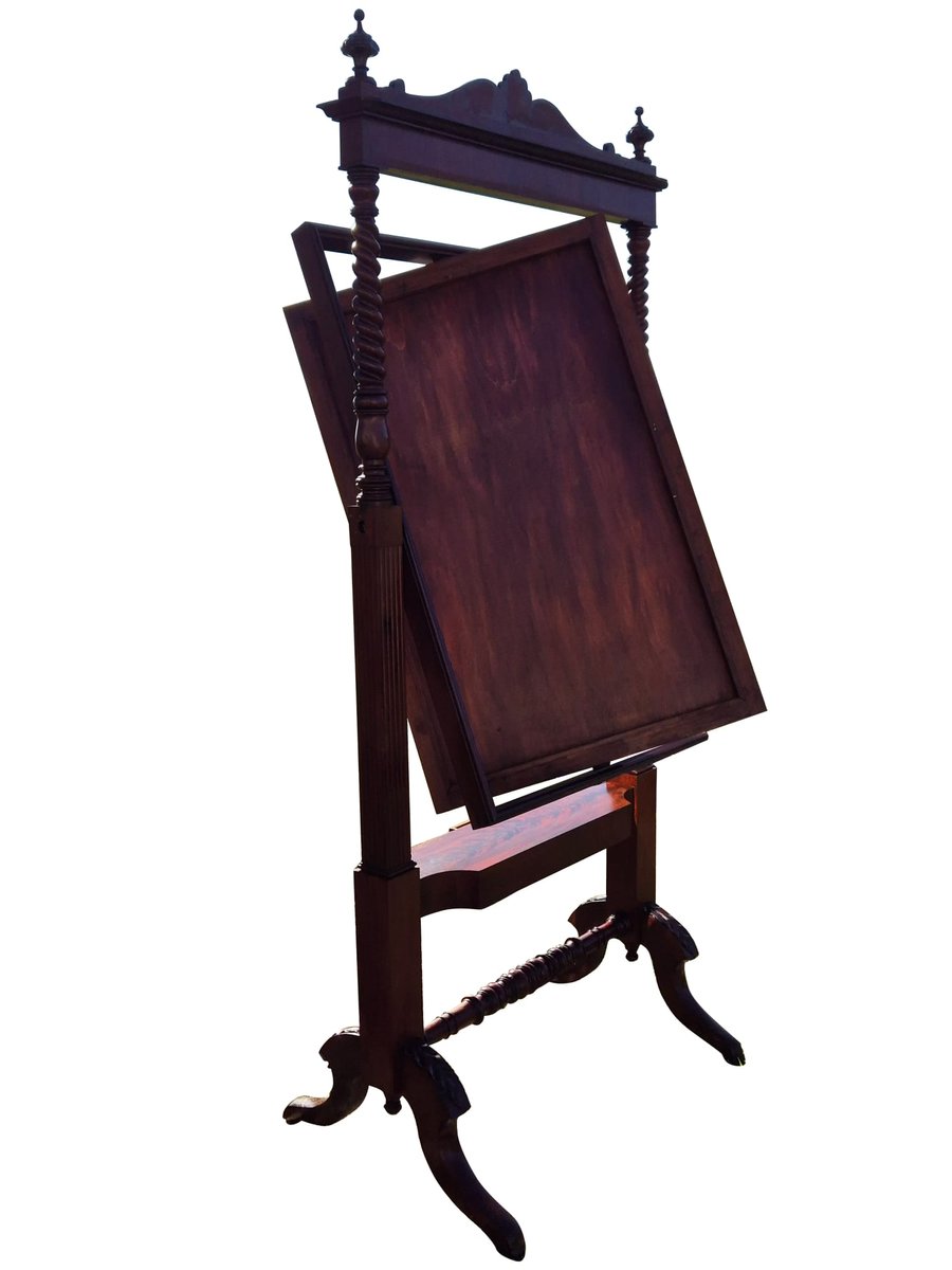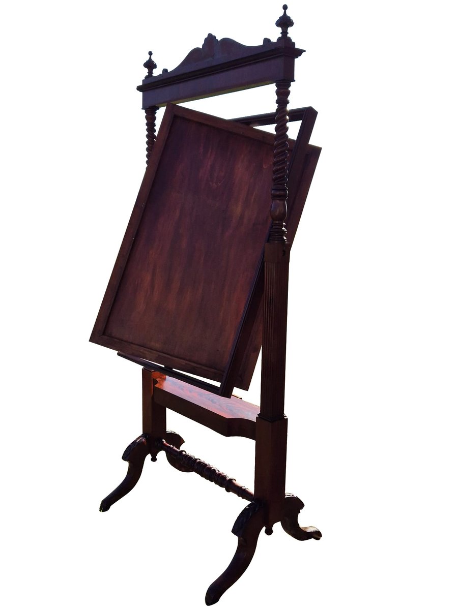 Elegant antique tilting floor mirror crafted in solid mahogany, dating to the late 19th / early 20th century.