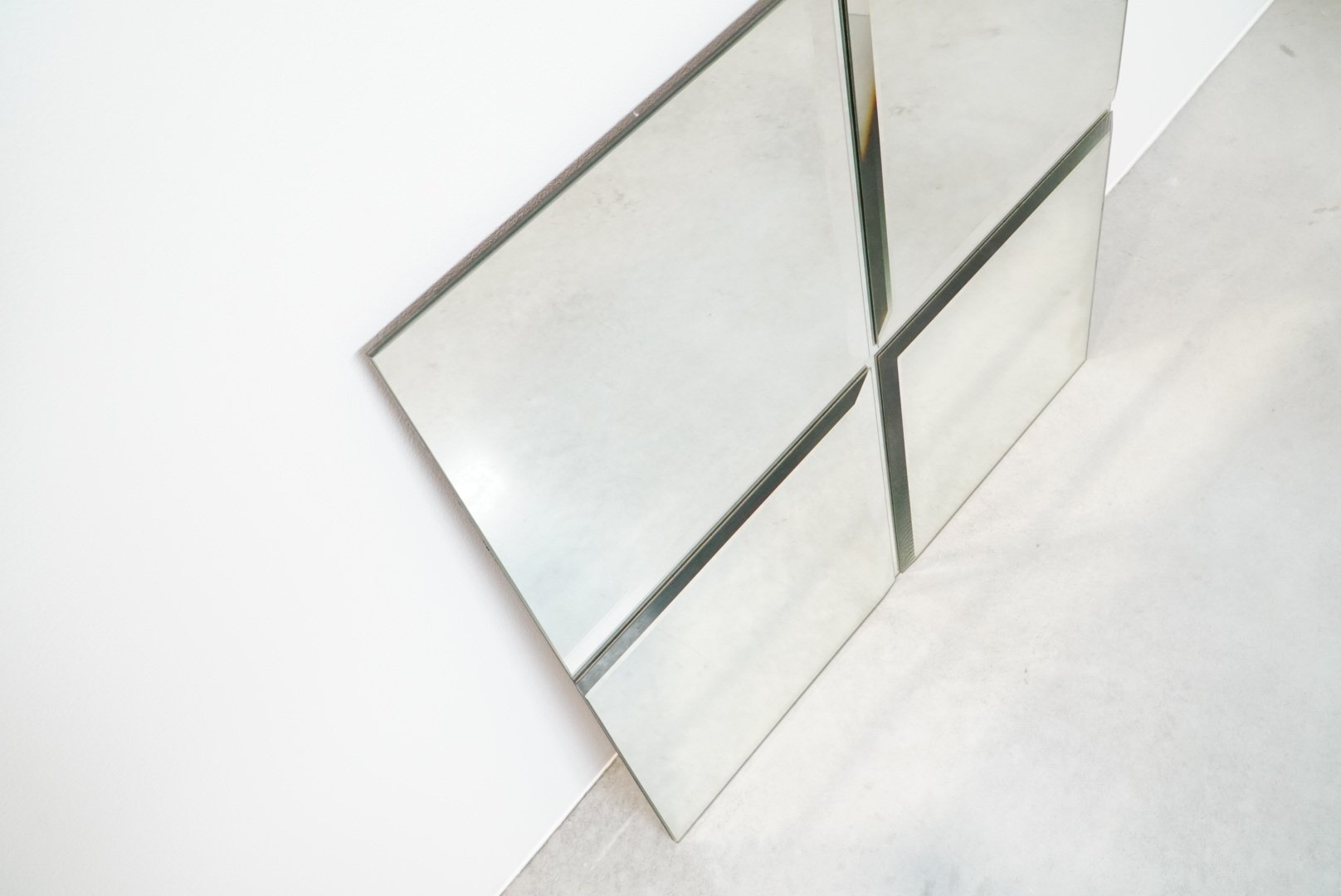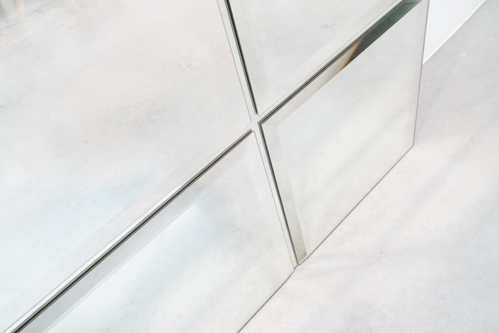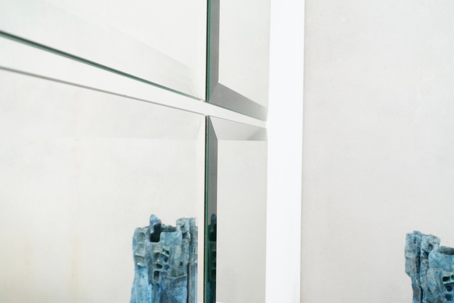 Rare minimalist art mirror by Belgian glass artist Michel Martens, featuring a modern and timeless design that shows his philosophy of mirror art. Martens believed mirrors reflect only a fraction of reality, creating a profound connection with the surrounding space and integrating reflection as a pivotal element of the artwork. Rarely found on the market due to limited production, these high-end niche pieces showcase exceptional quality and craftsmanship.