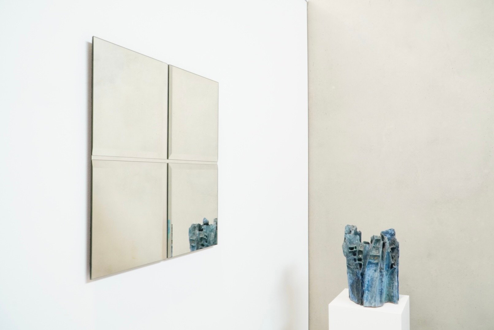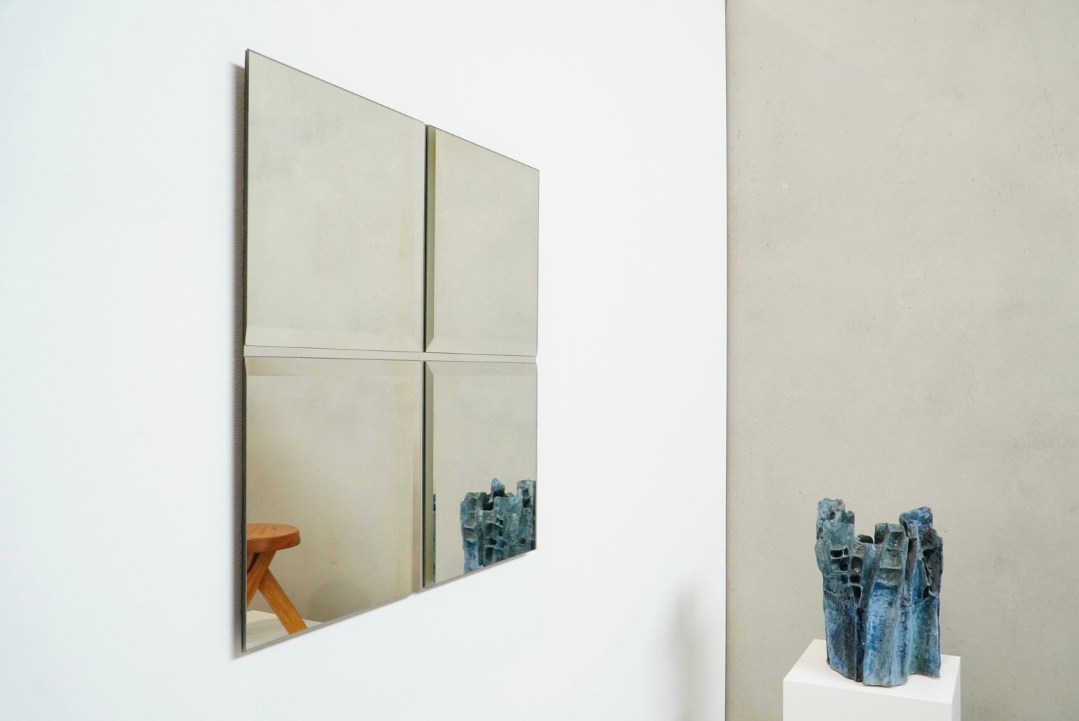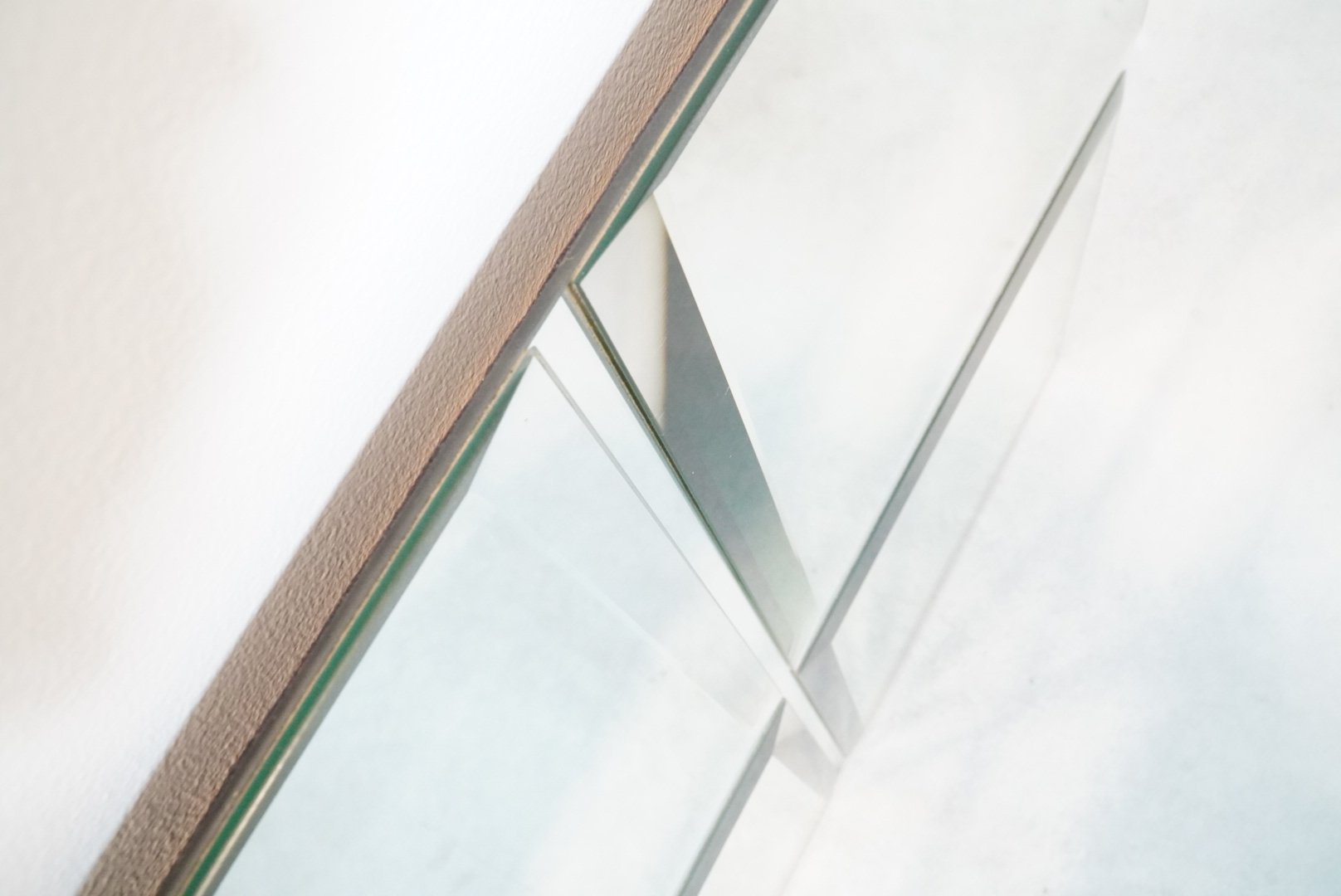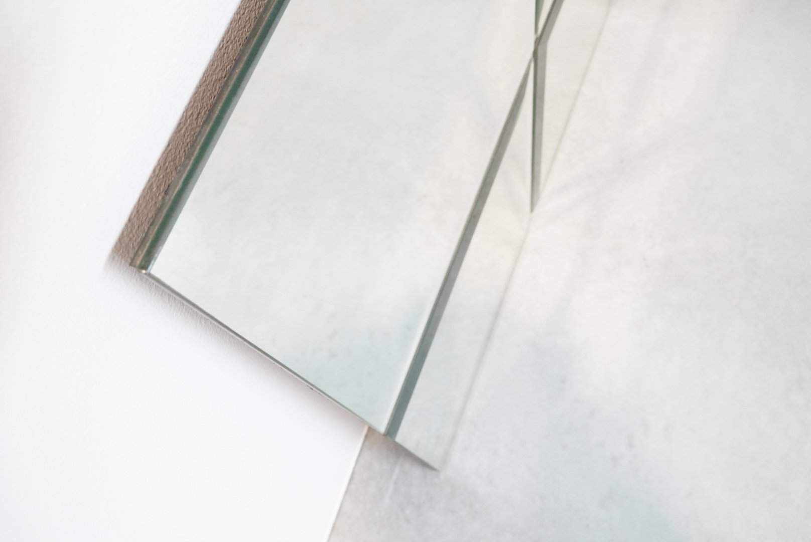 Rare minimalist art mirror by Belgian glass artist Michel Martens, featuring a modern and timeless design that shows his philosophy of mirror art. Martens believed mirrors reflect only a fraction of reality, creating a profound connection with the surrounding space and integrating reflection as a pivotal element of the artwork. Rarely found on the market due to limited production, these high-end niche pieces showcase exceptional quality and craftsmanship.
