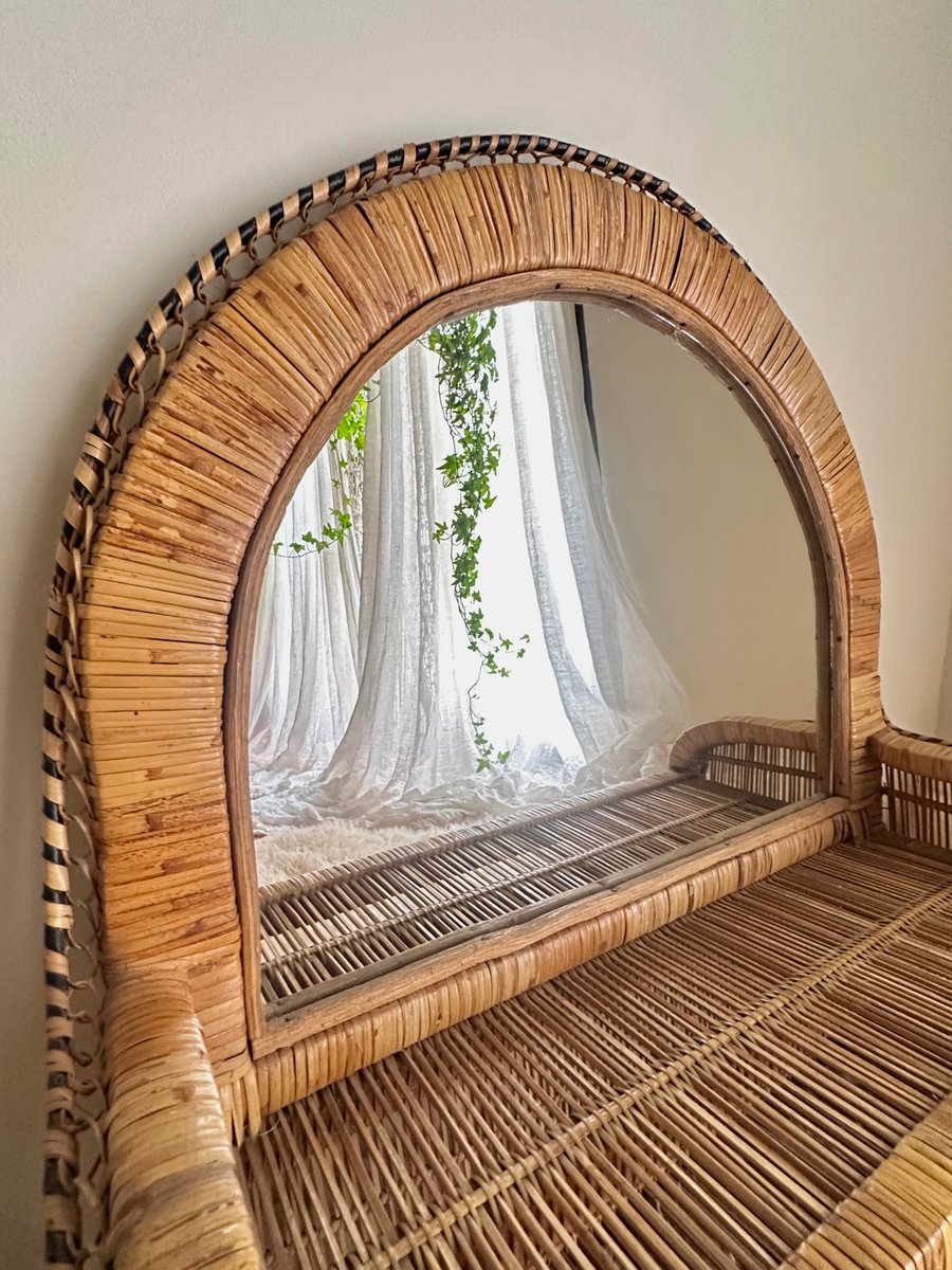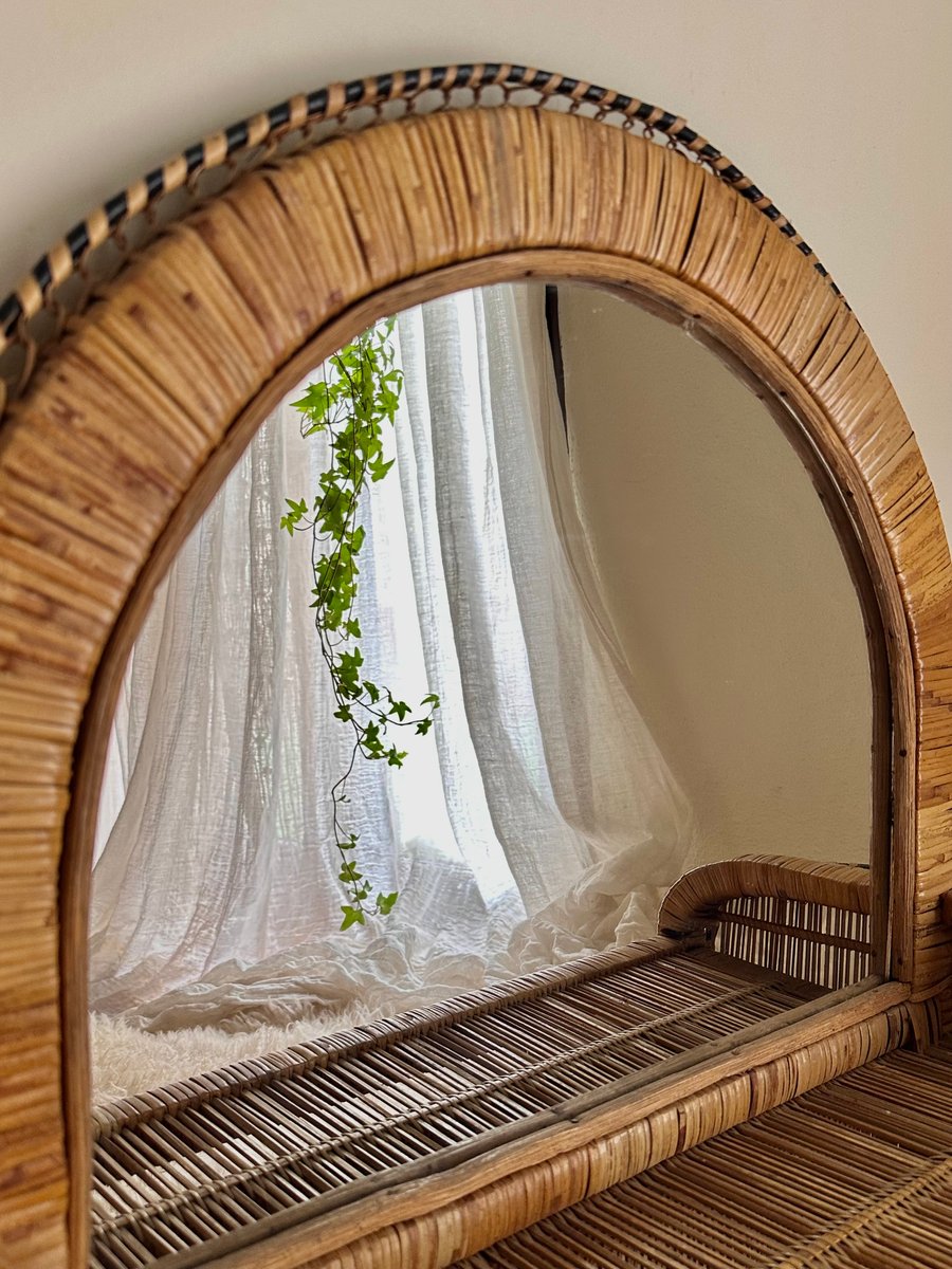 This vintage mid-century mirror shelf is one of the most iconic pieces in woven rattan and wicker design, associated with the Mediterranean style and bohemian aesthetic of the 1960s and 1970s, immortalized in the famous film Emmanuelle.