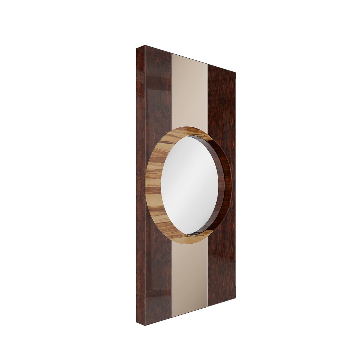 The Elyse Mirror is a modern rectangular wall mirror designed to stand out in any unique interior design project. A big rectangular wood frame with a round mirror at its center, this piece showcases a harmonious blend of rich wood tones arranged in an intricate geometric marquetry pattern. This design infuses the mirror with mid-century modern flair, making it an ideal addition to contemporary interiors.