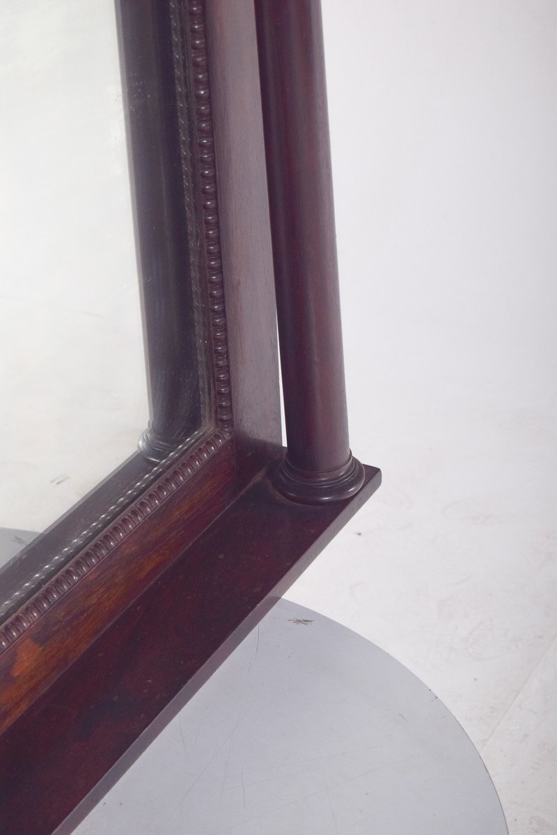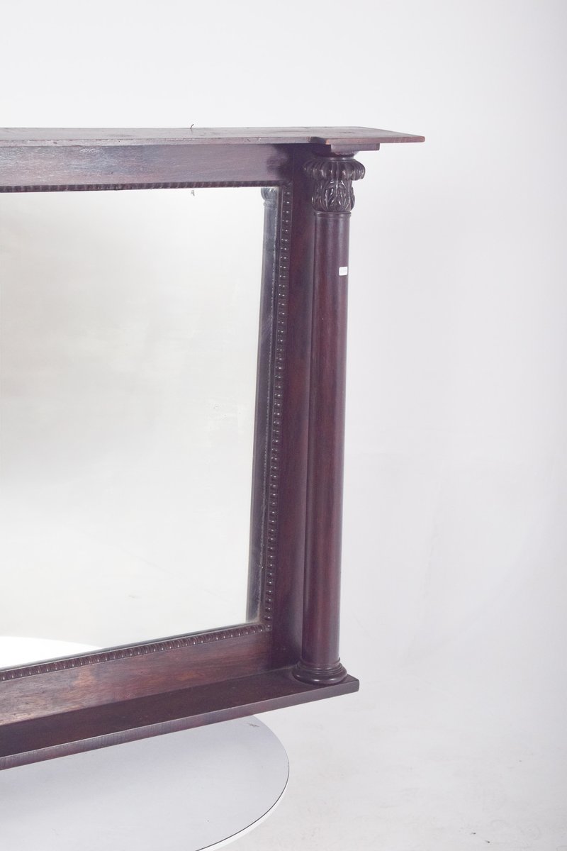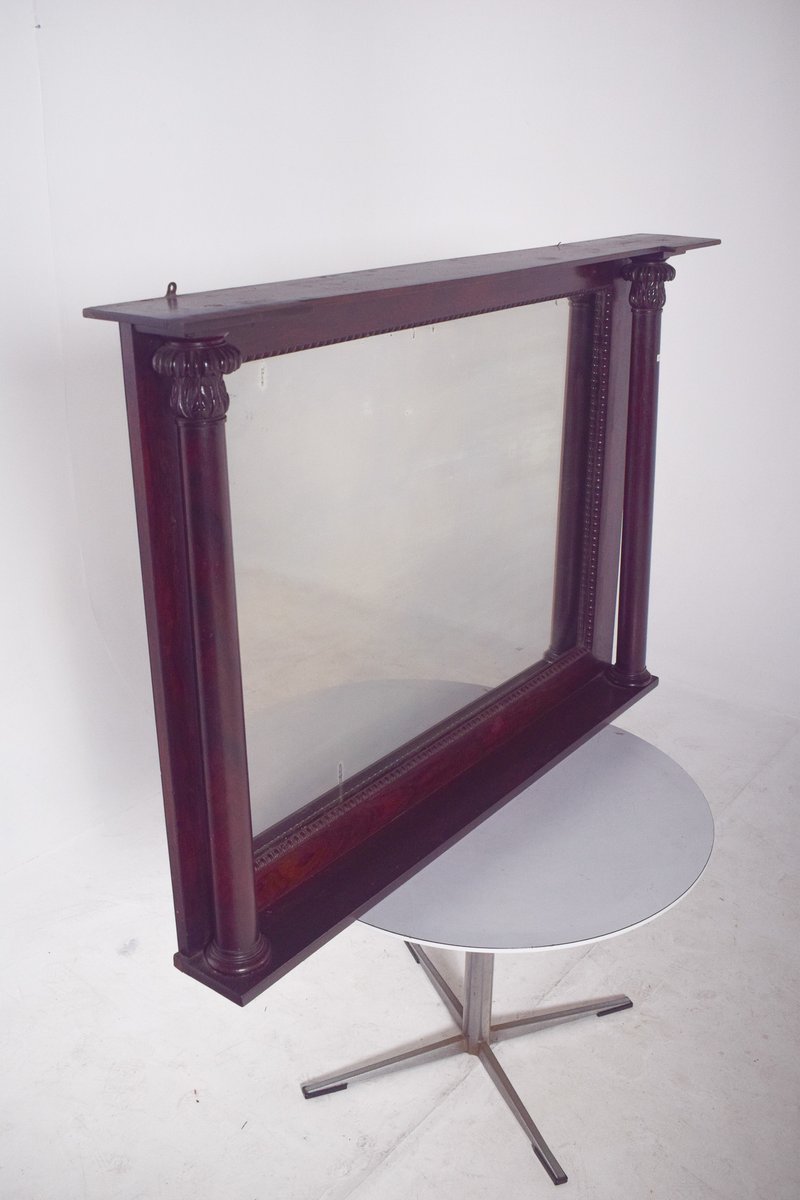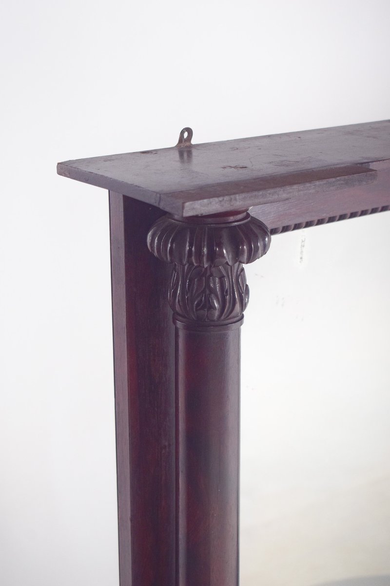 Empire-style rectangular mirror in rosewood. In carved wood, with a robust frame and a striking presence, the structure features two fluted vertical columns on the sides, with decorated capitals, reminiscent of classical architecture. The upper frame is extended, forming a projecting cornice, while the lower base follows the profile, creating visual balance. The mirror has a rectangular shape with straight edges and a slightly weathered surface, which reinforces its antique and authentic character. The wood is dark, with a varnished finish that emphasises the natural veins and with a carved frieze around the inside perimeter that adds to its beauty.