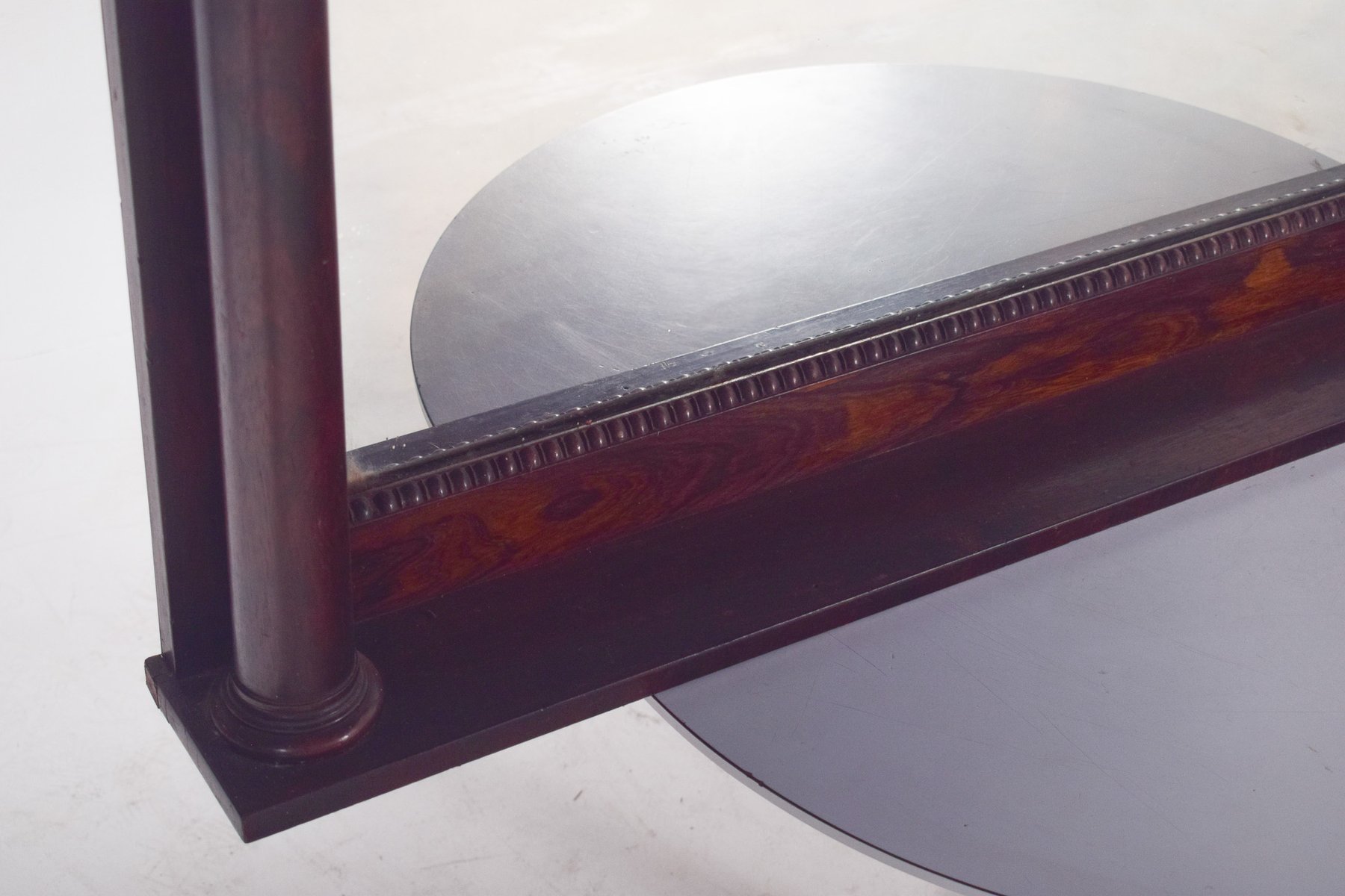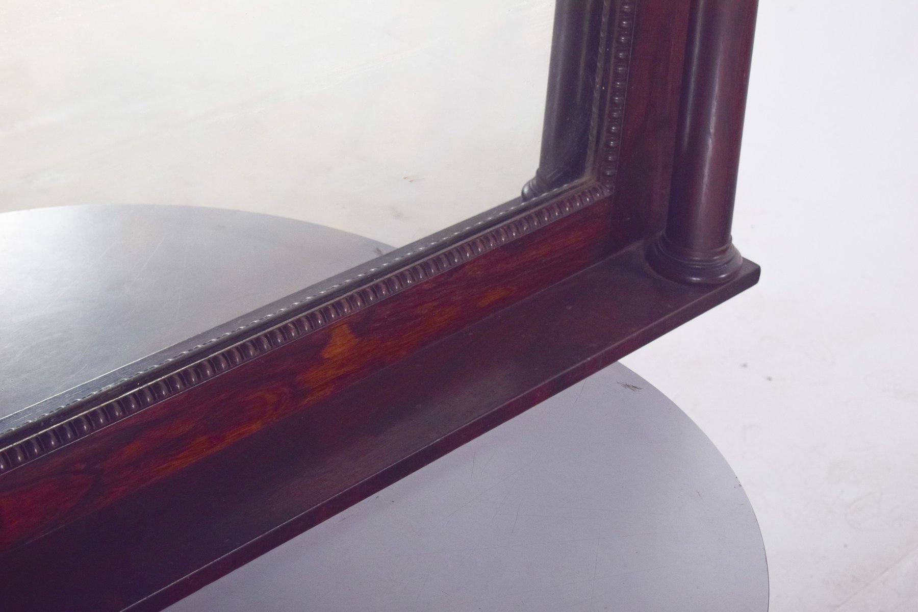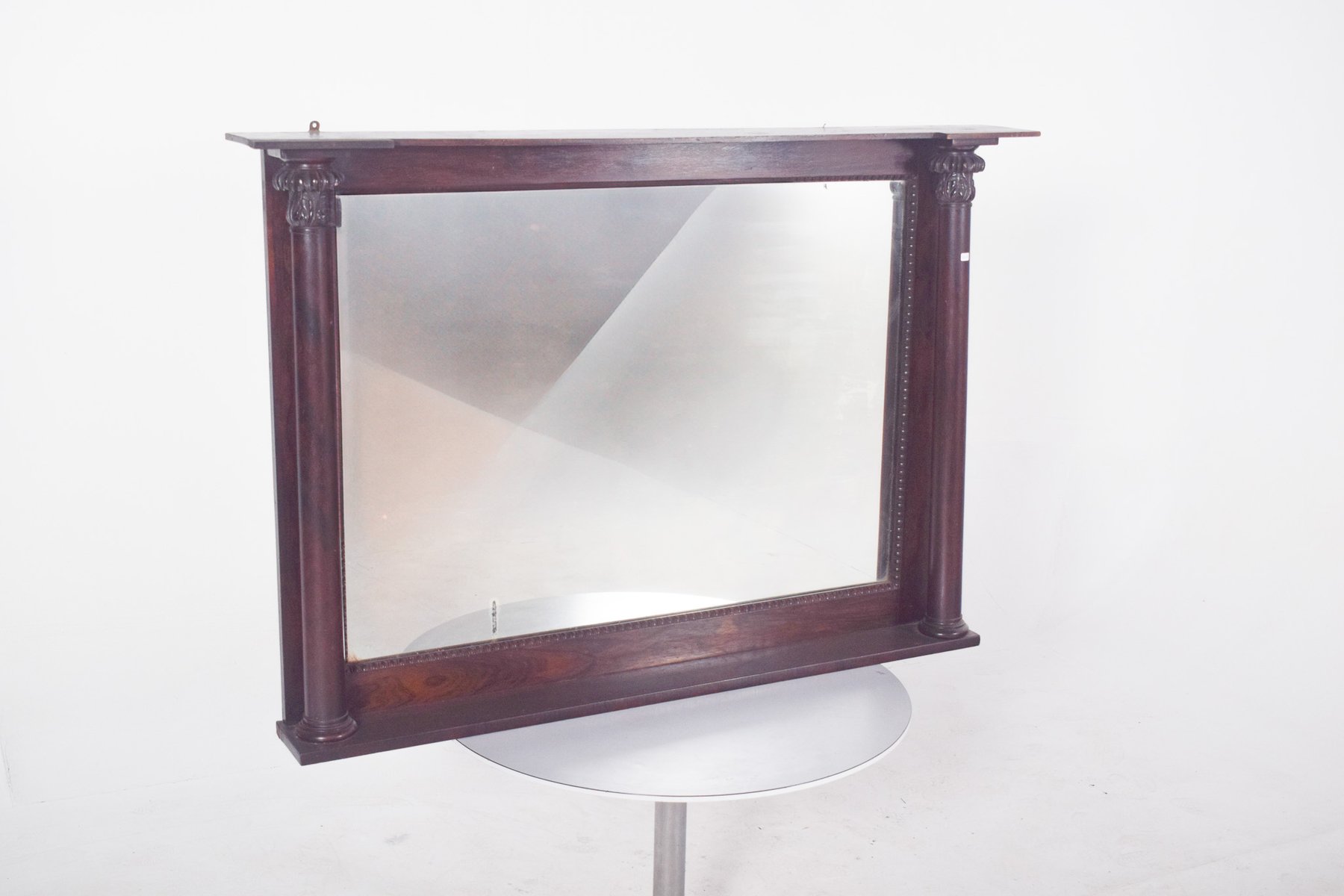 Empire-style rectangular mirror in rosewood. In carved wood, with a robust frame and a striking presence, the structure features two fluted vertical columns on the sides, with decorated capitals, reminiscent of classical architecture. The upper frame is extended, forming a projecting cornice, while the lower base follows the profile, creating visual balance. The mirror has a rectangular shape with straight edges and a slightly weathered surface, which reinforces its antique and authentic character. The wood is dark, with a varnished finish that emphasises the natural veins and with a carved frieze around the inside perimeter that adds to its beauty.