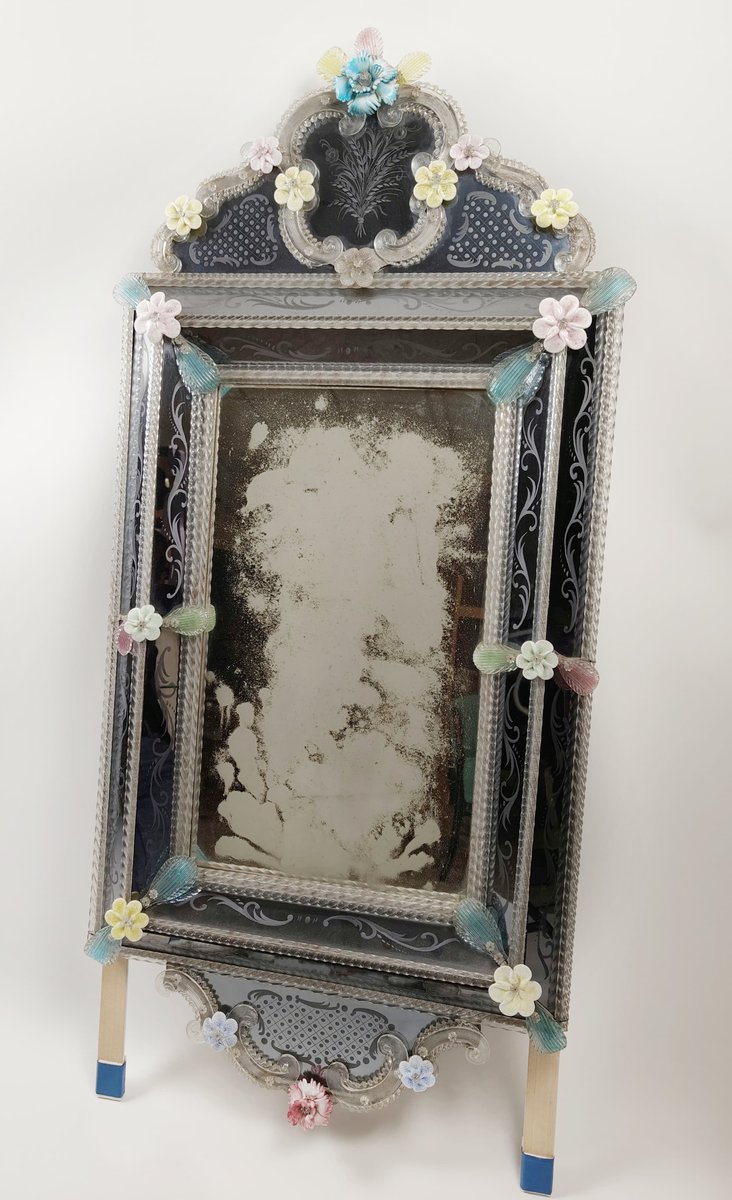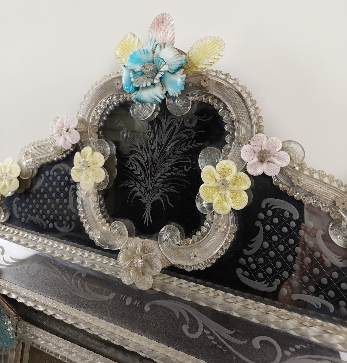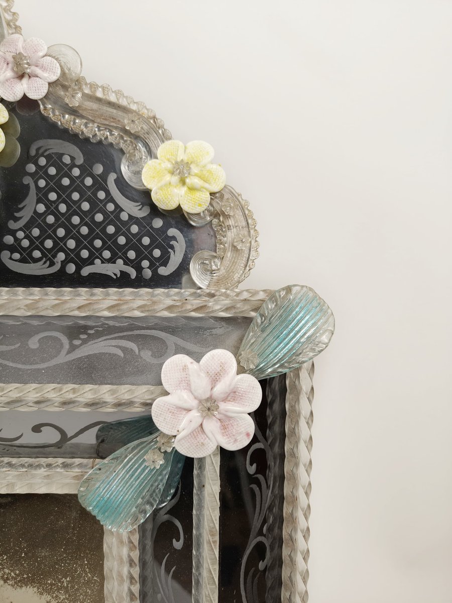 A mirror made around the 1950s in Murano glass, with decorative floral applications, also in Murano glass, of different colours. In the frame there is a further engraved floral decoration.