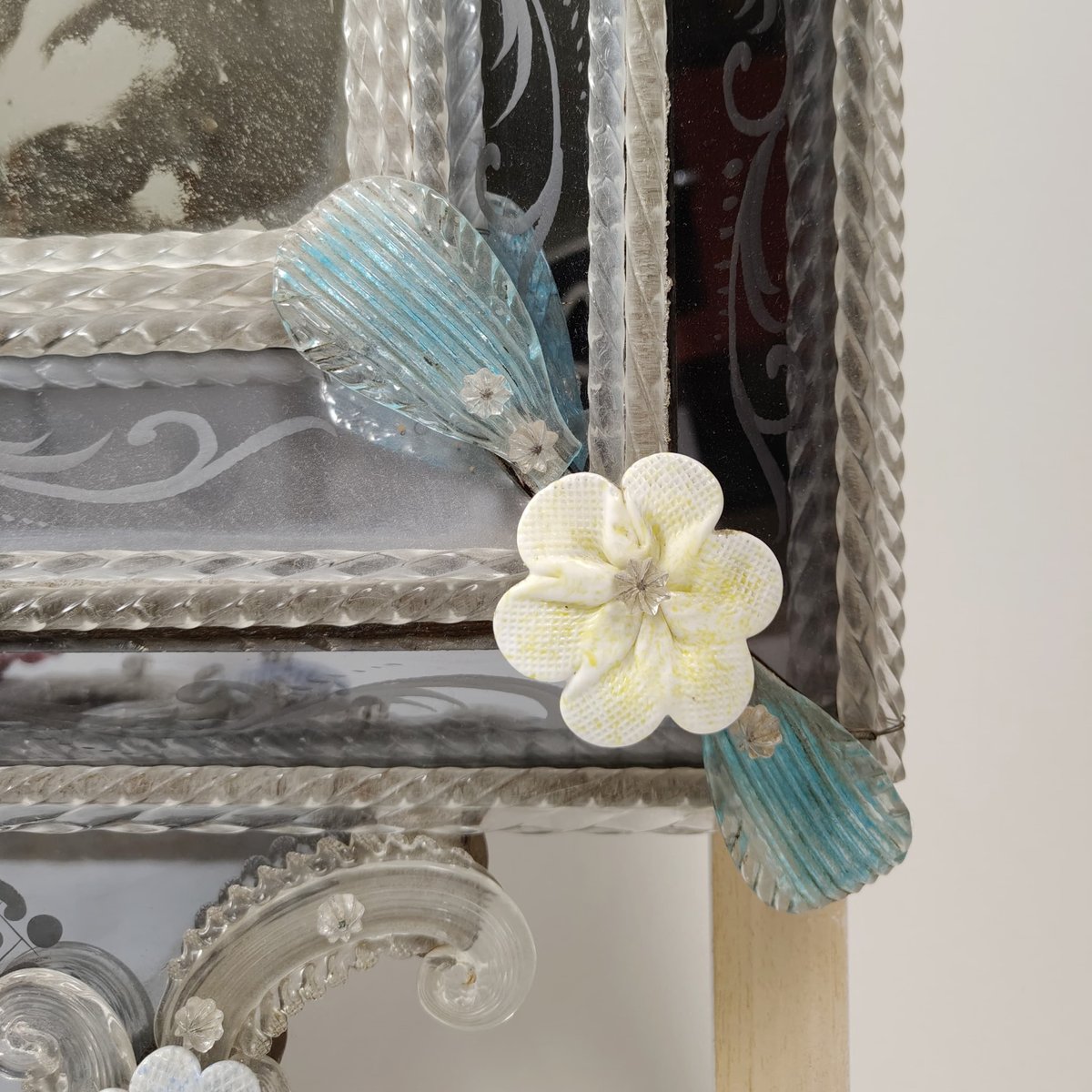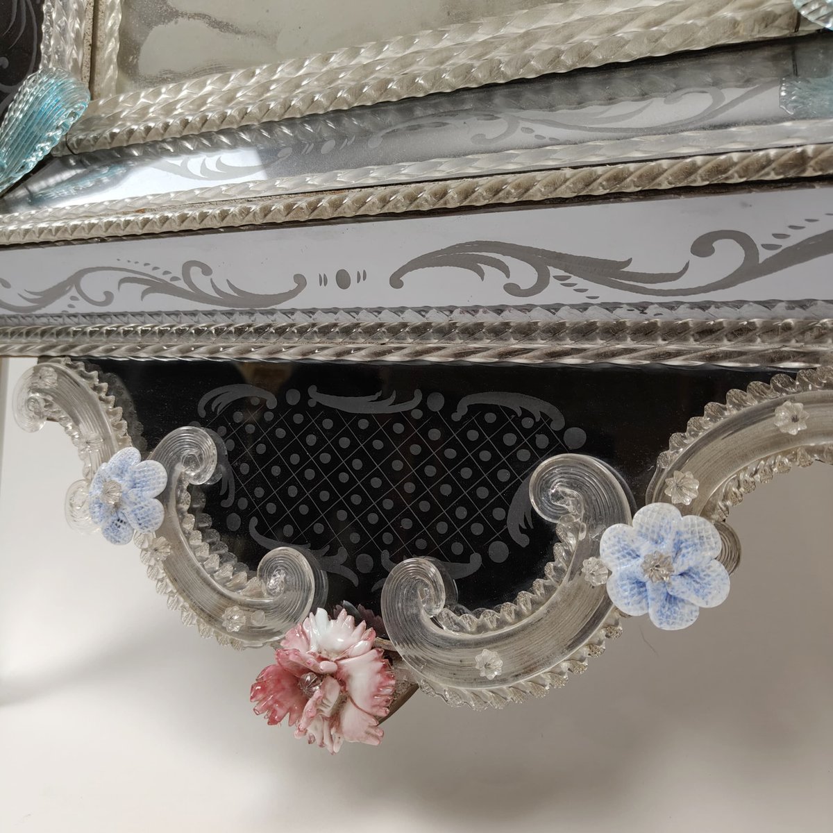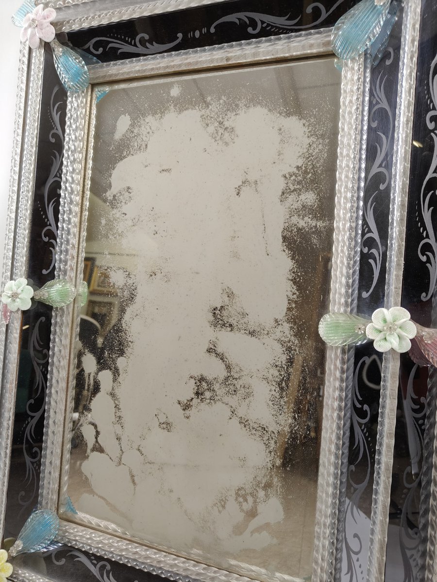 A mirror made around the 1950s in Murano glass, with decorative floral applications, also in Murano glass, of different colours. In the frame there is a further engraved floral decoration.