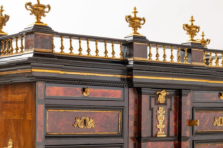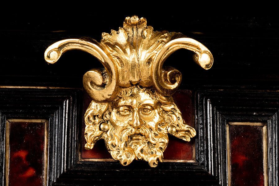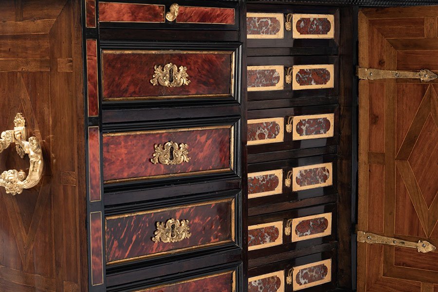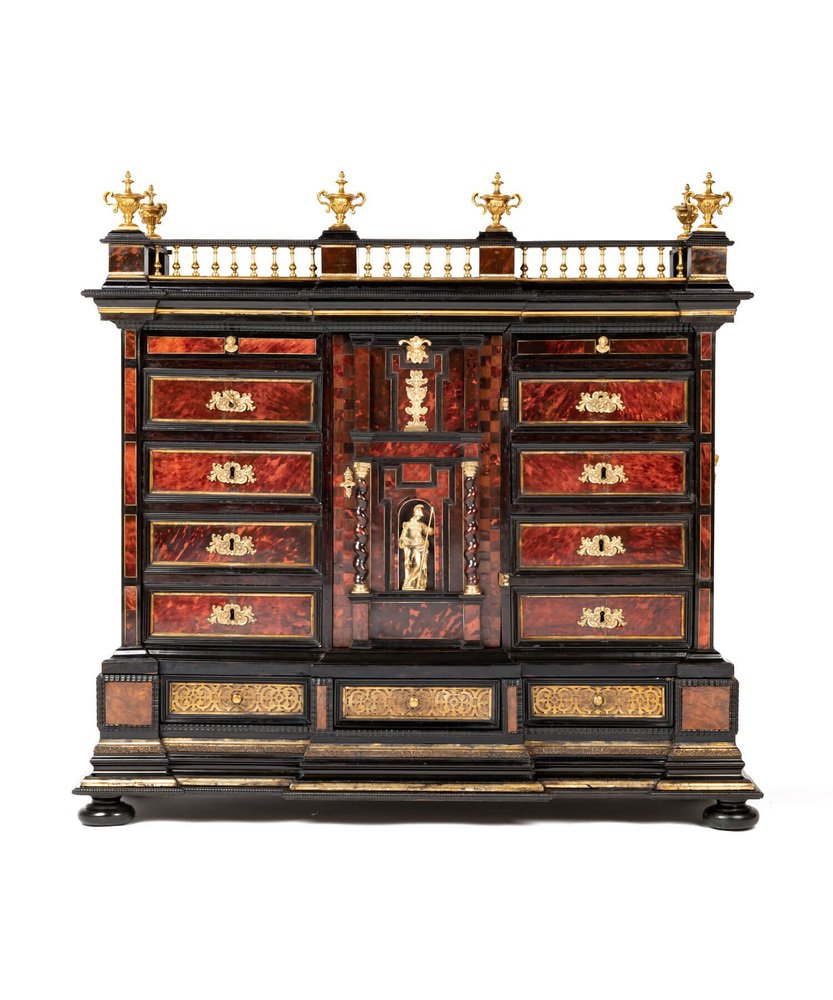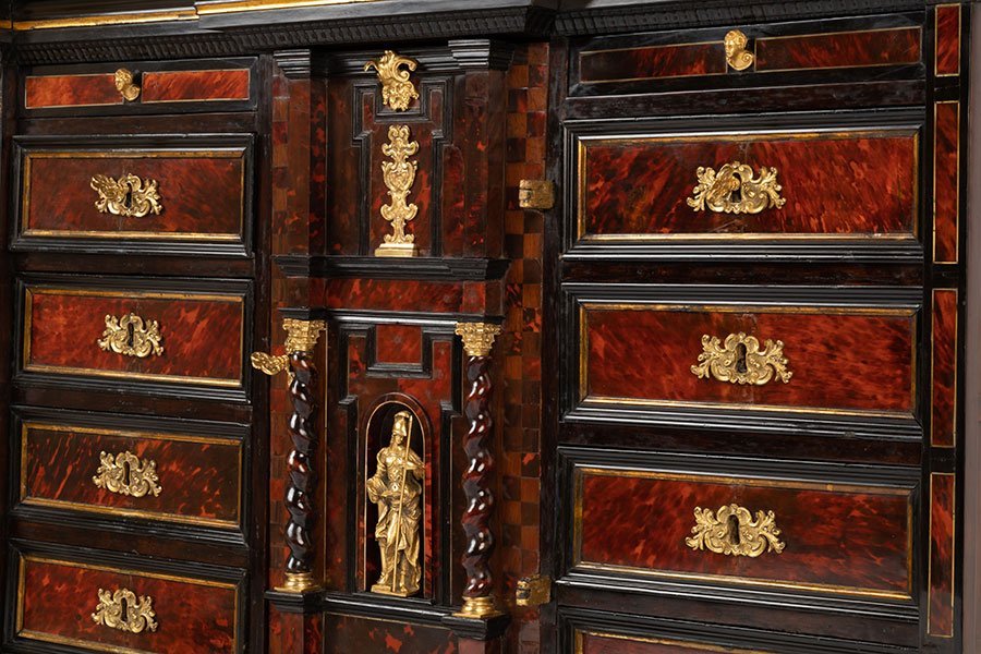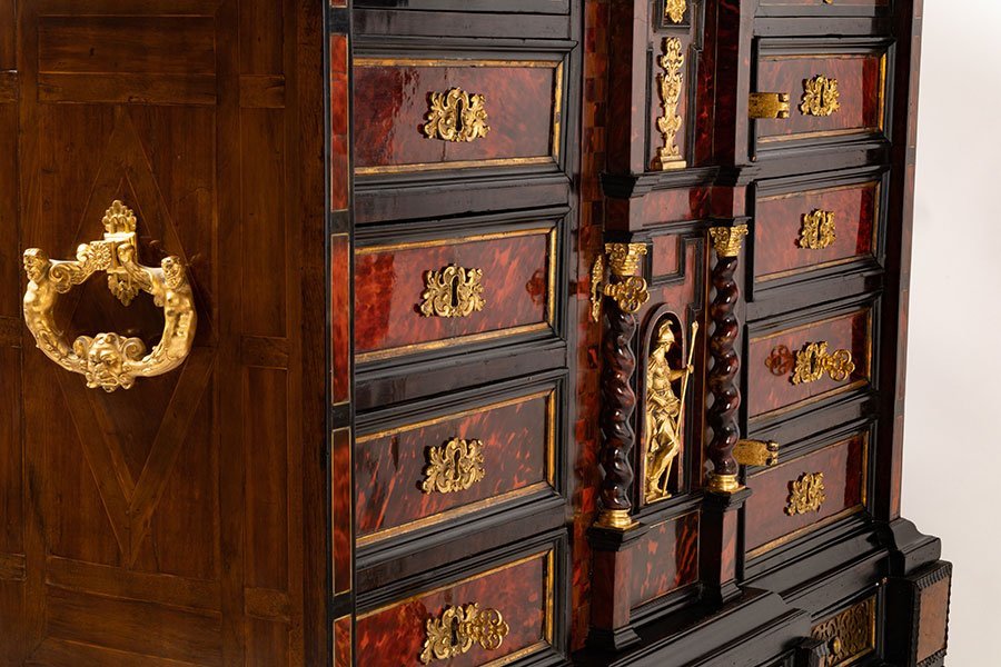 The overall quality of the cabinet is high, evident in the complexity of its internal organisation, the presence of marble-fronted internal drawers, and the careful execution of the gilt bronze mounts. The strong architectural structure and decorative vocabulary firmly place this monetiere within the tradition of 17th-century Neapolitan cabinetmaking.