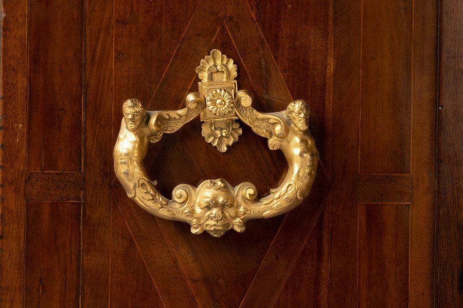 The façade is organised around a central aedicule-form door, articulated by two spiral columns framing a niche with a figure of the goddess Athena, surmounted by a gilt bronze representation of Zeus. On either side of the door are five drawers, the upper drawer on each side divided into two compartments.