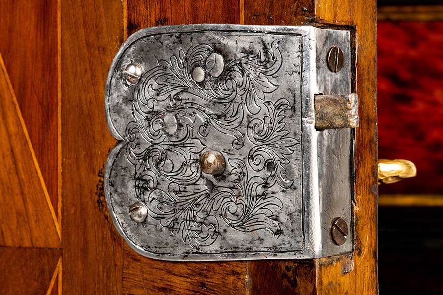 The door is equipped with a finely engraved iron lock decorated with floral motifs.