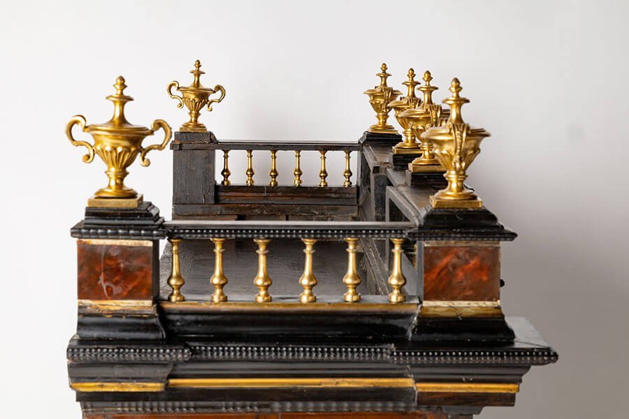 Collector’s cabinet, known as a monetiere, of architectural conception, attributable to Neapolitan cabinetmaking of the 17th century and conceived for the storage of coins, medals and small precious objects.