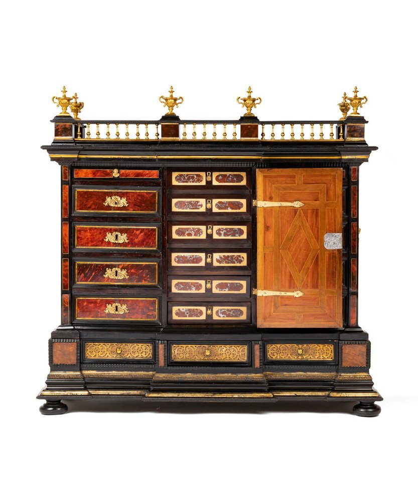 La porte est équipée d'une serrure en fer finement gravée et décorée de motifs floraux. Le cabinet est construit avec des profilés et des éléments d'encadrement en ébène et est enrichi de montures en bronze doré de haute qualité, utilisées à des fins décoratives et fonctionnelles. Les façades et les panneaux des tiroirs sont plaqués d'un placage sombre marbré, utilisé à des fins décoratives pour contraster avec la structure en ébène.