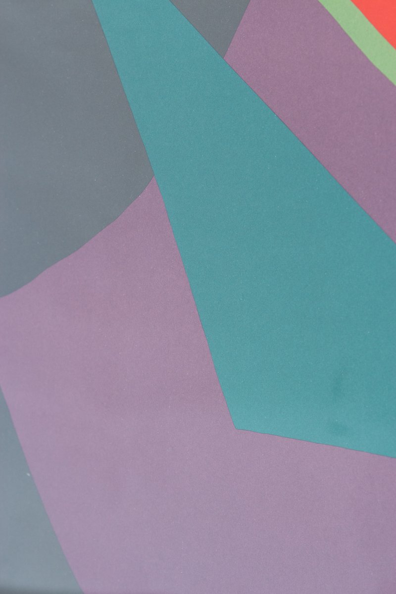 The graphics are composed vertically. It presents abstract, colorful, geometric forms scattered on a dark gray, almost black background. The forms look like multi-colored scraps of fabric, superimposed on each other. The zones collide and contrast with each other.