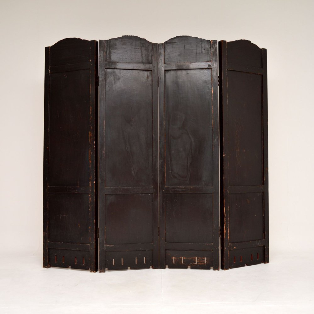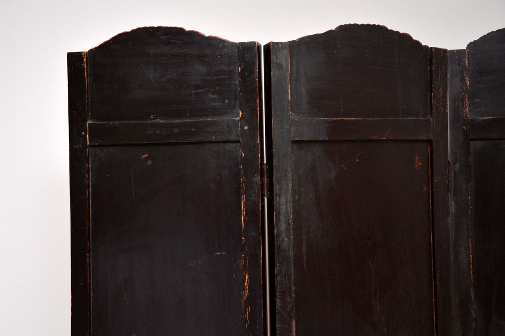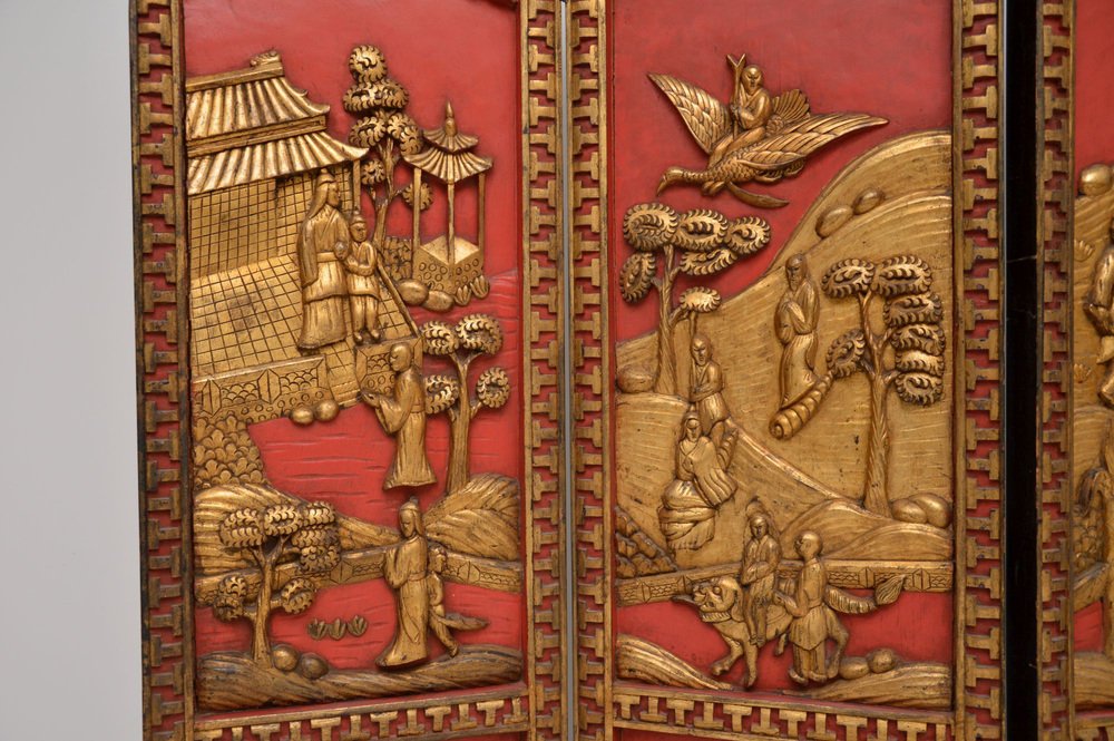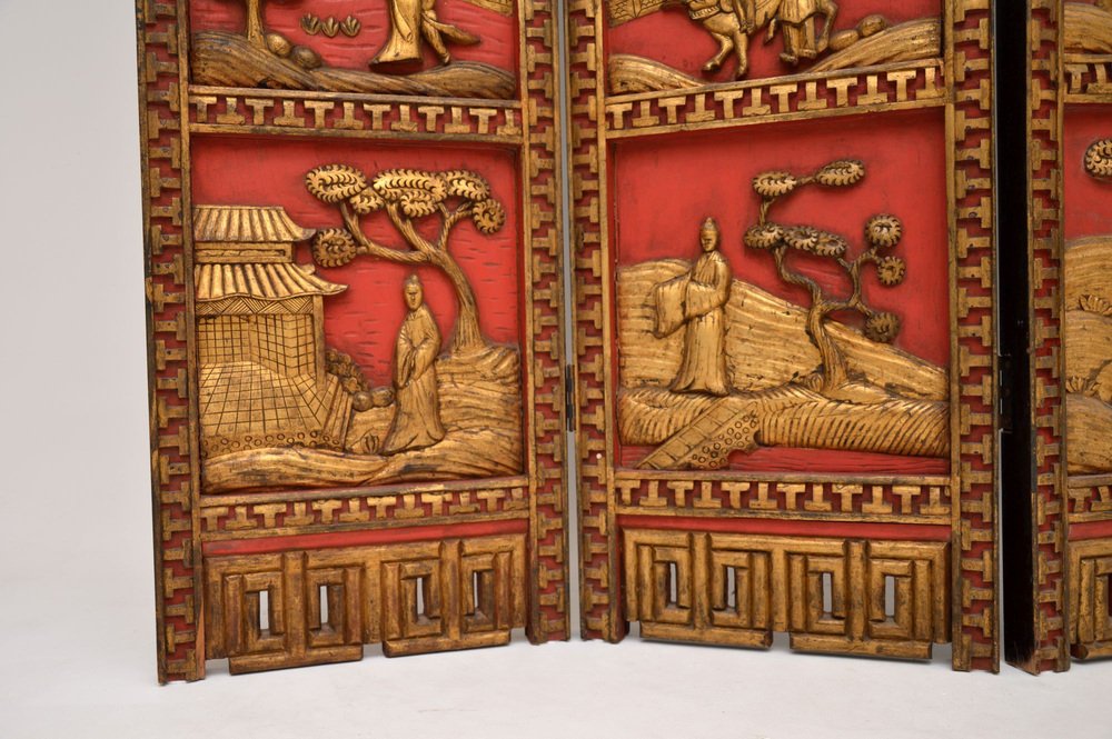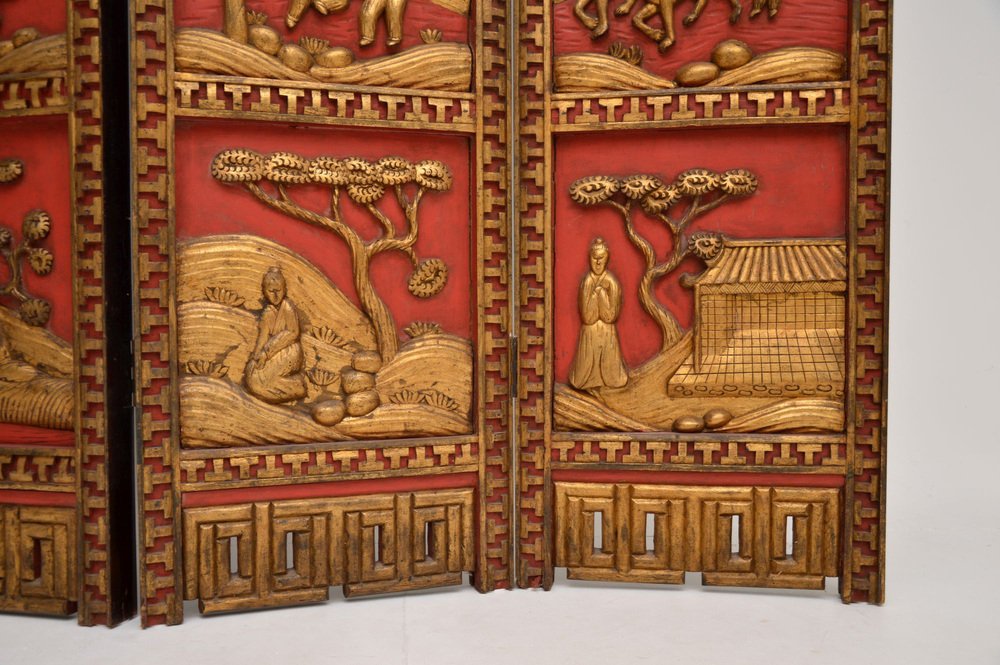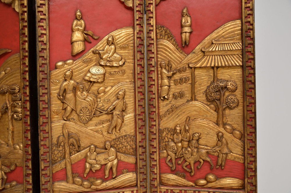 A stunning antique lacquered & gilt oriental folding screen / room divider in carved lacquered & gilded wood. This was made in East Asia, possibly China or Japan, it dates from the early 20th century around 1900-1920, or possibly a bit earlier.