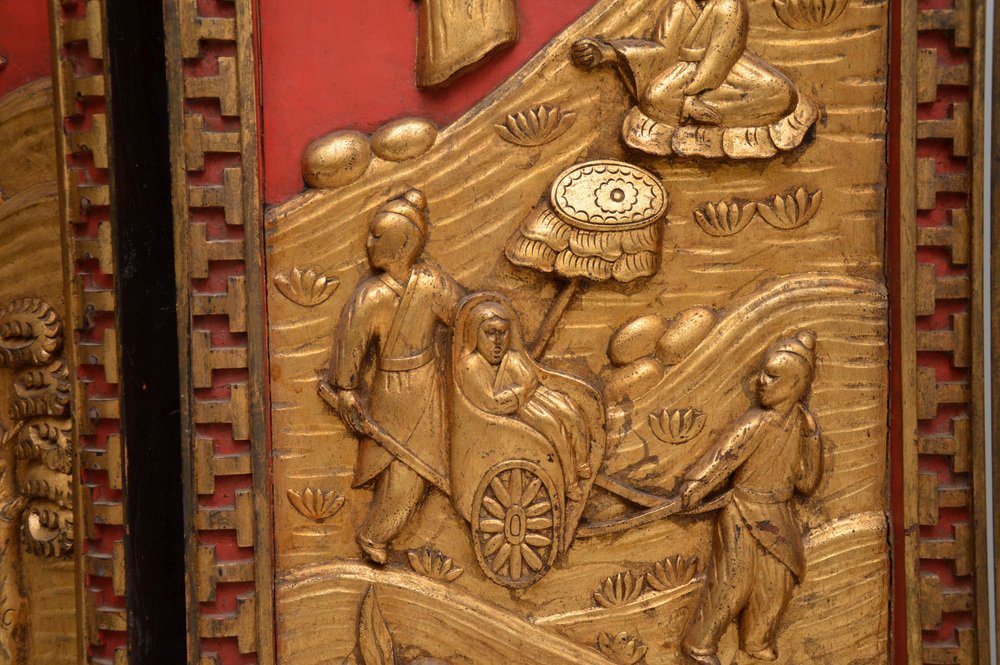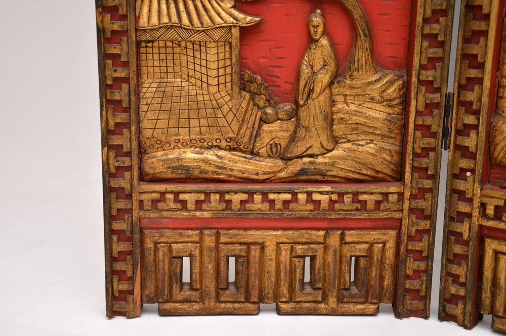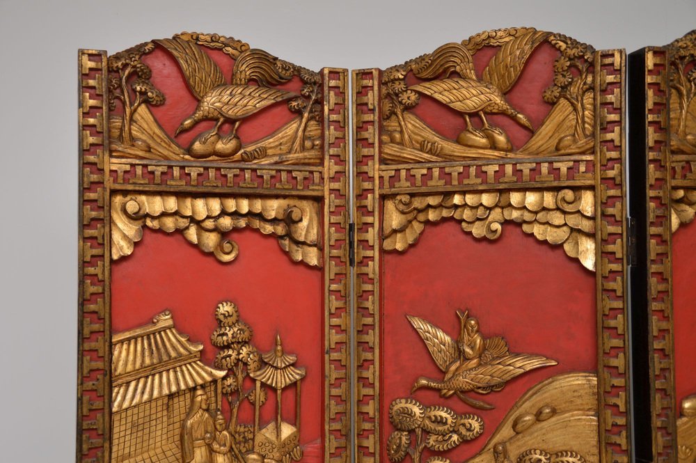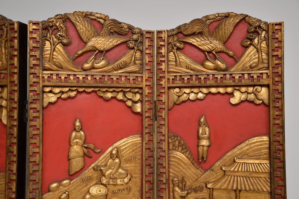 Superbe paravent oriental ancien laqué et doré / séparateur de pièce en bois sculpté laqué et doré. Fabriqué en Asie de l'Est, probablement en Chine ou au Japon, il date du début du 20e siècle, vers 1900-1920, ou peut-être un peu plus tôt.