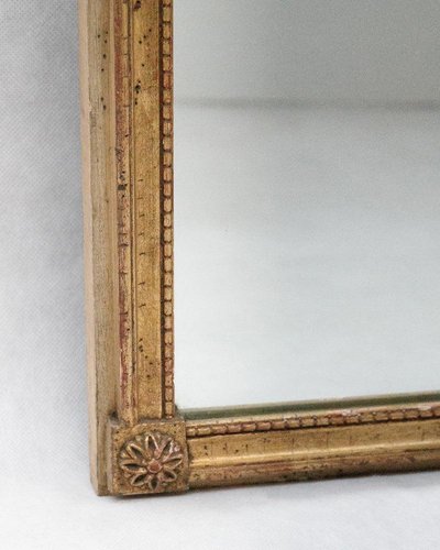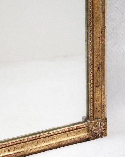 Fabriqué vers 1880, le cadre en bois doré est enrichi de fins détails en gesso et recouvert d'une feuille d'or qui s'est magnifiquement patinée au fil du temps. La surface porte les traces douces du temps que l'on espère trouver, de petites imperfections qui ne sont pas tant des défauts que des preuves d'une vie bien remplie. Le miroir d'origine est en excellent état, avec seulement quelques légères marques qui témoignent de ses origines du XIXe siècle. Ce modèle Louis XVI privilégie la sobriété. Des lignes épurées, des proportions équilibrées, des ornements décoratifs placés avec intention. Le résultat est intemporel, mais discrètement moderne. PS : Cette légère rayure que vous voyez sur la photo ? Il s'agit simplement du reflet de notre panneau photographique, et non du fantôme d'un miroir disparu. Dimensions : H 56 cm x L 46 cm Matériaux et techniques : Verre, gesso et bois Provenance : France Période : XIXe siècle