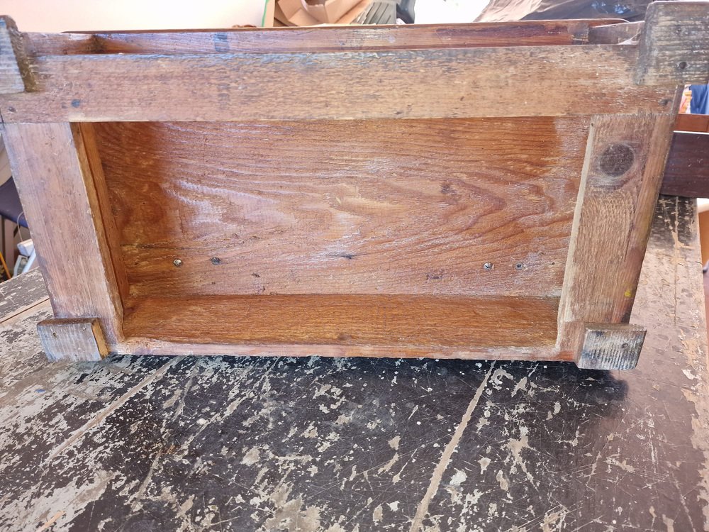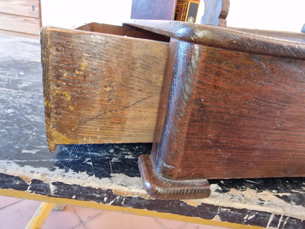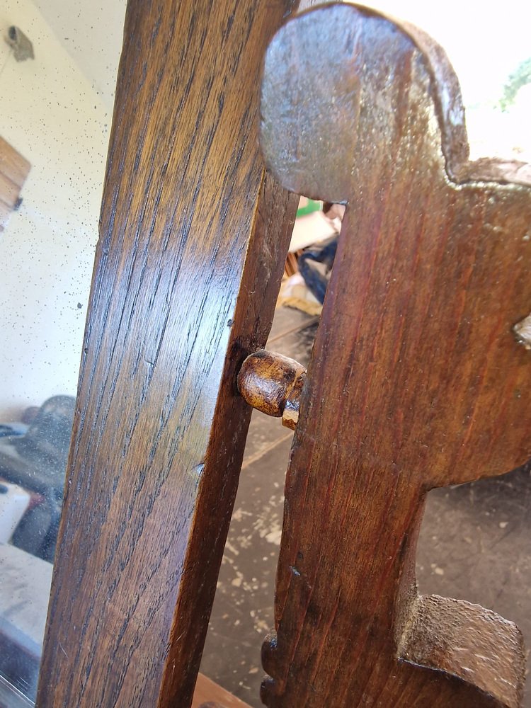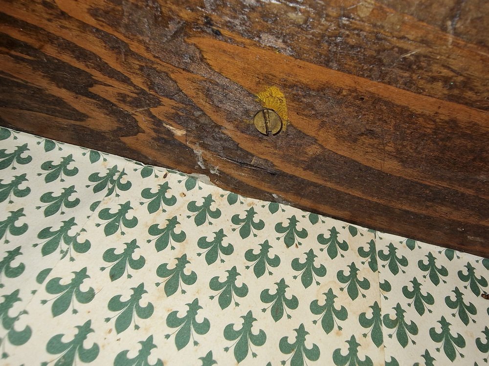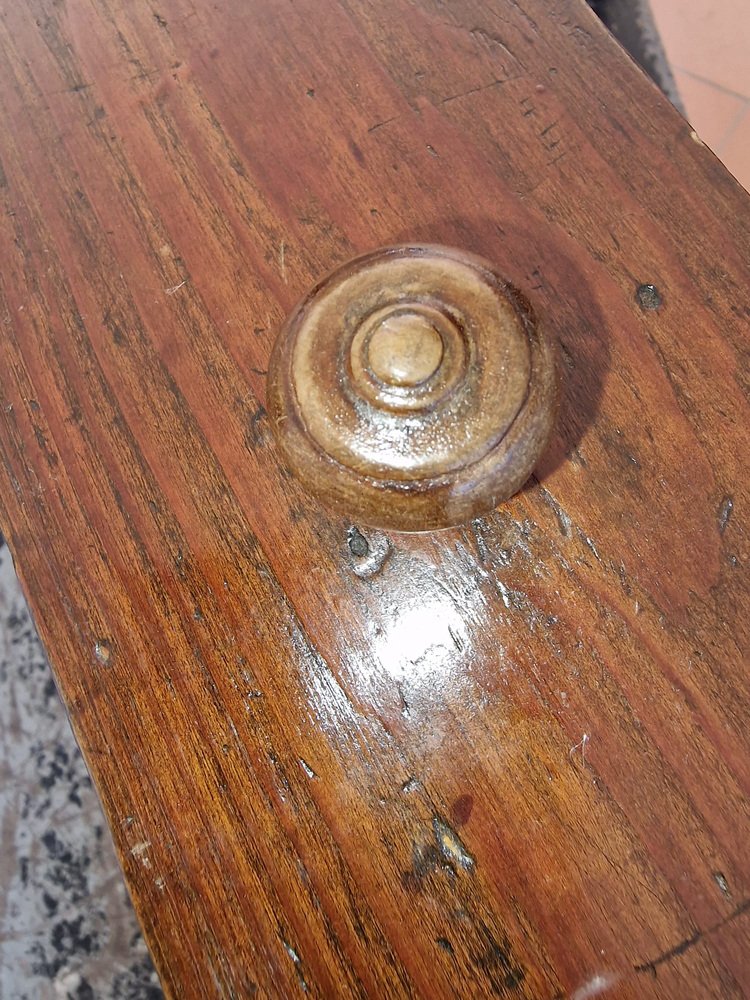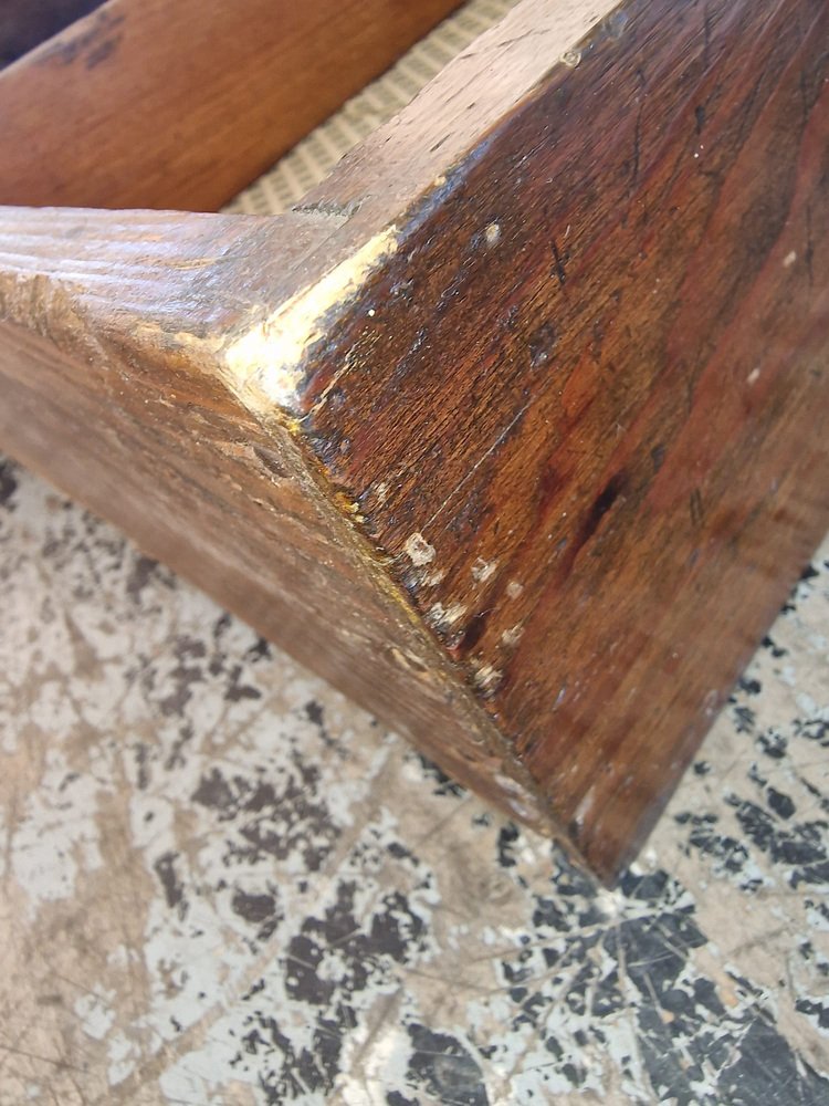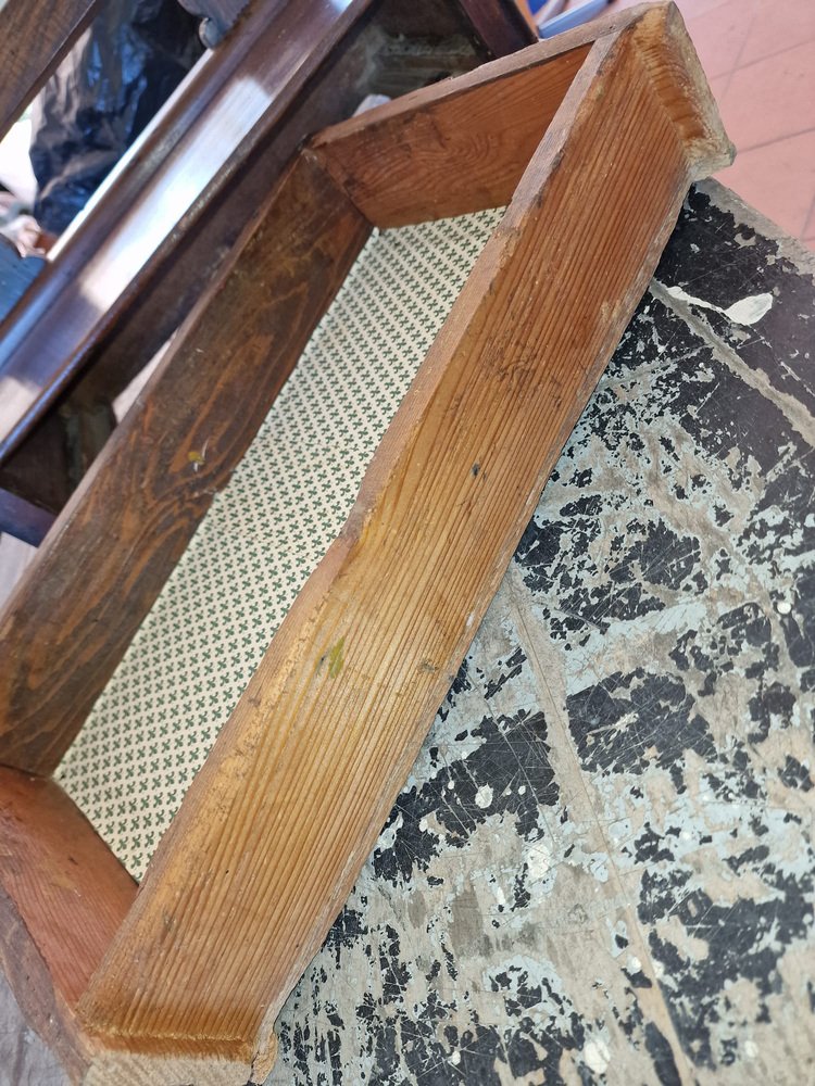 Petite coiffeuse en noyer, généralement offerte en dot à la mariée pour meubler sa chambre à coucher. Le miroir en pied inclinable est d'origine et intact, avec une belle patine d'époque. Le tiroir est tapissé du papier d'origine, avec des motifs de lys florentins. Cette petite coiffeuse a appartenu à ma famille, d'abord à ma grand-mère, puis à ma mère, et enfin à moi. Elle ne correspond plus à notre décor, et en accord avec ma mère, nous souhaitons qu'elle trouve un nouveau foyer où elle sera appréciée. Pas de restauration. Seulement traité contre les mites.