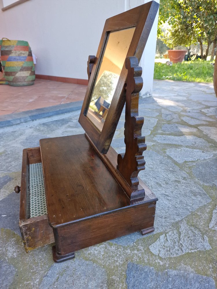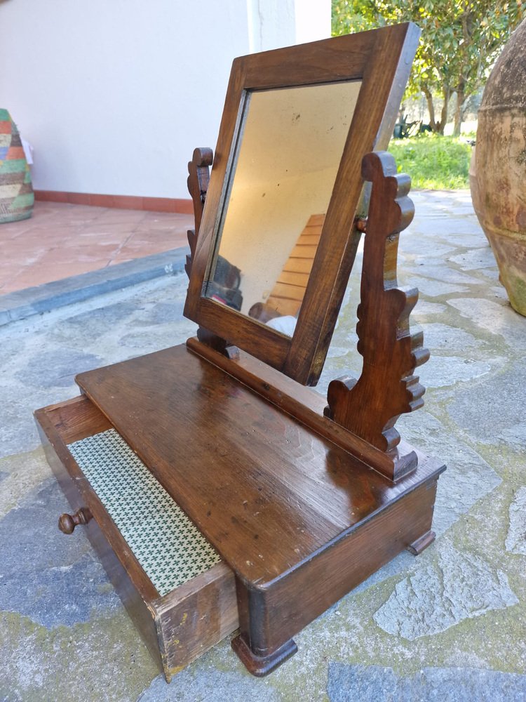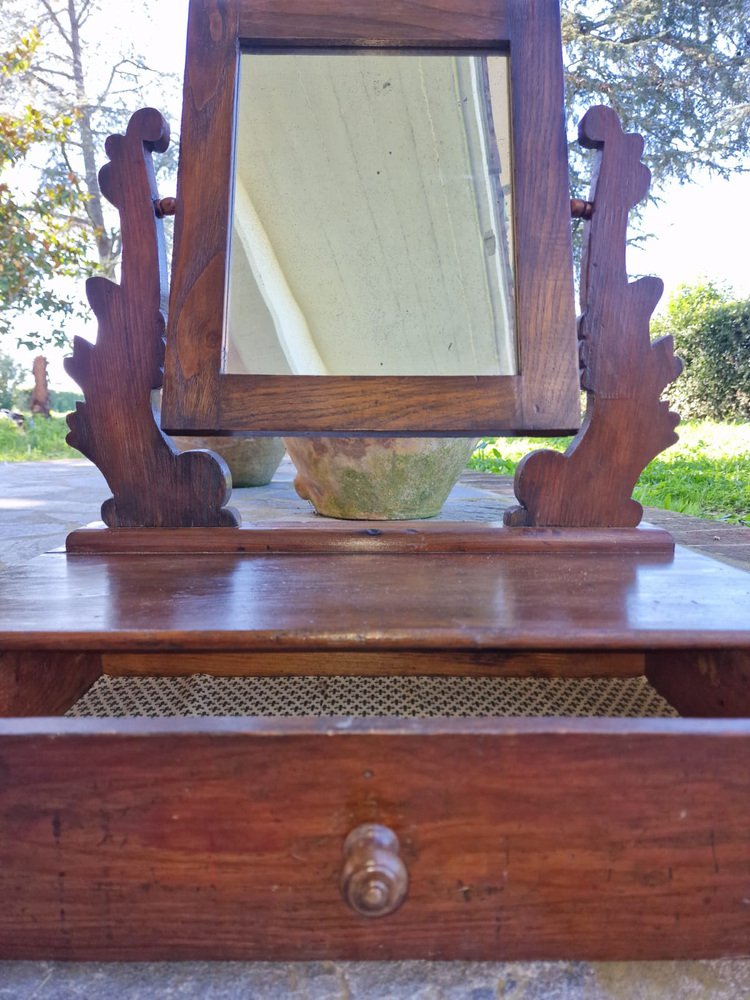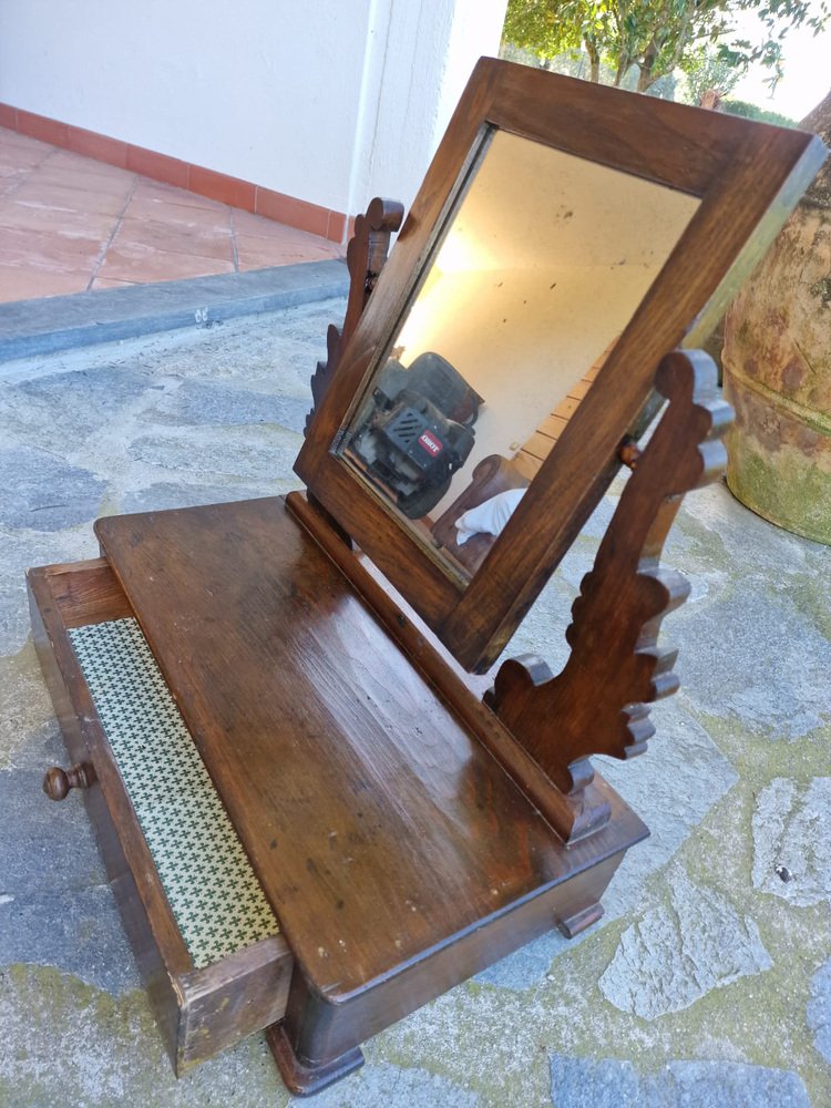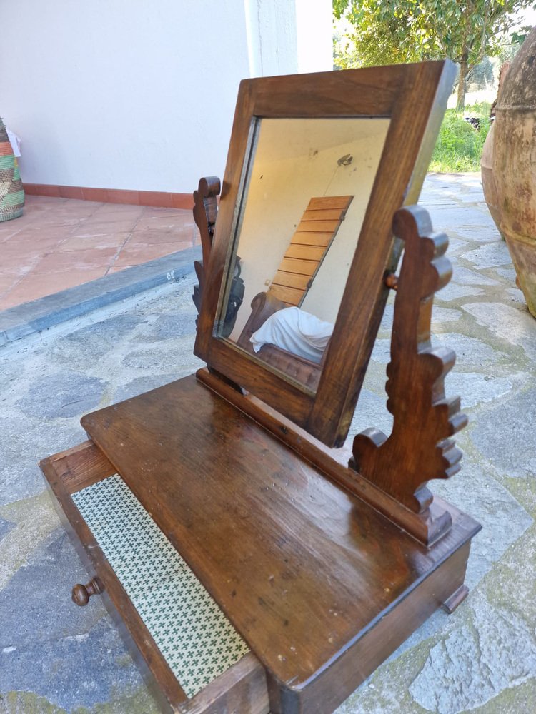 Small walnut dressing table, typically given as part of a bride's dowry to furnish the bedroom. The tilting full-length mirror is original and intact, with a beautiful vintage patina. The drawer is lined with the original paper, featuring Florentine lily motifs. This small dressing table belonged to my family, first to my grandmother, then to my mother, and then to me. It no longer fits in with our décor, and in agreement with my mother, we want it to find a new home where it will be appreciated. No restoration. Only treated for moths.
