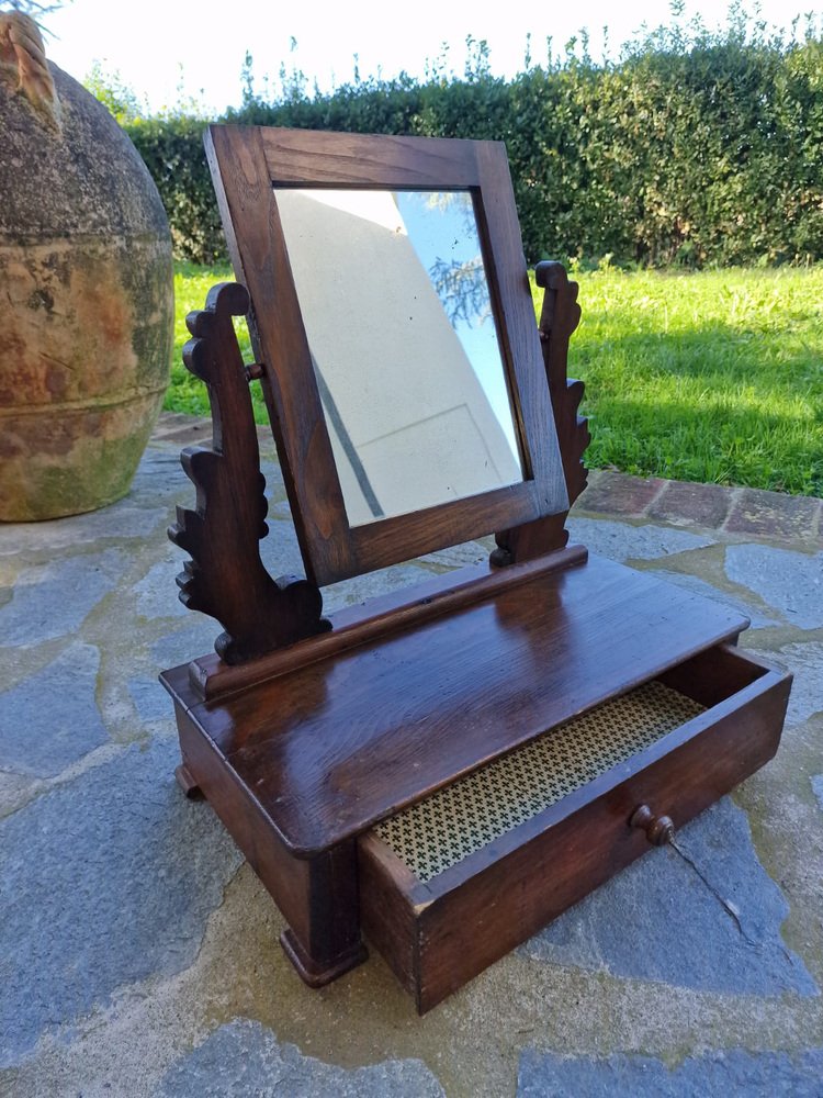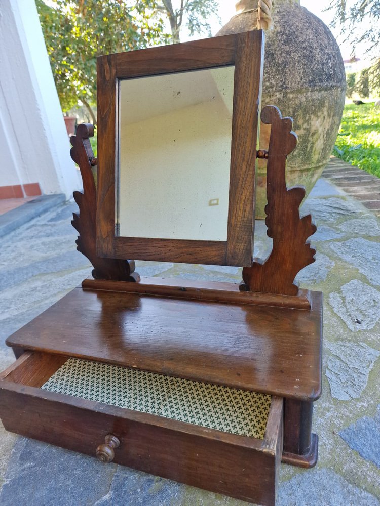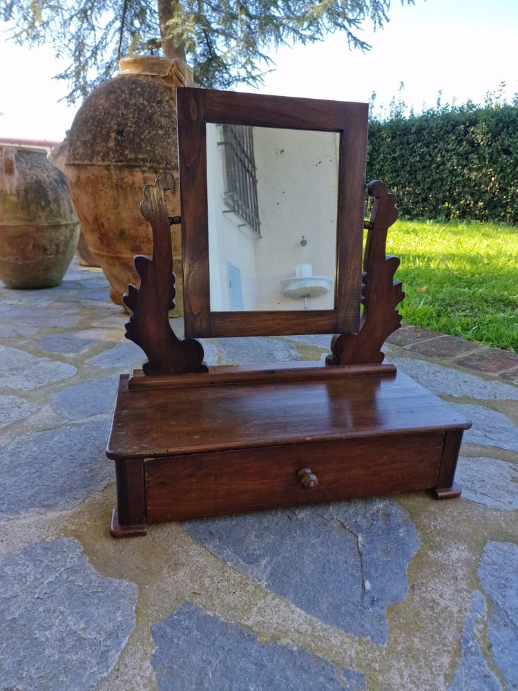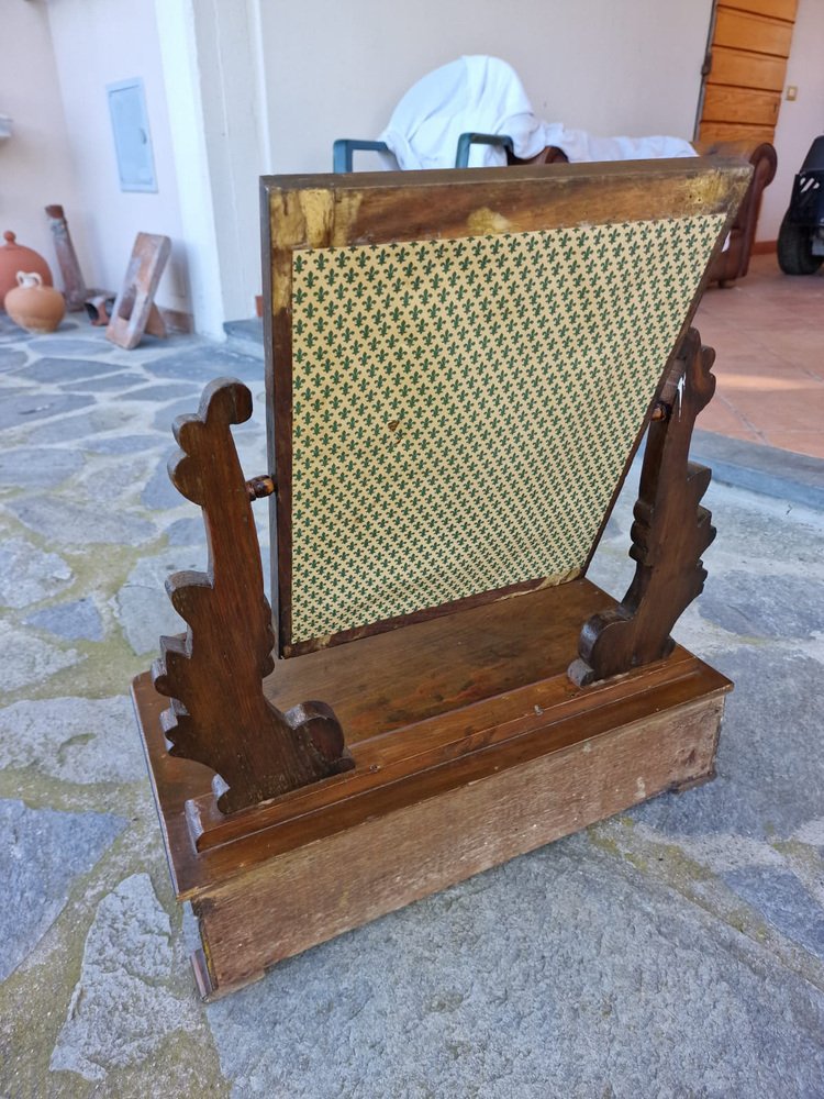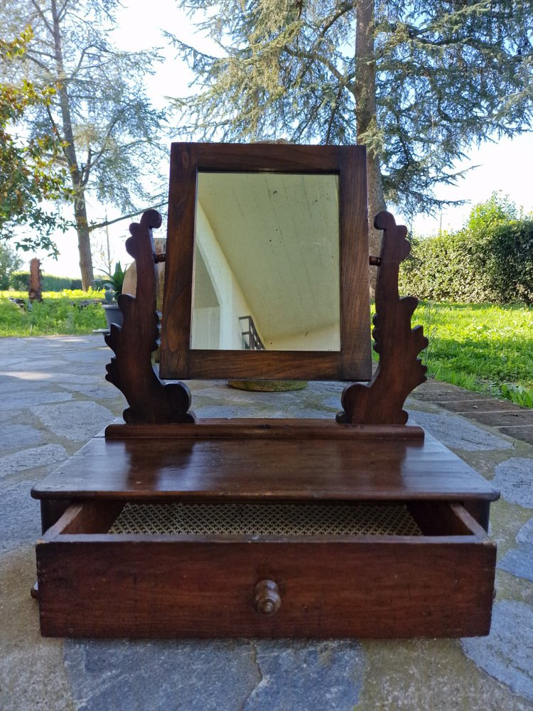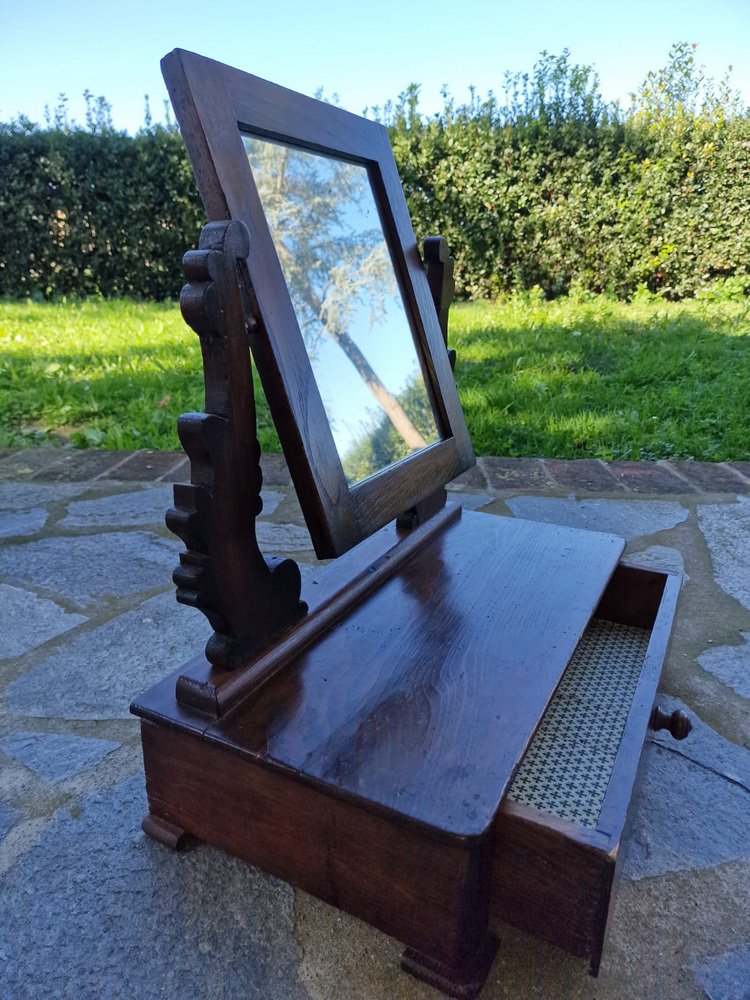 Small walnut dressing table, typically given as part of a bride's dowry to furnish the bedroom. The tilting full-length mirror is original and intact, with a beautiful vintage patina. The drawer is lined with the original paper, featuring Florentine lily motifs. This small dressing table belonged to my family, first to my grandmother, then to my mother, and then to me. It no longer fits in with our décor, and in agreement with my mother, we want it to find a new home where it will be appreciated. No restoration. Only treated for moths.