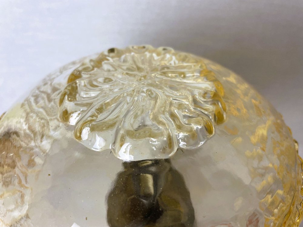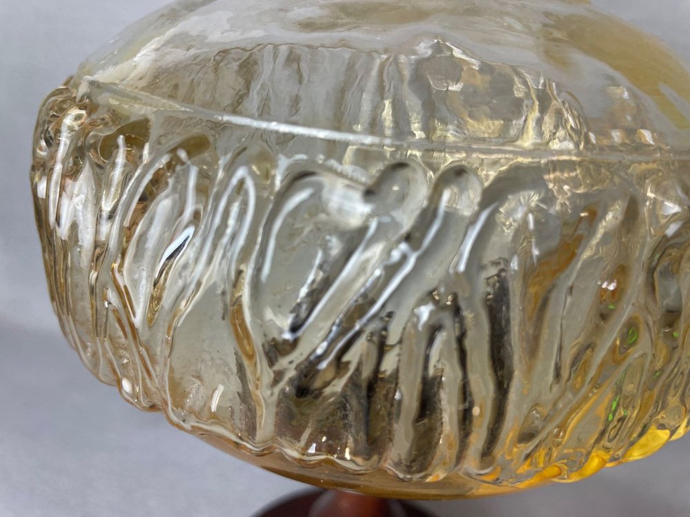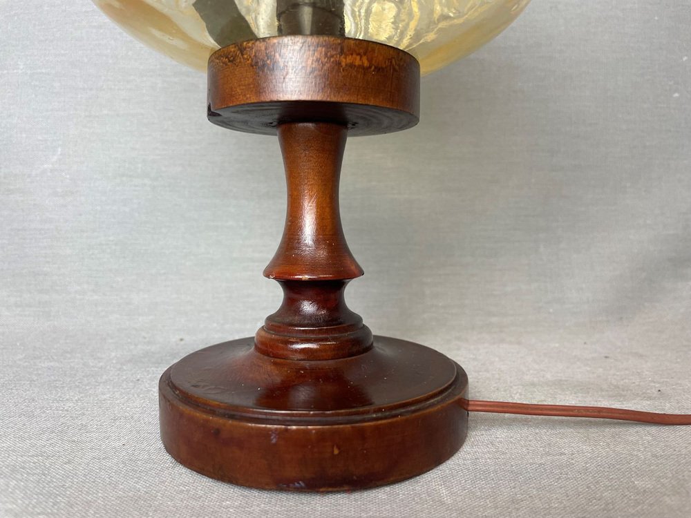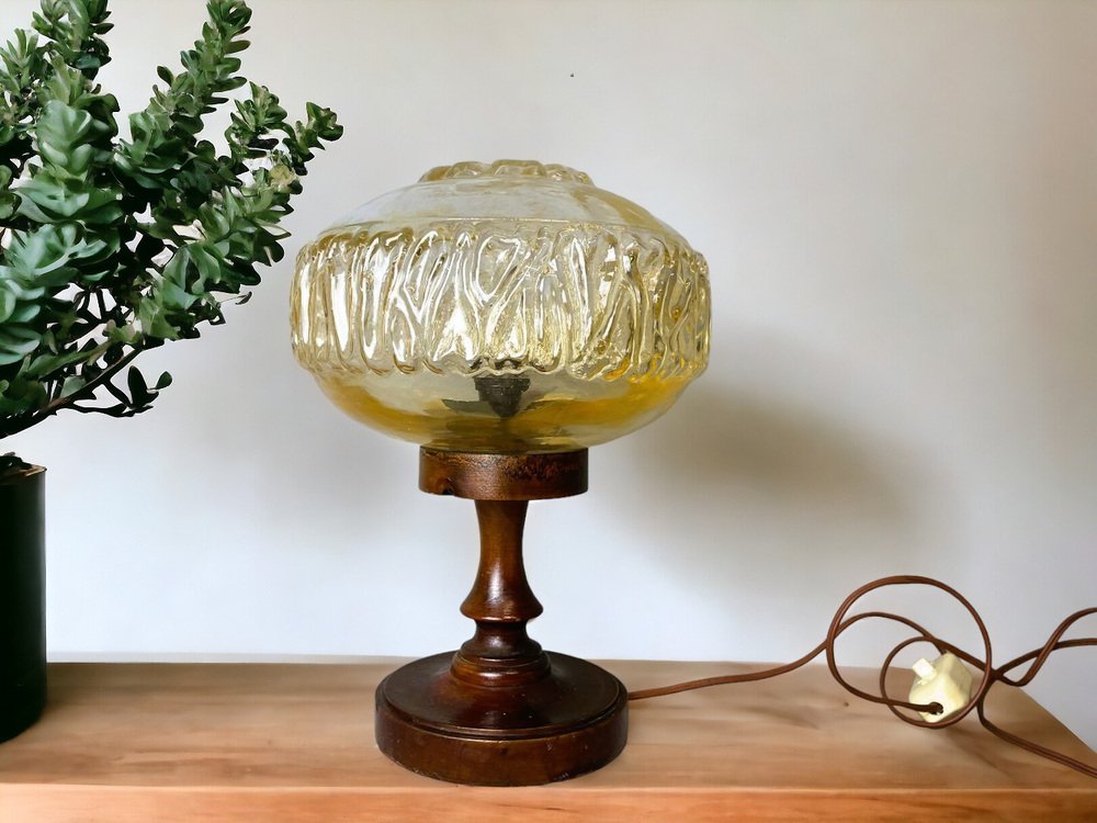 Transport yourself back to the 1960s with this visually captivating Mid Century table lamp from Portugal, made in the 1960s. Embodying the spirit of that era's design with it´s iridescent oval glass shade, this lamp seamlessly combines form and function, making it an exquisite addition to your interior décor. The leg is made from solid wood painted brown.