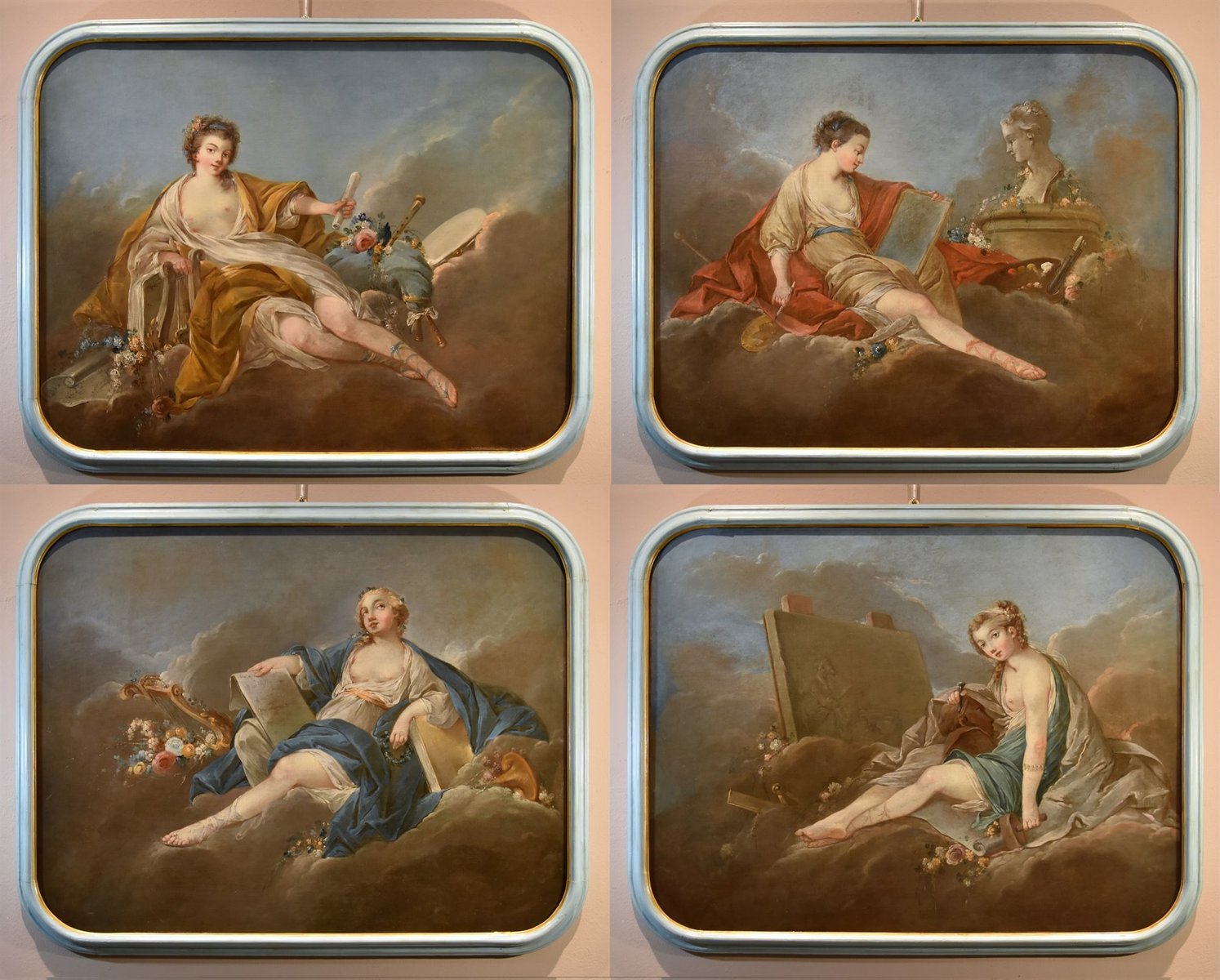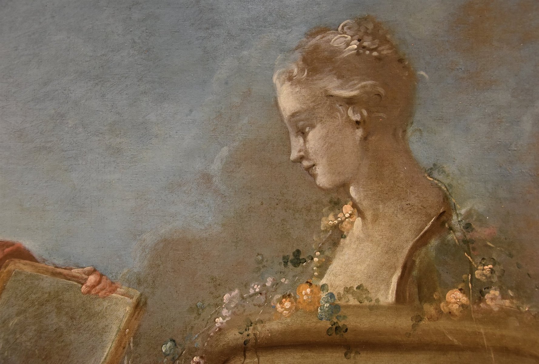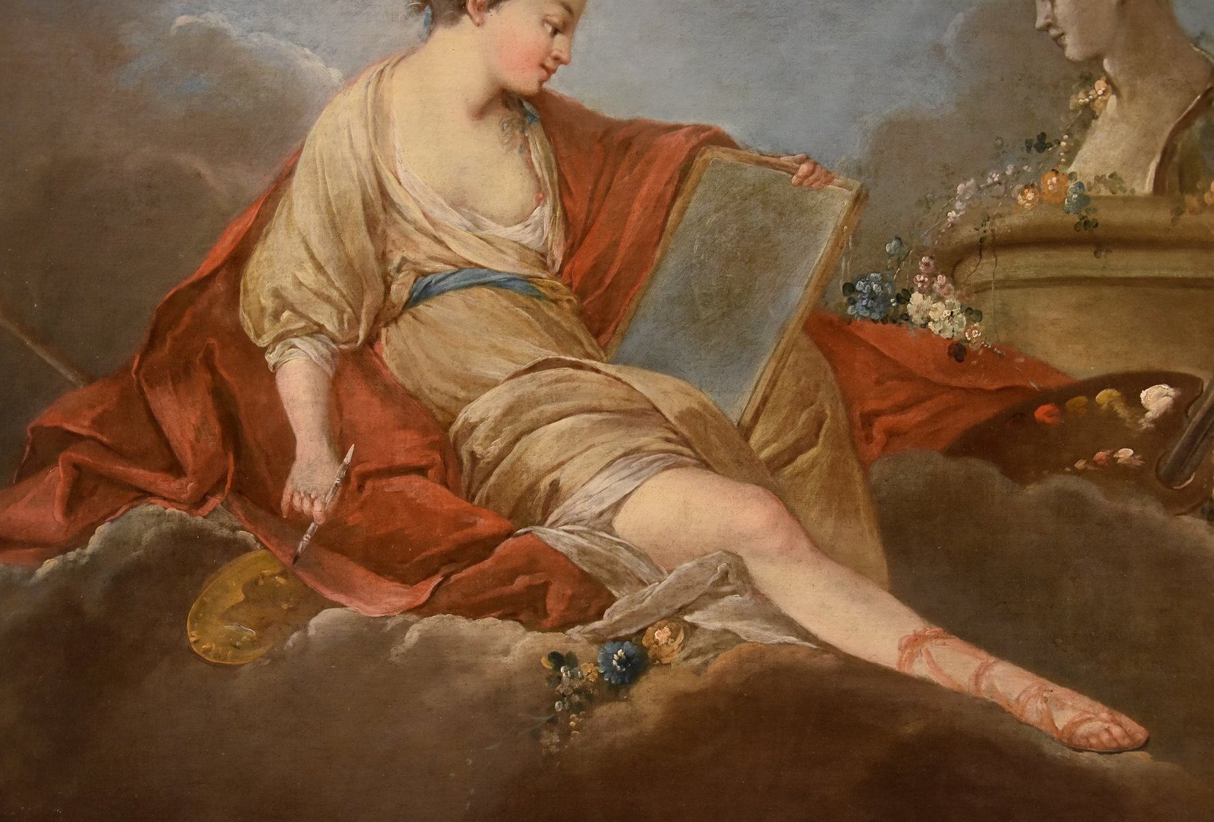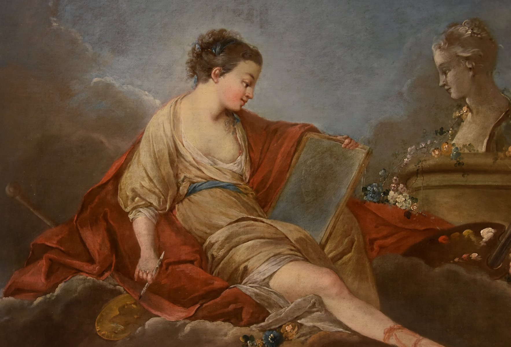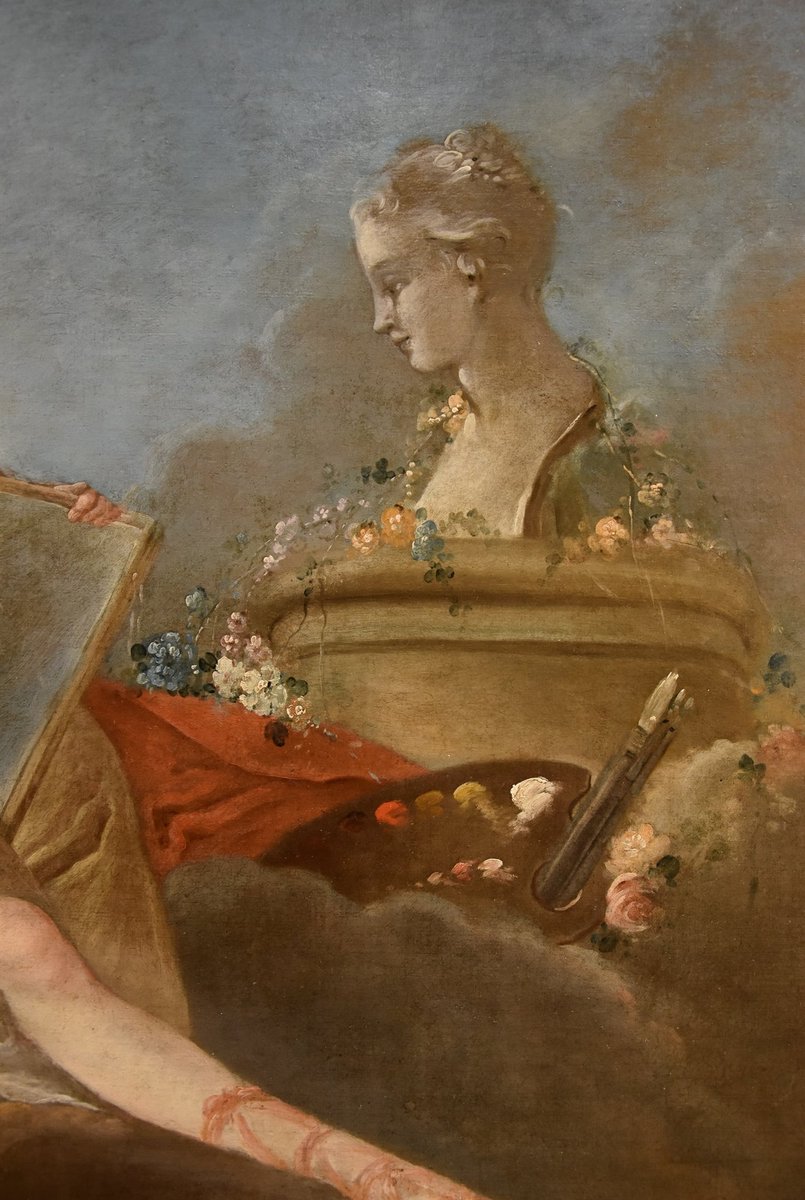 Our canvas depicts one of the legendary deities inspiring creative fervor, who, over the centuries, acquired a specific influence in the fields of art and knowledge. Specifically, the Allegory of Drawing and Painting is depicted, seated on clouds among flowers and painting tools (a hand rest, a palette, and brushes), discreetly dressed in silk, holding a pencil and a sheet of paper on which she is drawing the sculpted bust of the young woman before her.