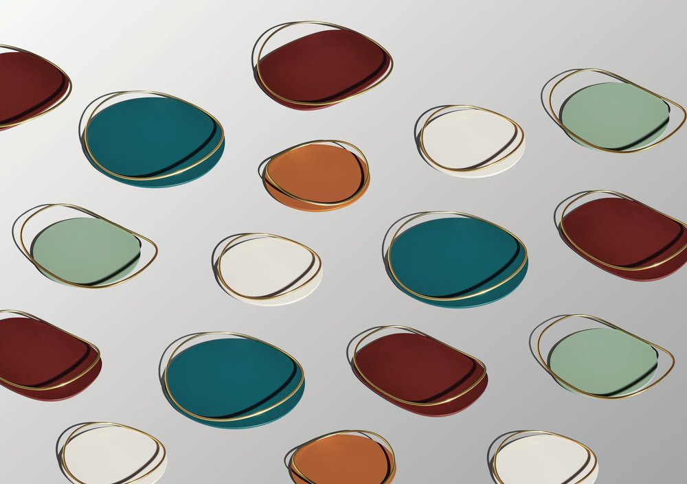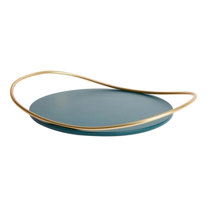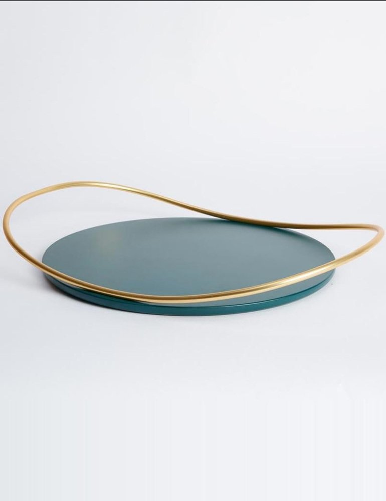 Petrol green Touché B tray by Mason Editions Dimensions: 36 × 47 × 6.7 cm Materials: Iron and MDF Colours: taupe, cotto, burgundy, sage green, petrol green A light metal rod that rests on the surface and then lifts up, almost touching the surface with a quick tap, a movement that defines the handles of Touché trays. The organic shape of the round base communicates with the thin tubular, giving the impression of a perpetual undulatory motion, which seems to vanish when the trays are looked at from above. This small round tray with an oval handle won’t go unnoticed in the eyes of your party and dinner guests. The round MDF base is available in several colours, with a slim handle in galvanized 24k gold. A versatile design object used to serve food and drinks as well as display jewellery and bedroom vanity.