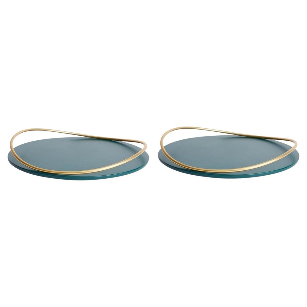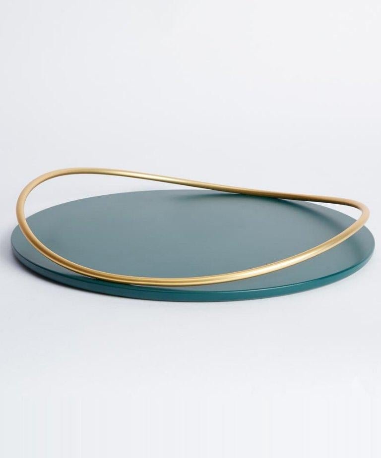 Pair of petrol green Touché a trays by Mason Editions Dimensions: 36 × 36 × 4.4 cm Materials: Iron and MDF Colours: Taupe, cotto, burgundy, sage green, petrol green A light metal rod that rests on the surface and then lifts up, almost touching the surface with a quick tap, a movement that defines the handles of Touché trays. The organic shape of the round base communicates with the thin tubular, giving the impression of a perpetual undulatory motion, which seems to vanish when the trays are looked at from above. This small round tray with a small round handle is multi-functional, with a classic design that suits any decor. The round MDF base is available in several colours, with a slim handle in galvanized 24k gold. from serving drinks and canapés or as a refined centrepiece to display small objects and candles, it’s a must-have furnishing accessory.