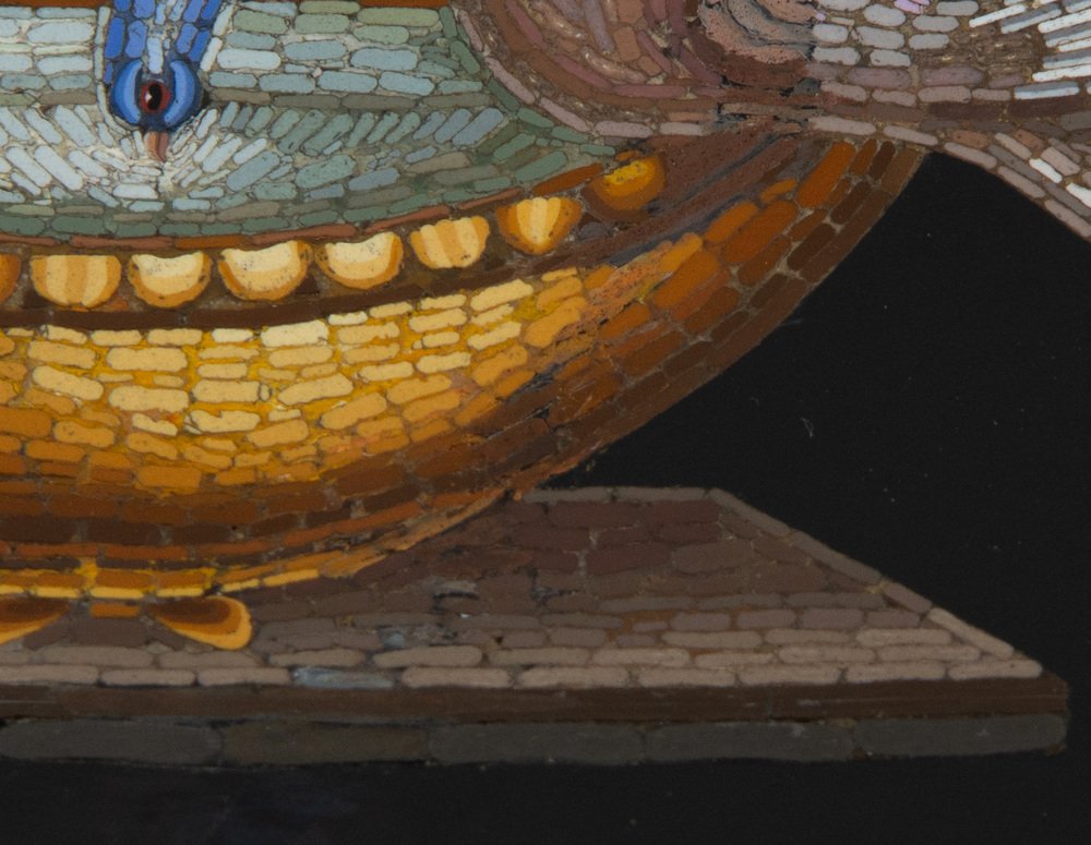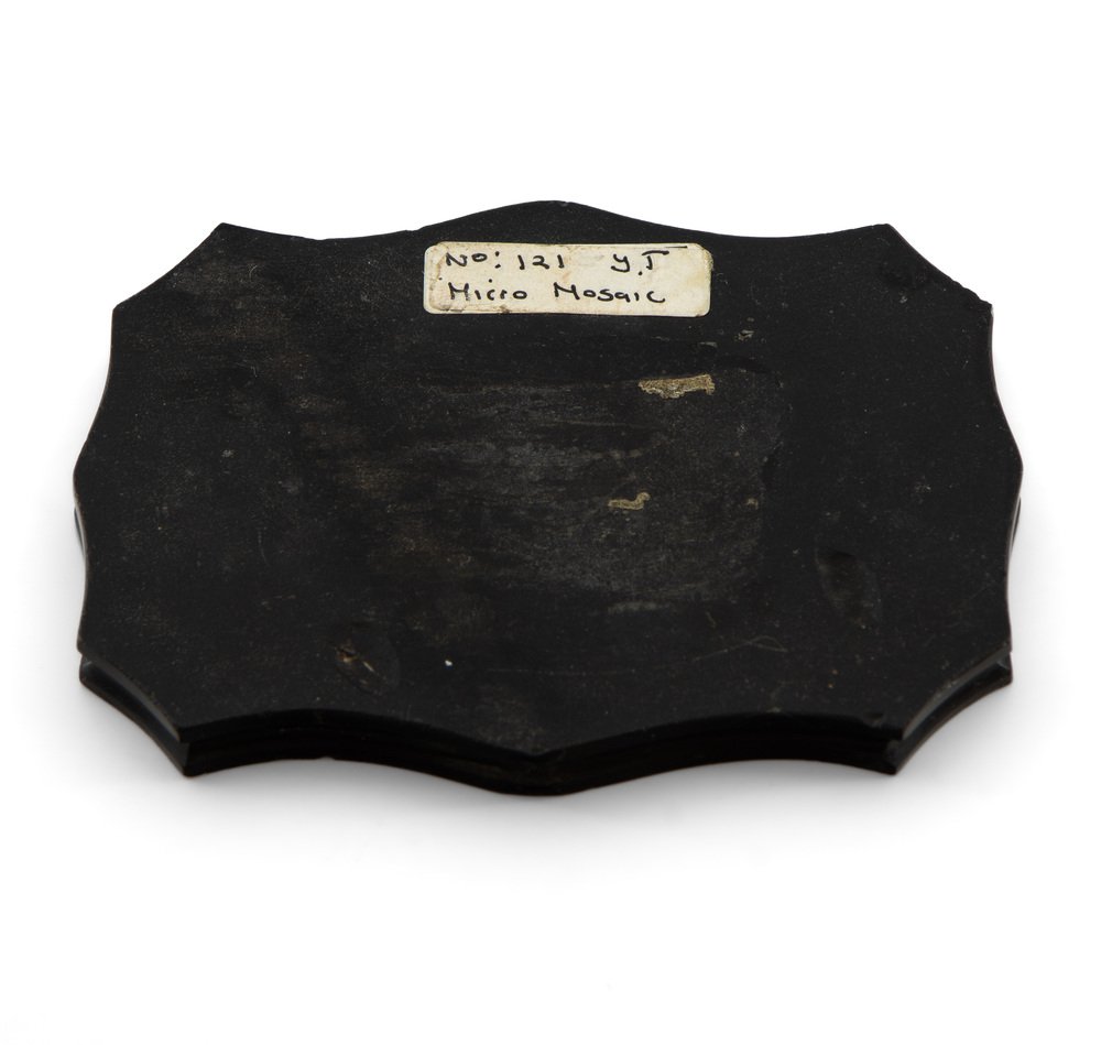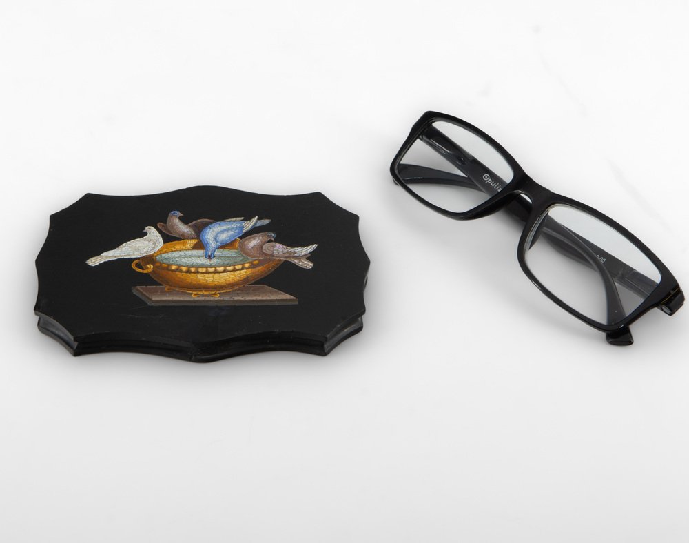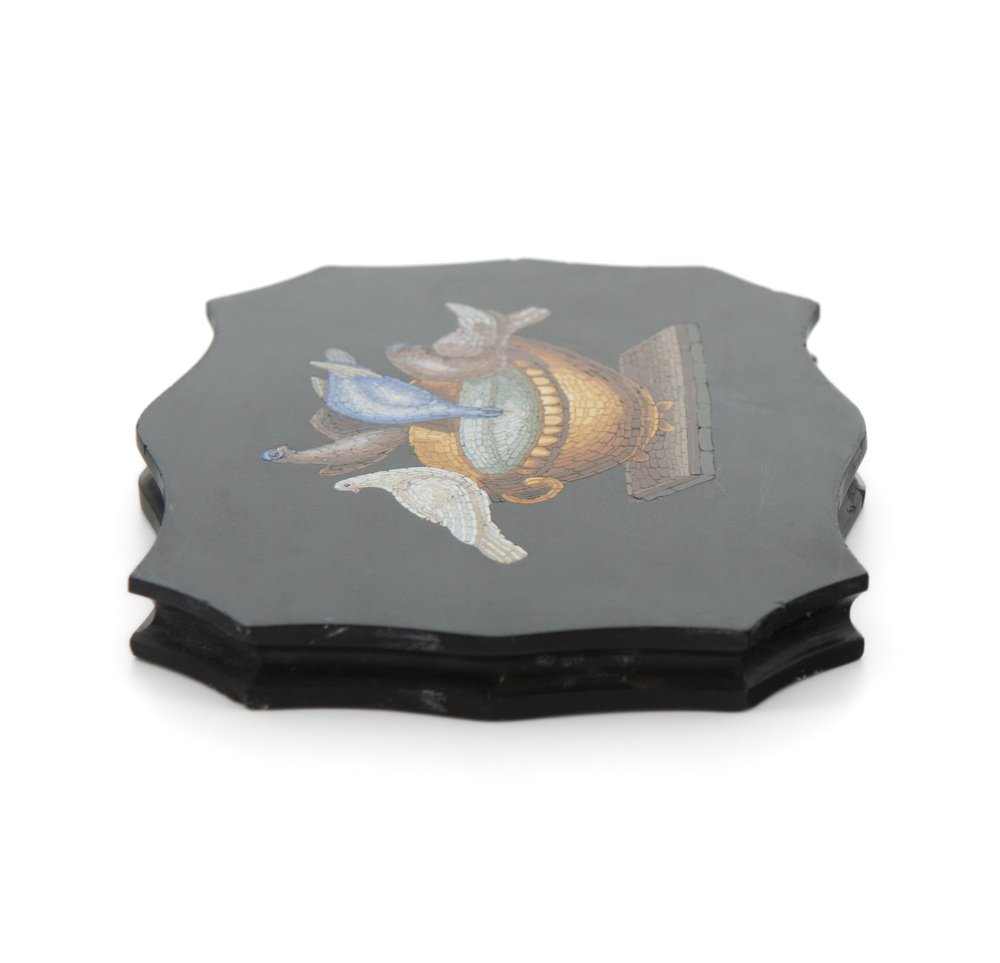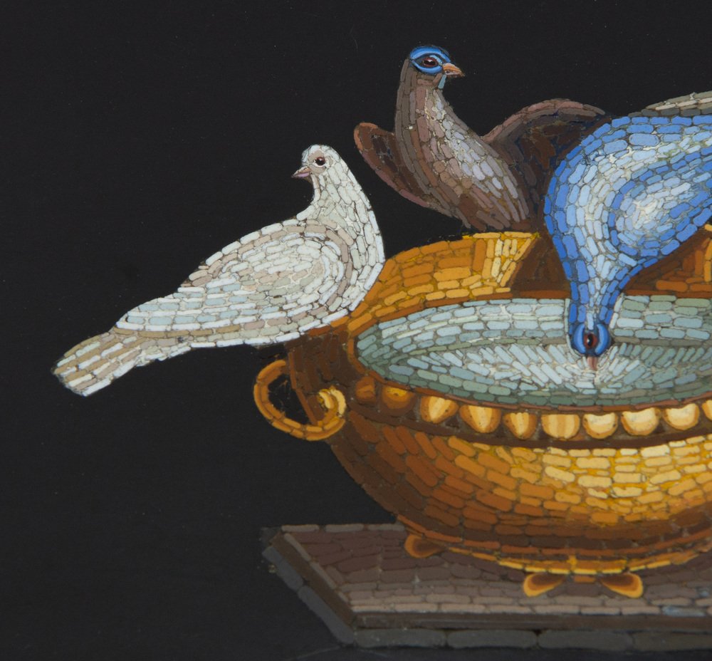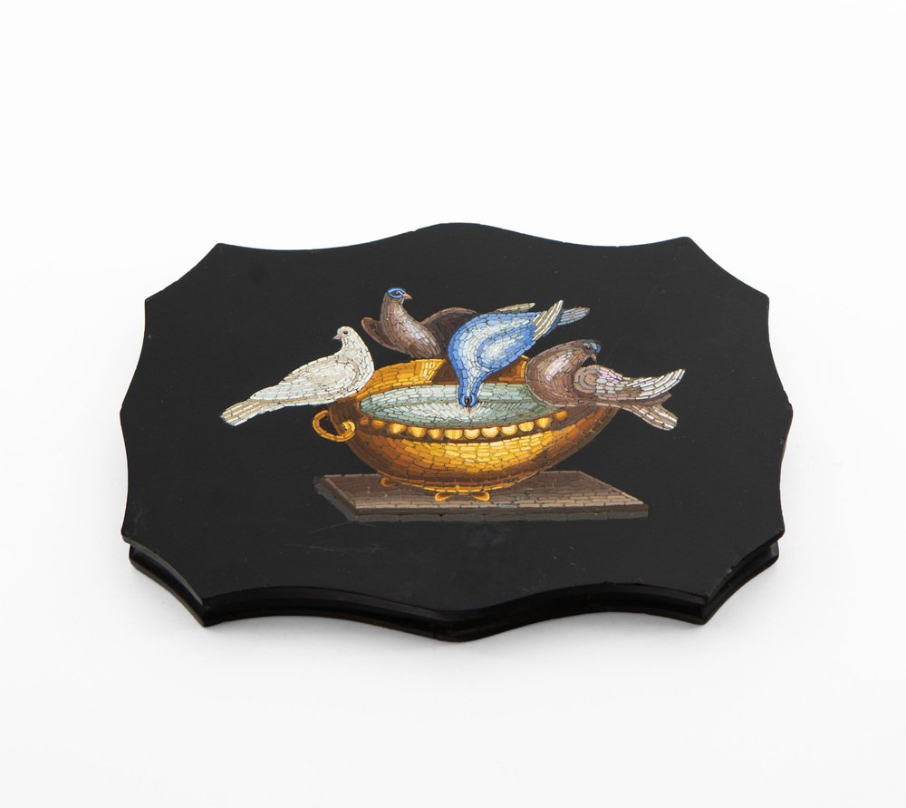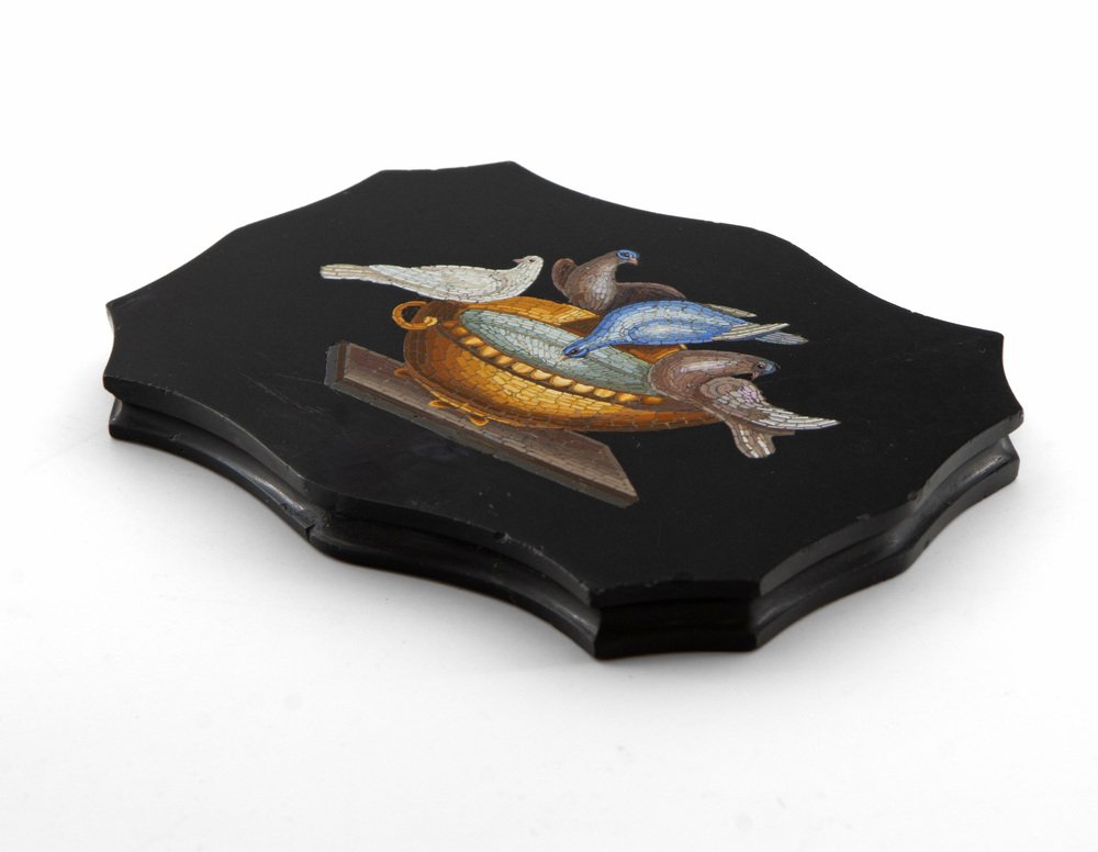 Fond en ardoise noire en forme de cartouche, incrusté d'une micro-mosaïque représentant les colombes de Pline.