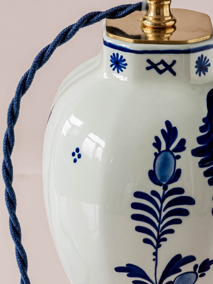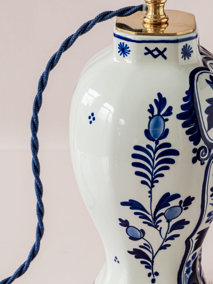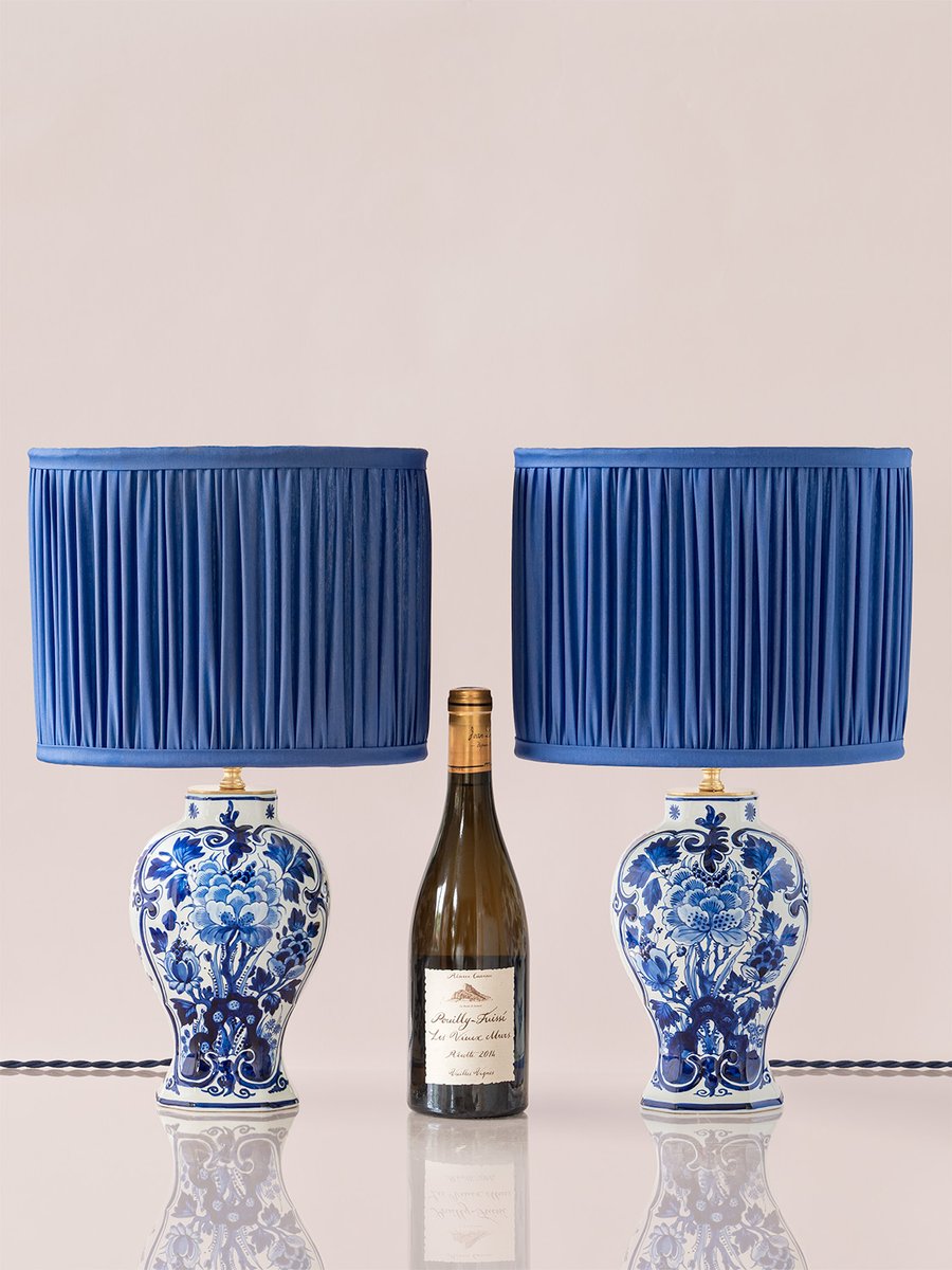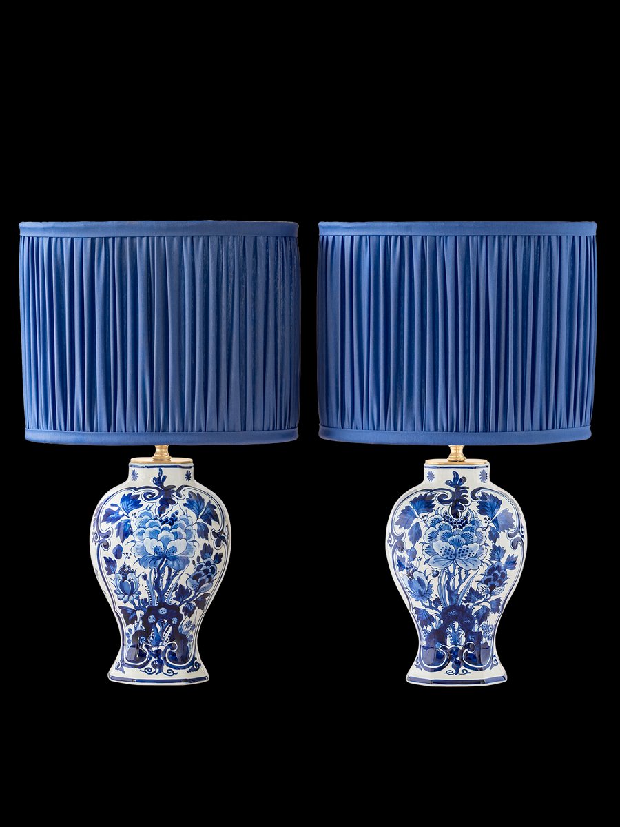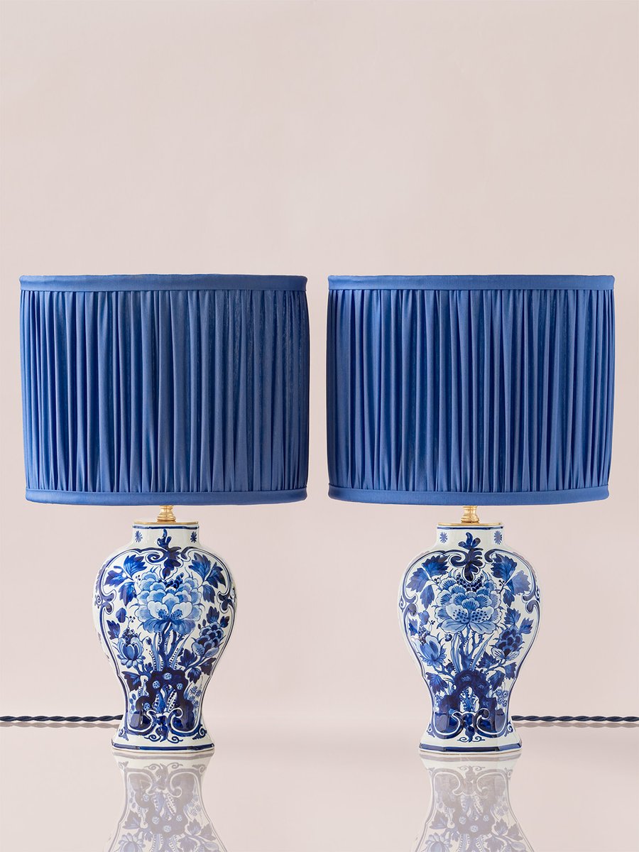 Méticuleusement fabriquées à la main par Amitābha Studio à Amsterdam, Indigo & Blanca sont une paire de lampes de table uniques fabriquées à partir de vases vintage Royal Delft Blue, modèle Louis XV, peints à la main par les maîtres peintres de Royal Delft en 1978 et 1979. Ces lampes exquises sont accompagnées d'abat-jour classiques ovales plissés à la main dans un riche bleu cobalt, ainsi que de cordons assortis. Les lampes ont été créées sans endommager les vases originaux.