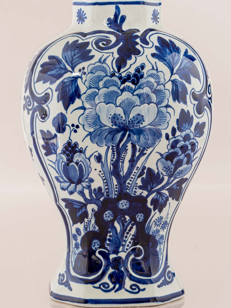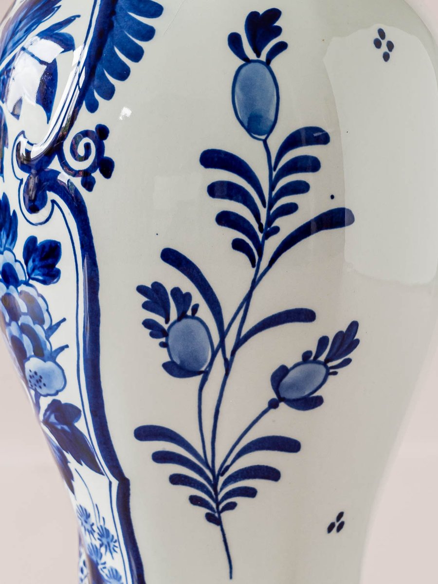 The vase bases feature traditional baluster shapes, scrolling C-curve rocaille cartouches, and eight sides, all painted in classic Delft blue with intricate floral motifs. This design reflects the Louis XV style, which De Porceleyne Fles, one of the oldest and most prestigious Dutch Delftware manufacturers, adopted in the late 19th century to meet the growing demand for ornamental pieces.