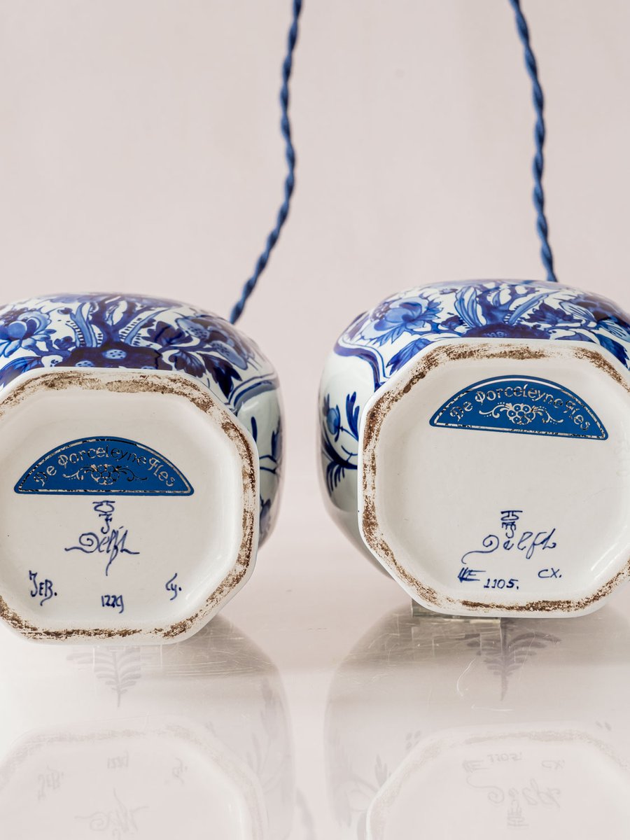 Les bases des vases présentent des formes balustres traditionnelles, des cartouches rocaille en forme de C et huit côtés, tous peints en bleu de Delft classique avec des motifs floraux complexes. Ce design reflète le style Louis XV, que De Porceleyne Fles, l'un des plus anciens et des plus prestigieux fabricants néerlandais de Delftware, a adopté à la fin du XIXe siècle pour répondre à la demande croissante de pièces ornementales.