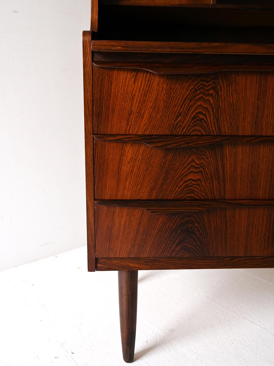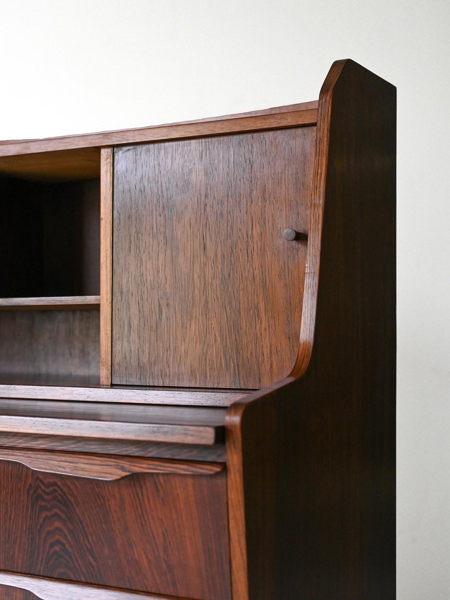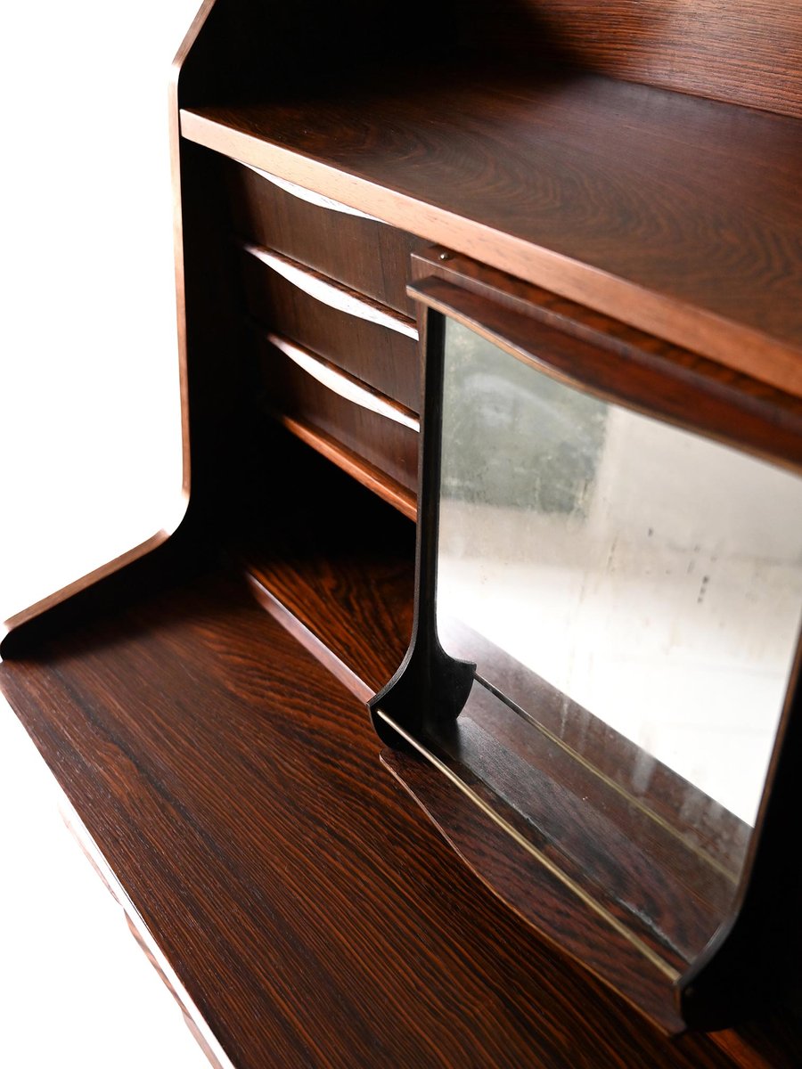Bureau en palissandre à grain foncé, étagère coulissante, miroir intérieur et tiroirs inférieurs. Élégant design nordique des années 1950 et 1960.