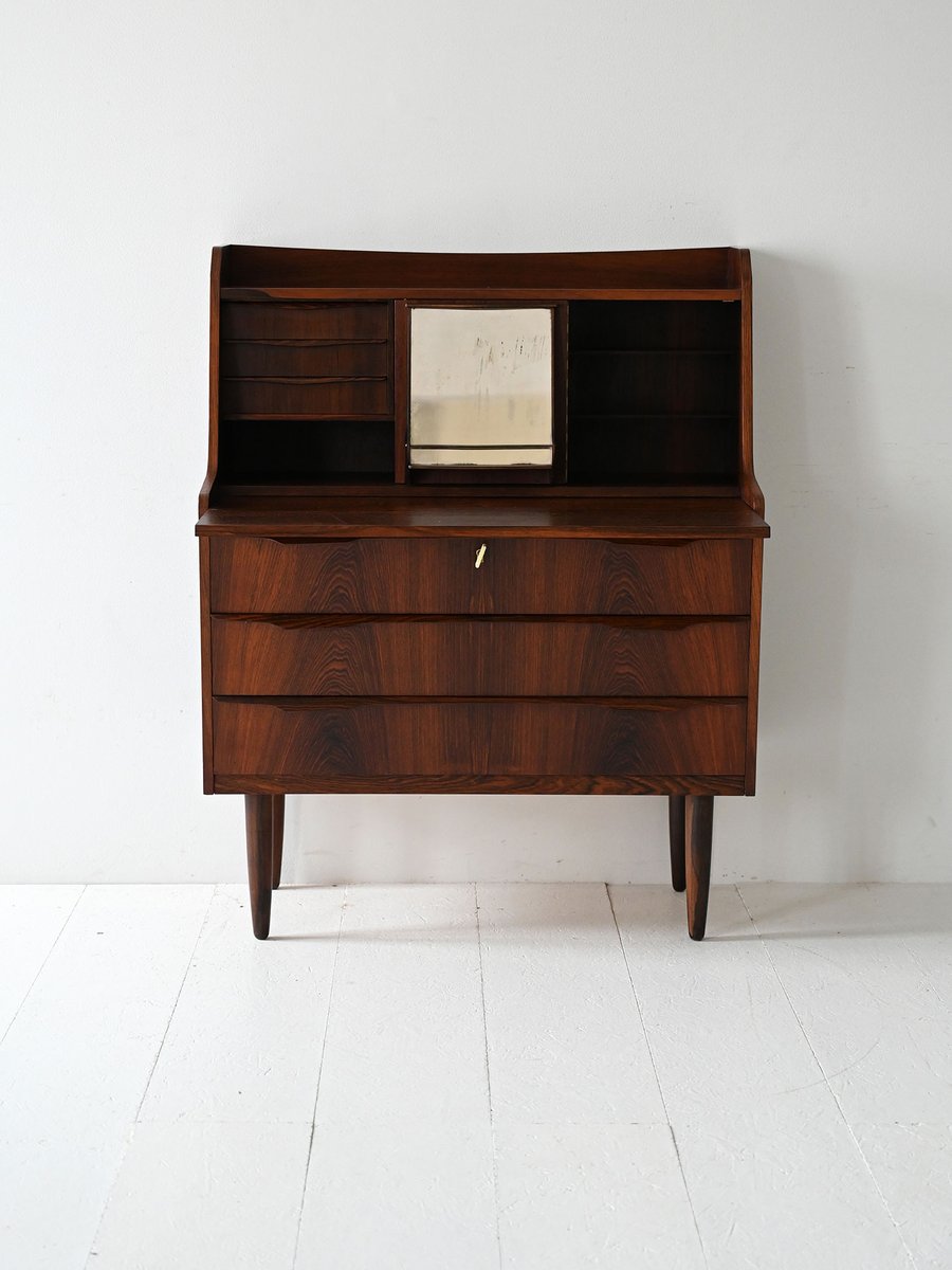 Rosewood writing desk with turned legs and pronounced dark grain. The lower section houses large drawers, while the upper section features a pull-out shelf, small drawers, shelves, and a compartment with a door that conceals an internal mirror. Simple, elegant lines combine with decorative details typical of Scandinavian design.