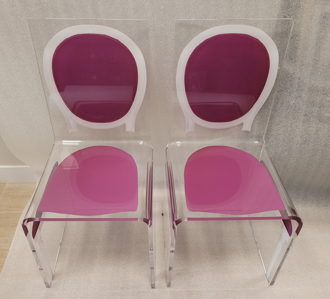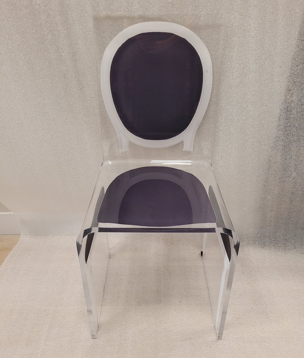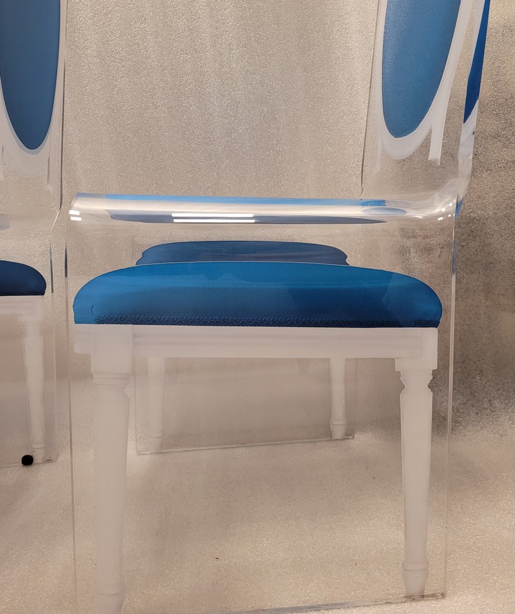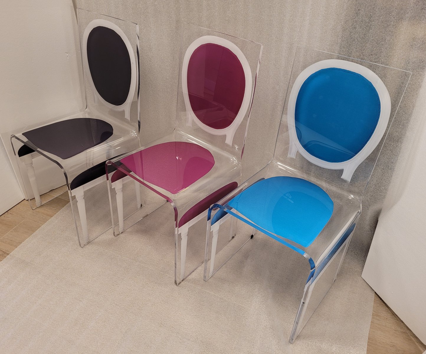 They represent the perfect combination between tradition and modernity, as the model is truly an avant-garde stylization of Louis XVI style chairs in an absolutely modern material. Originally, Louis XVI chairs, a symbol of elegance, were made of wood, with upholstered backrest and seat. In this case, acrylic glass offers an ethereal and crystalline appearance, creating the piece in a single block, without the need for screws or adhesives.