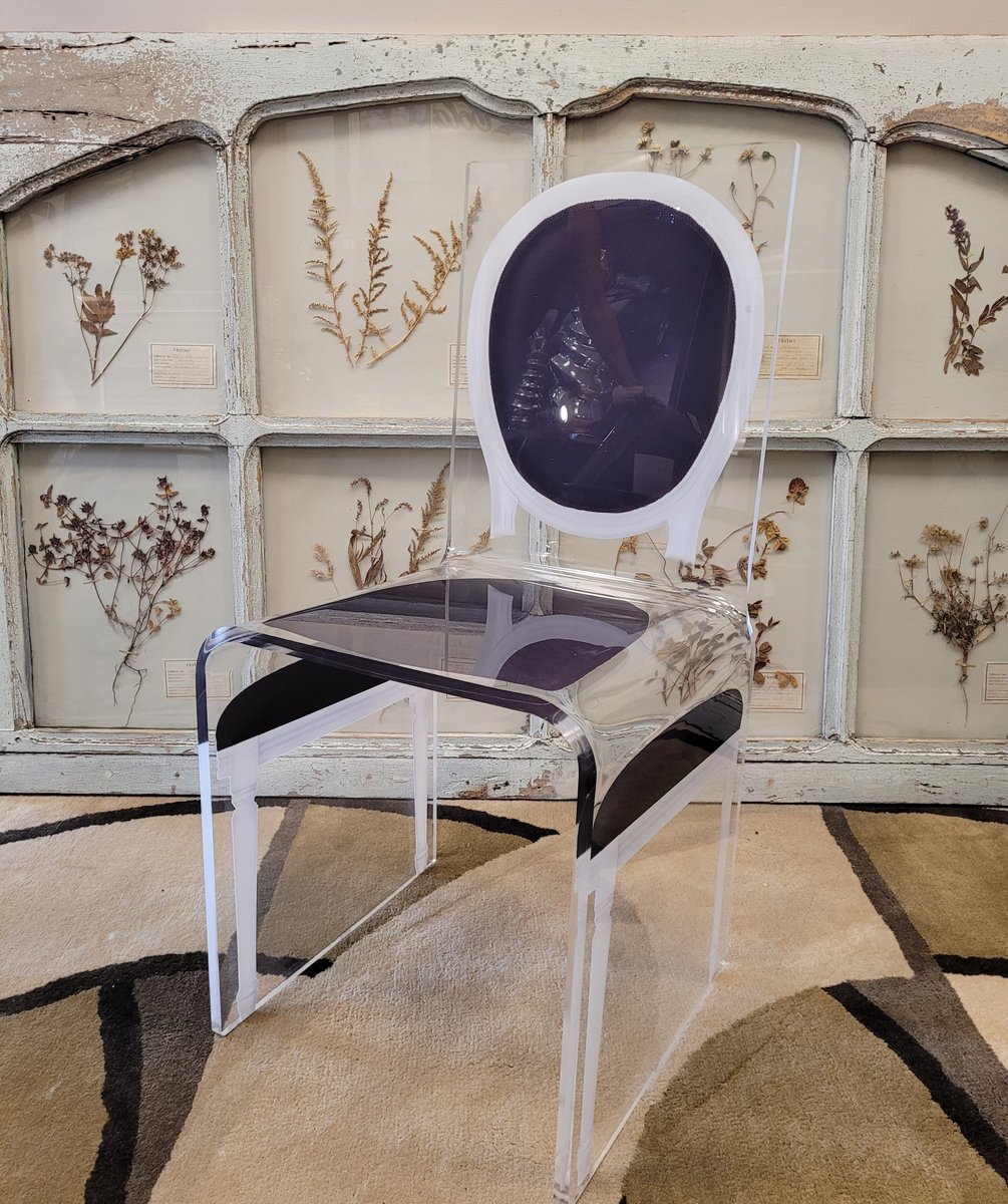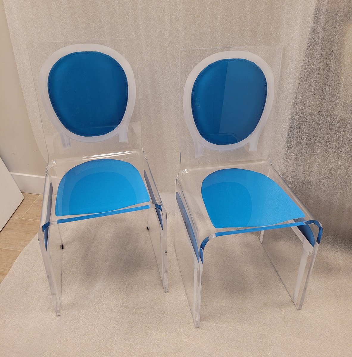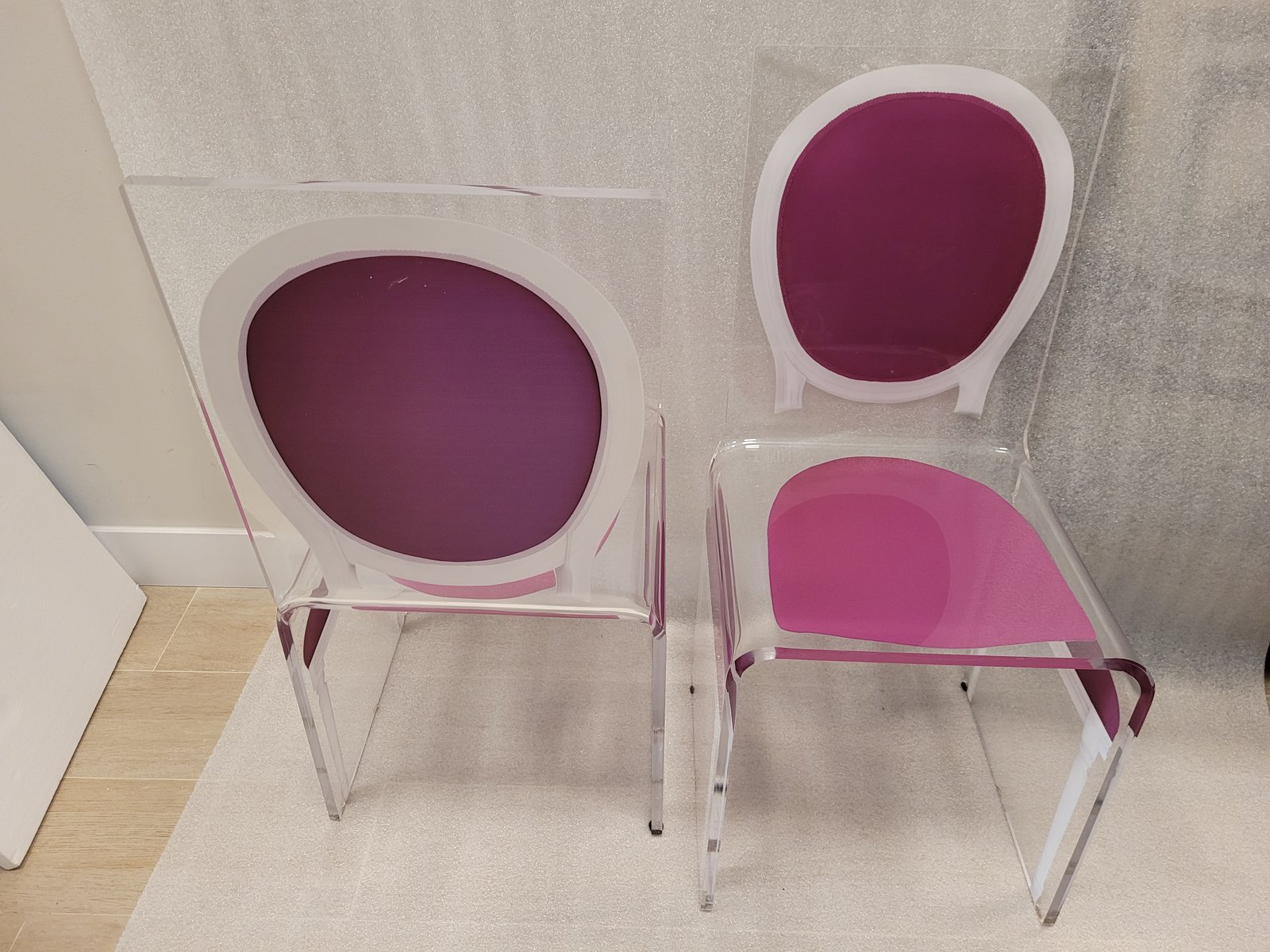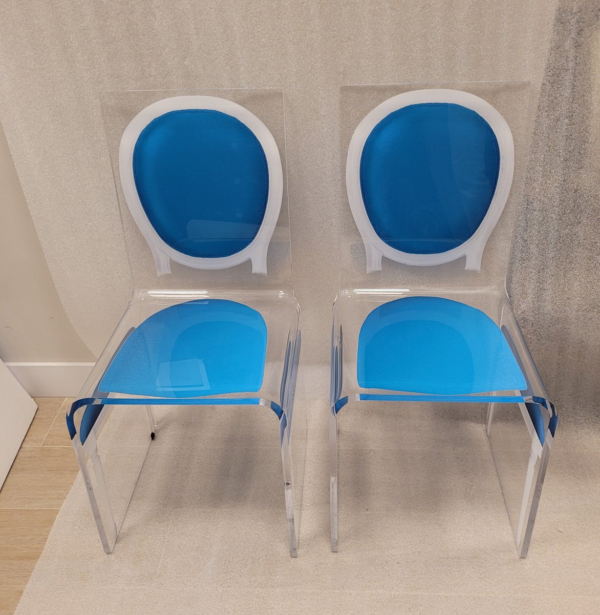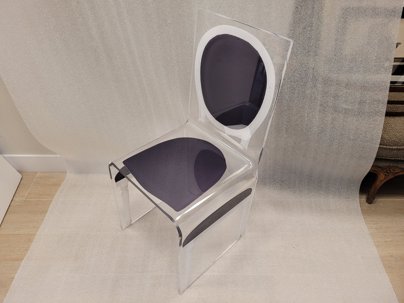 They represent the perfect combination between tradition and modernity, as the model is truly an avant-garde stylization of Louis XVI style chairs in an absolutely modern material. Originally, Louis XVI chairs, a symbol of elegance, were made of wood, with upholstered backrest and seat. In this case, acrylic glass offers an ethereal and crystalline appearance, creating the piece in a single block, without the need for screws or adhesives.