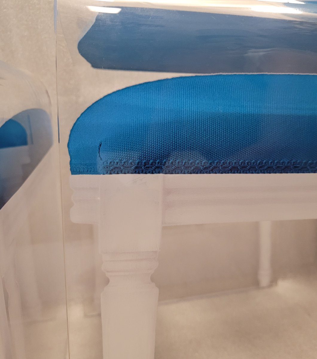 Profitant de la transparence du matériau, la structure des chaises Louis XVI est imitée, aussi bien le dossier que l'assise et les quatre pieds, tous en blanc. Le "rembourrage" est divisé en paires, deux chaises en bleu, deux en rose et les deux autres en noir. Le résultat est un ensemble de chaises original, amusant et sophistiqué.