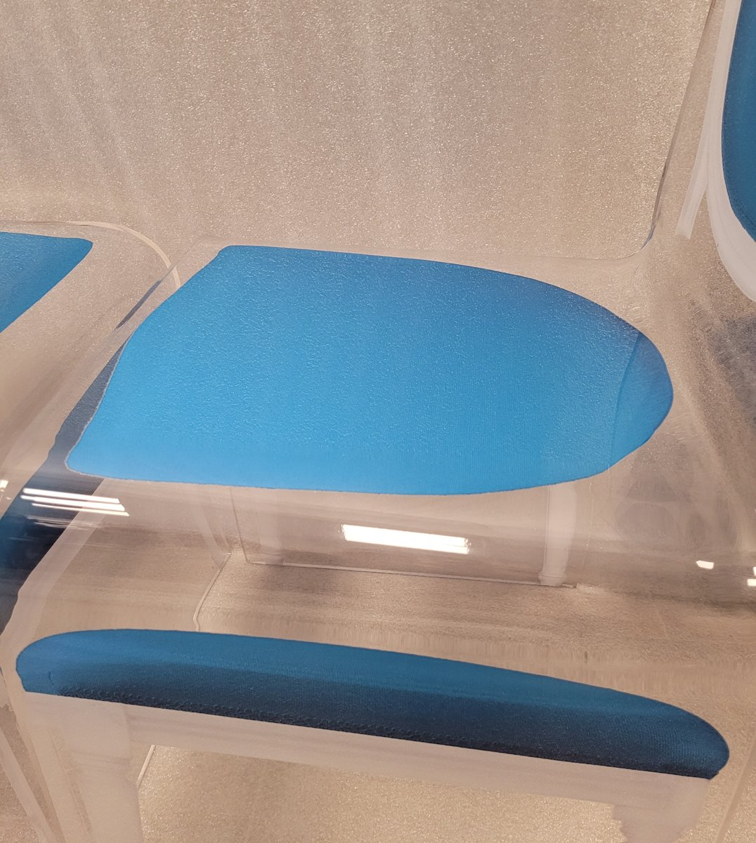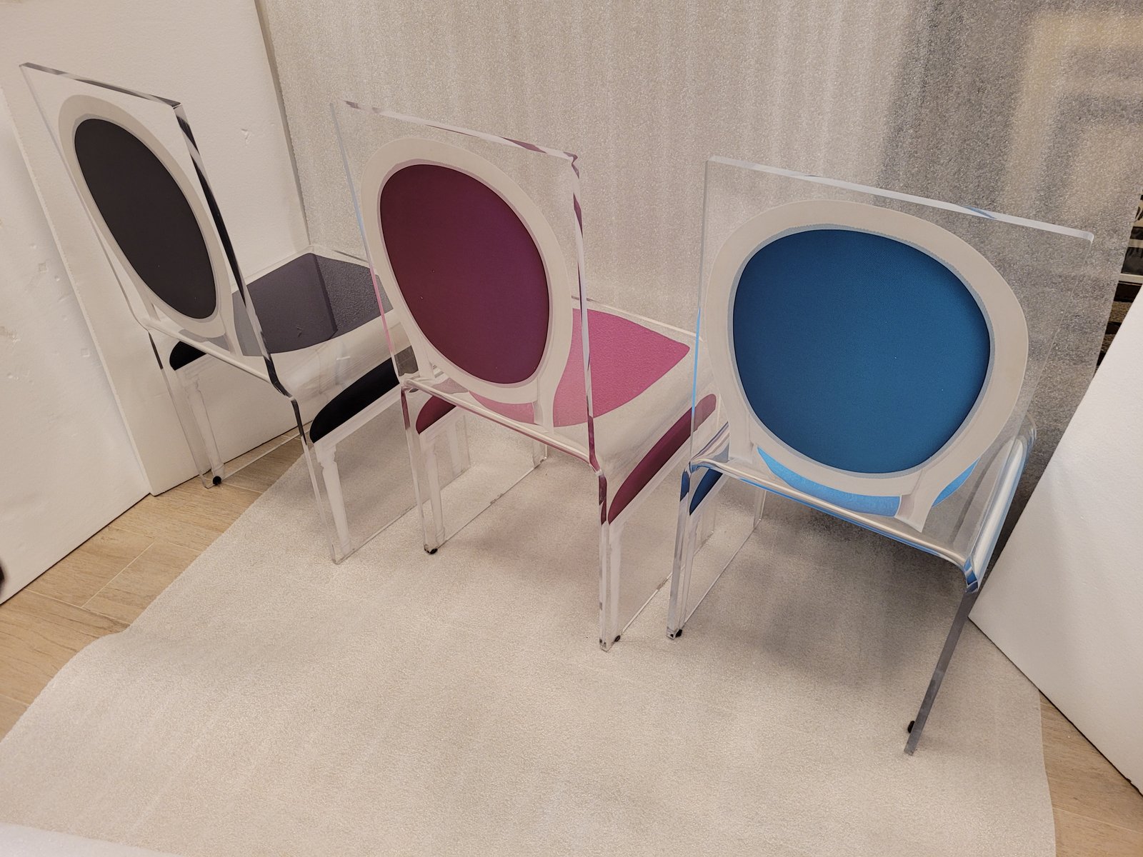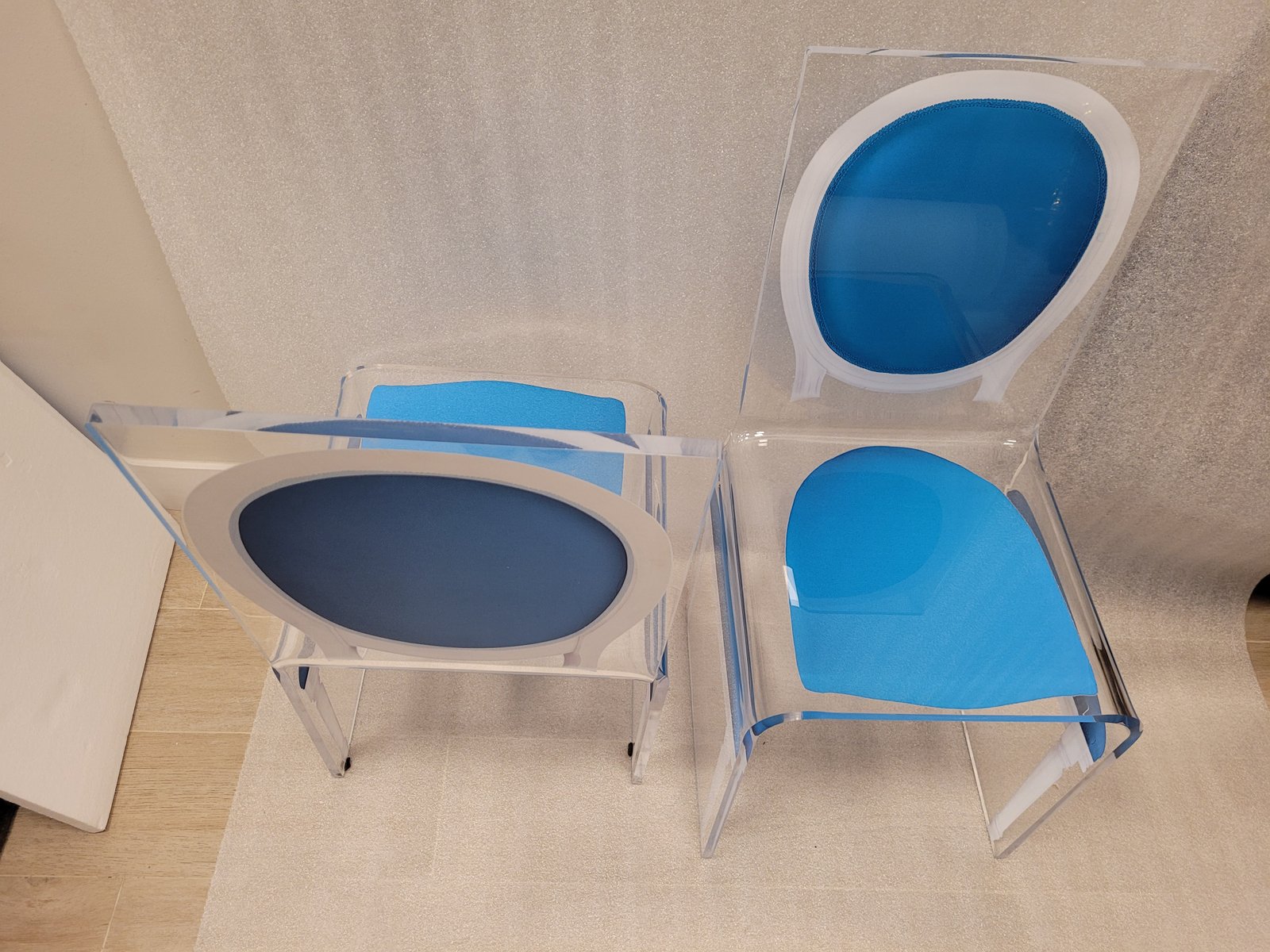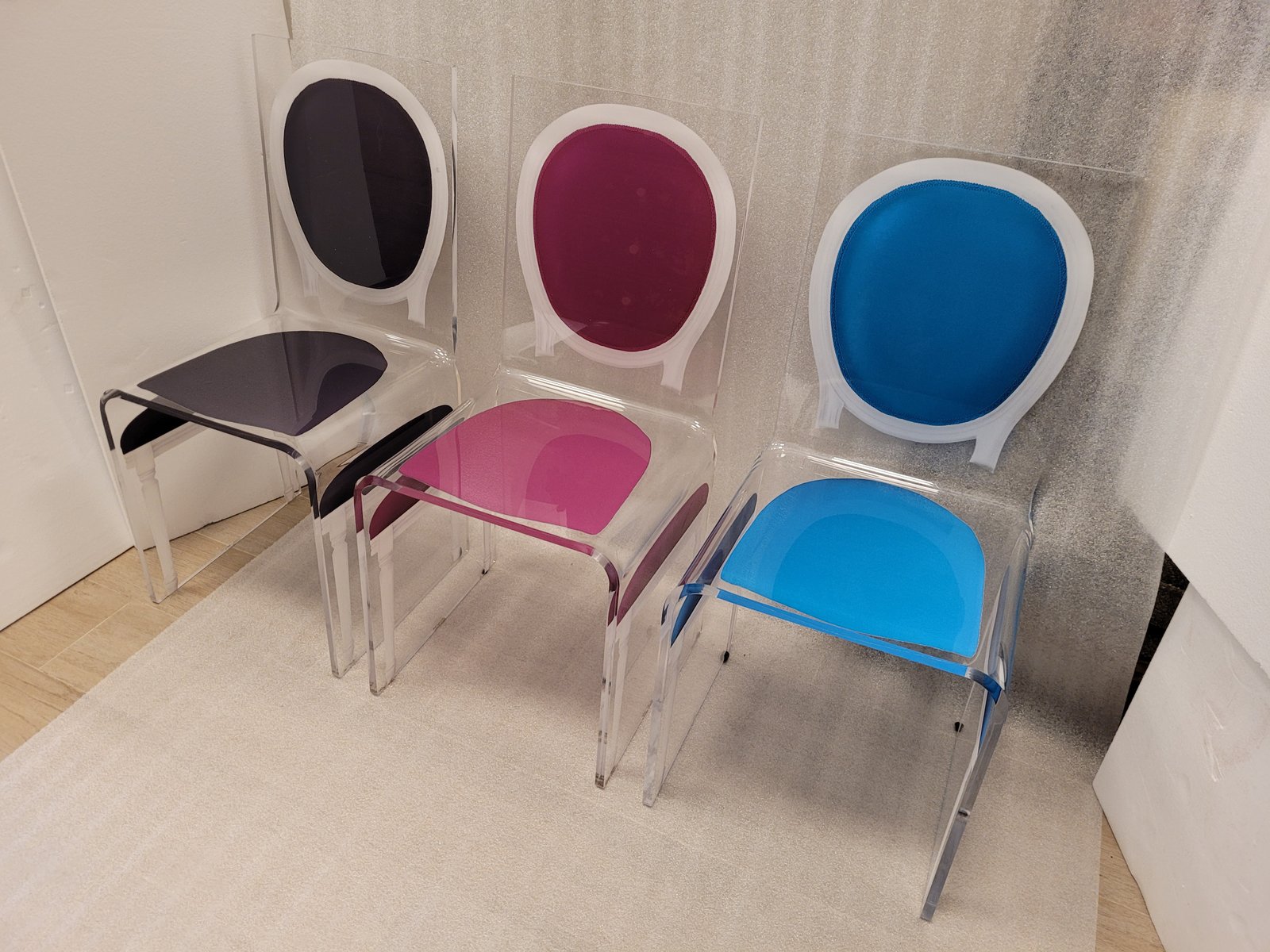 Taking advantage of the transparency of the material, the structure of the Louis XVI chairs is imitated, both the backrest, the seat and the four legs, all in white. The “upholstery” is divided into pairs, two chairs in blue, two in pink and the remaining two in black. The result is an original, fun and sophisticated set of chairs.