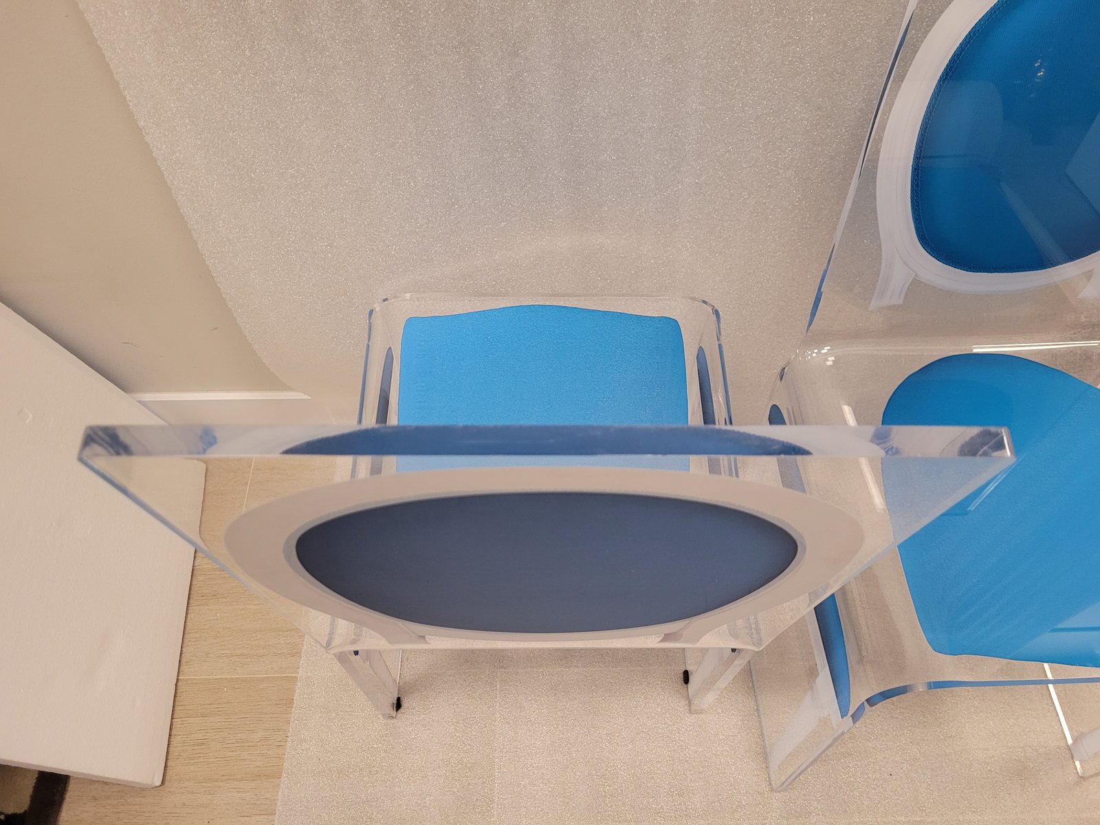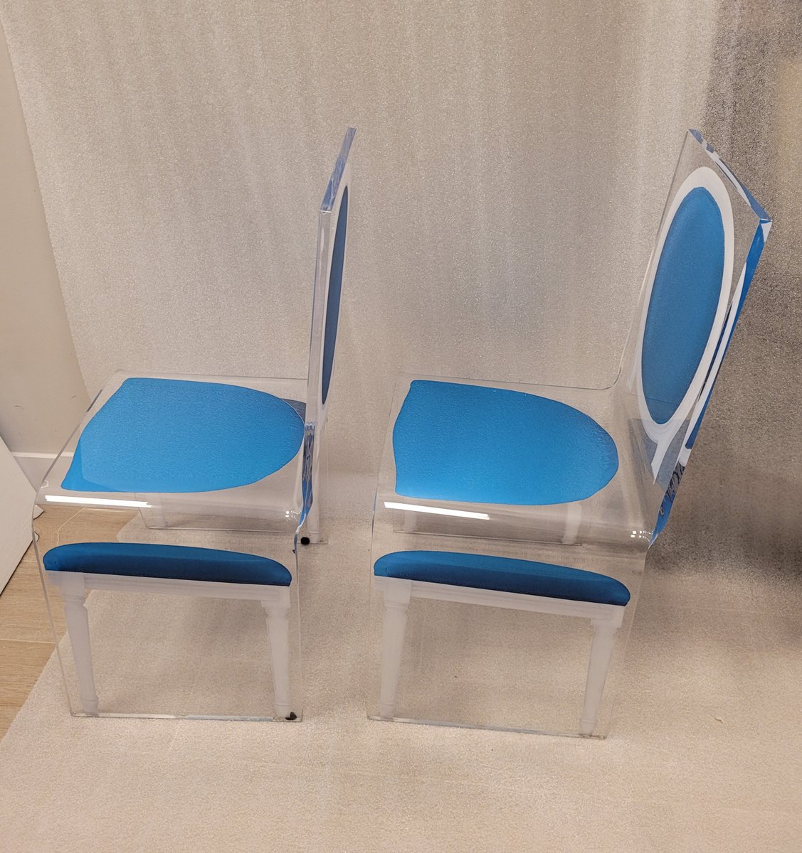 Elles représentent la combinaison parfaite entre tradition et modernité, car le modèle est une véritable stylisation avant-gardiste de chaises de style Louis XVI dans un matériau absolument moderne. À l'origine, les chaises Louis XVI, symbole d'élégance, étaient fabriquées en bois, avec un dossier et une assise rembourrés. Dans ce cas, le verre acrylique offre un aspect éthéré et cristallin, en créant la pièce en un seul bloc, sans avoir besoin de vis ou d'adhésifs.