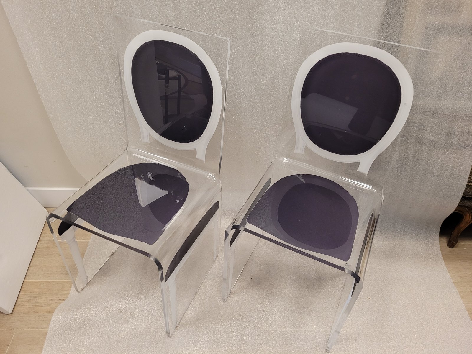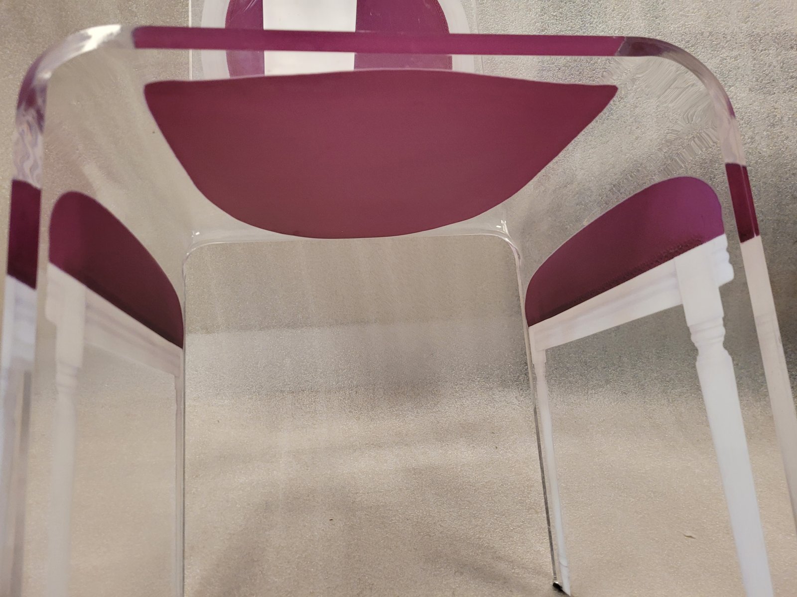 Incredible set consisting of six high-quality French acrylic glass chairs, inspired by the design of the Louis Ghost model created by Philippe Starck for the Italian manufacturer Kartell in 2002. Many designers have been inspired by Starck's original design to create different pieces of furniture, furniture where shape, image, transparency and light are combined. This set of dining chairs is attributed to French designer Jean Charles de Castelbajac, for Acrila.