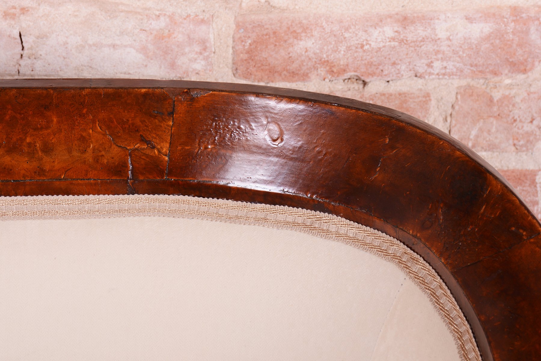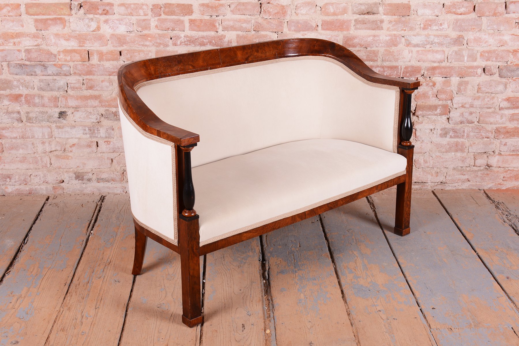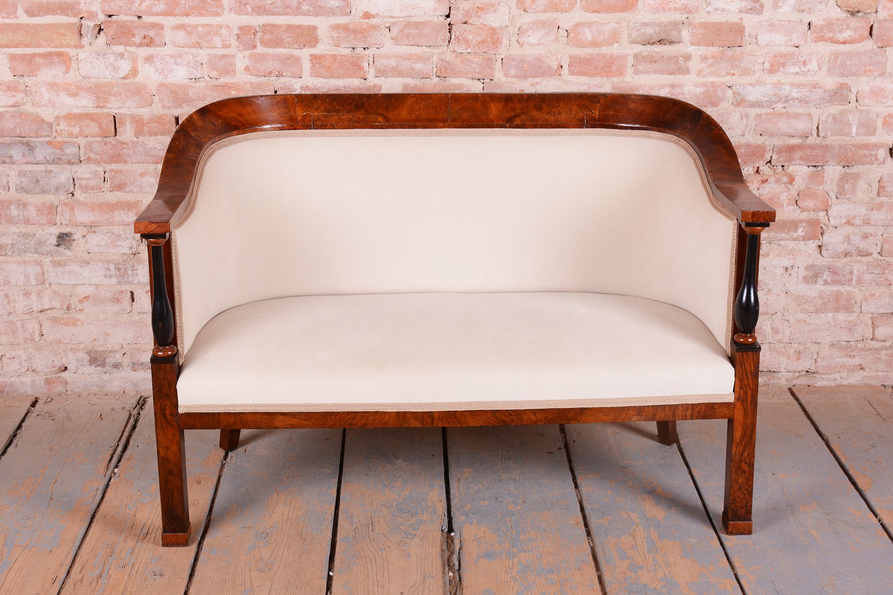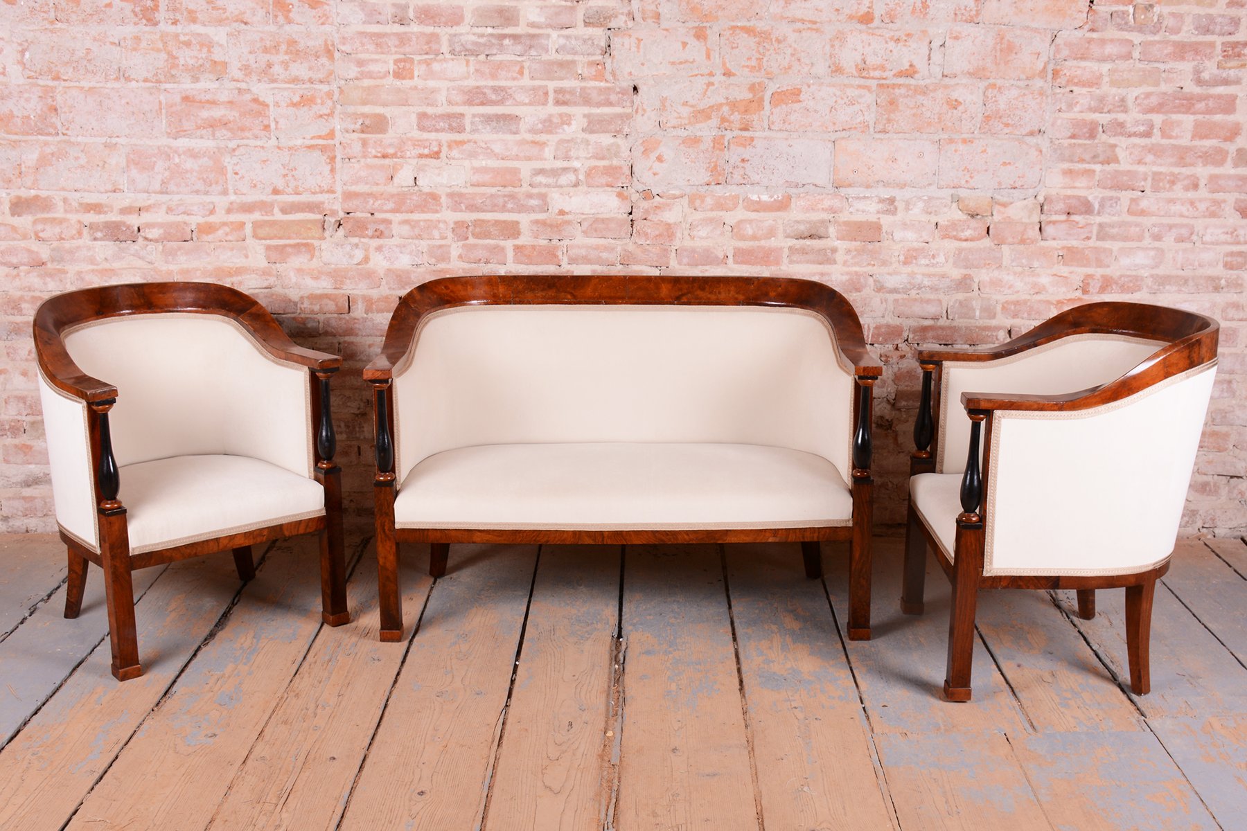 The set has undergone extensive and complete restoration. The foundation is a robust solid spruce and oak frame, ensuring strength and stability, while the visible surfaces are veneered in fine walnut. The original wood polish has been sensitively refreshed, highlighting the honey-like color and rich grain of the walnut. A unique decorative feature is the subtle ebony columns, which create an elegant contrast to the lighter wood. The entire set has been newly and professionally upholstered with high-quality textile fabric according to the original design, preserving its authentic historical character and maximum comfort.