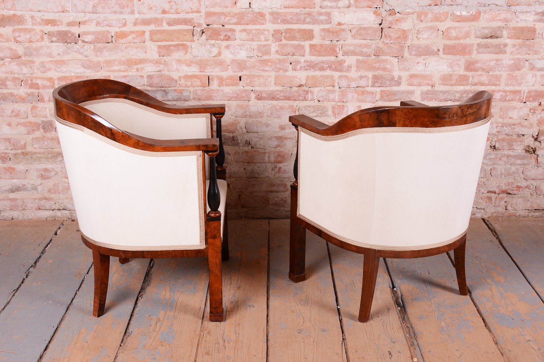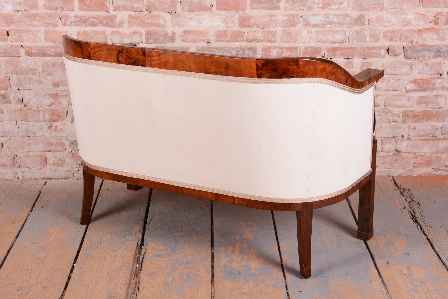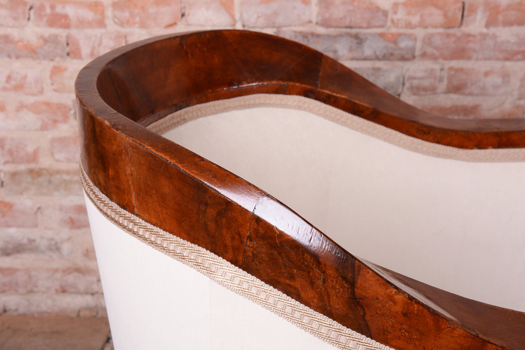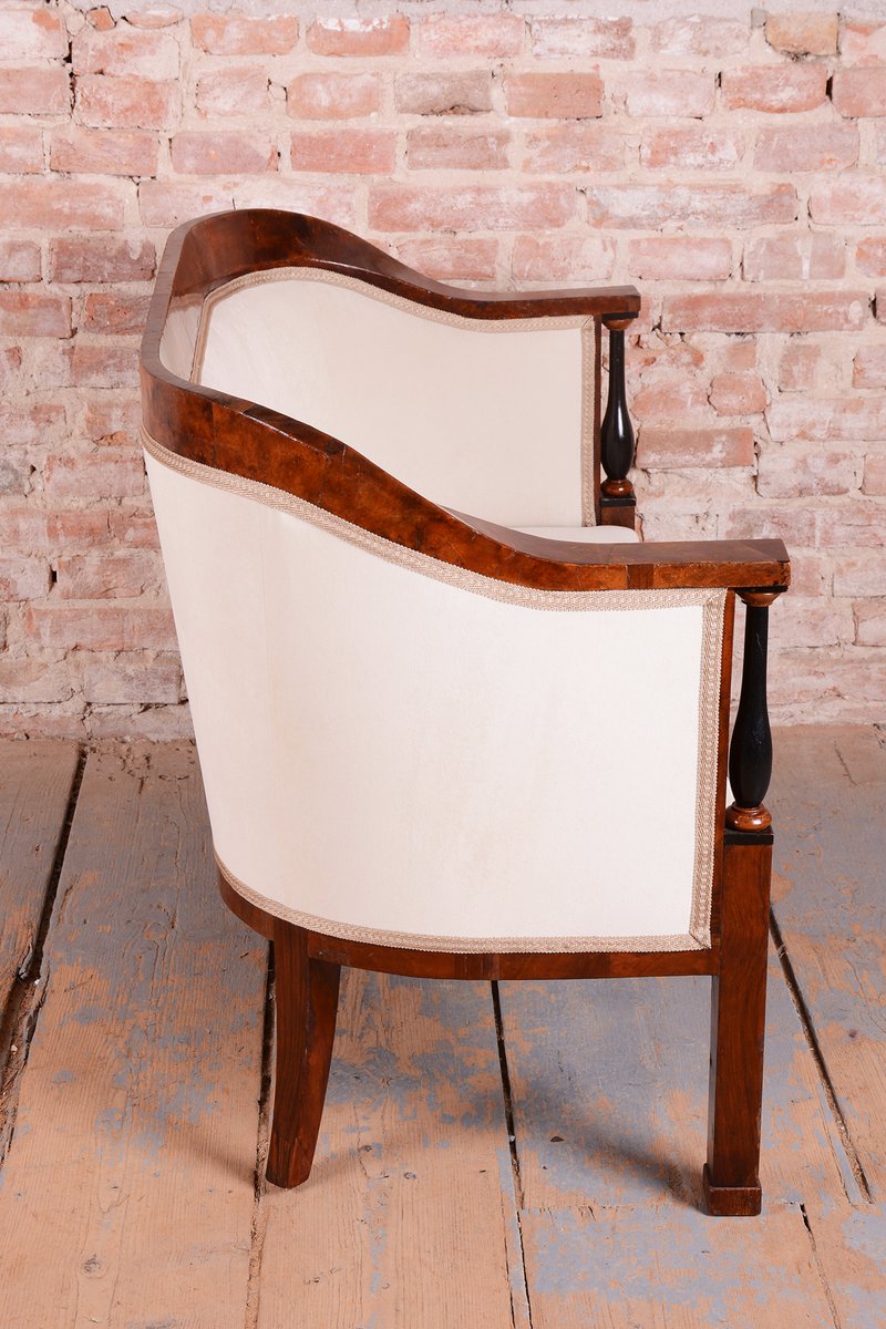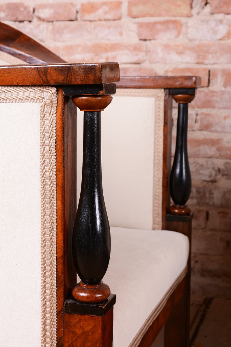 L'ensemble a fait l'objet d'une restauration complète et approfondie. La structure est constituée d'un cadre robuste en épicéa et en chêne massif, garantissant solidité et stabilité, tandis que les surfaces visibles sont plaquées en noyer fin. Le vernis d'origine a été rafraîchi avec soin, mettant en valeur la couleur miel et le grain riche du noyer. Les colonnes subtiles en ébène, qui créent un contraste élégant avec le bois plus clair, constituent un élément décoratif unique. L'ensemble a été entièrement retapissé de manière professionnelle avec un tissu de haute qualité, conformément au design d'origine, afin de préserver son caractère historique authentique et d'offrir un confort maximal. Conformément au processus d'origine, notre équipe de restauration professionnelle en République tchèque a restauré et retapissé l'article. Il a été repoli avec une laque polyuréthane pour piano par notre équipe de restauration professionnelle en République tchèque, conformément au processus d'origine.