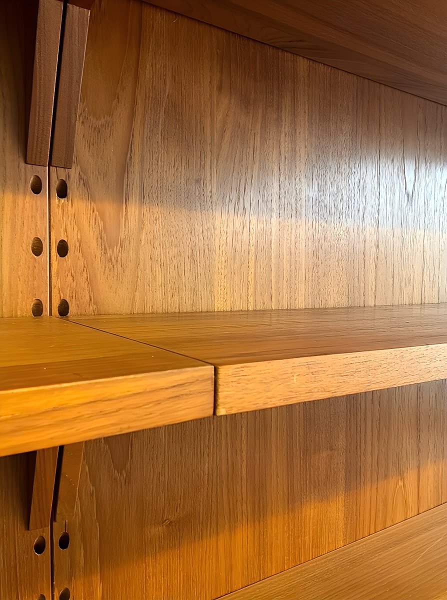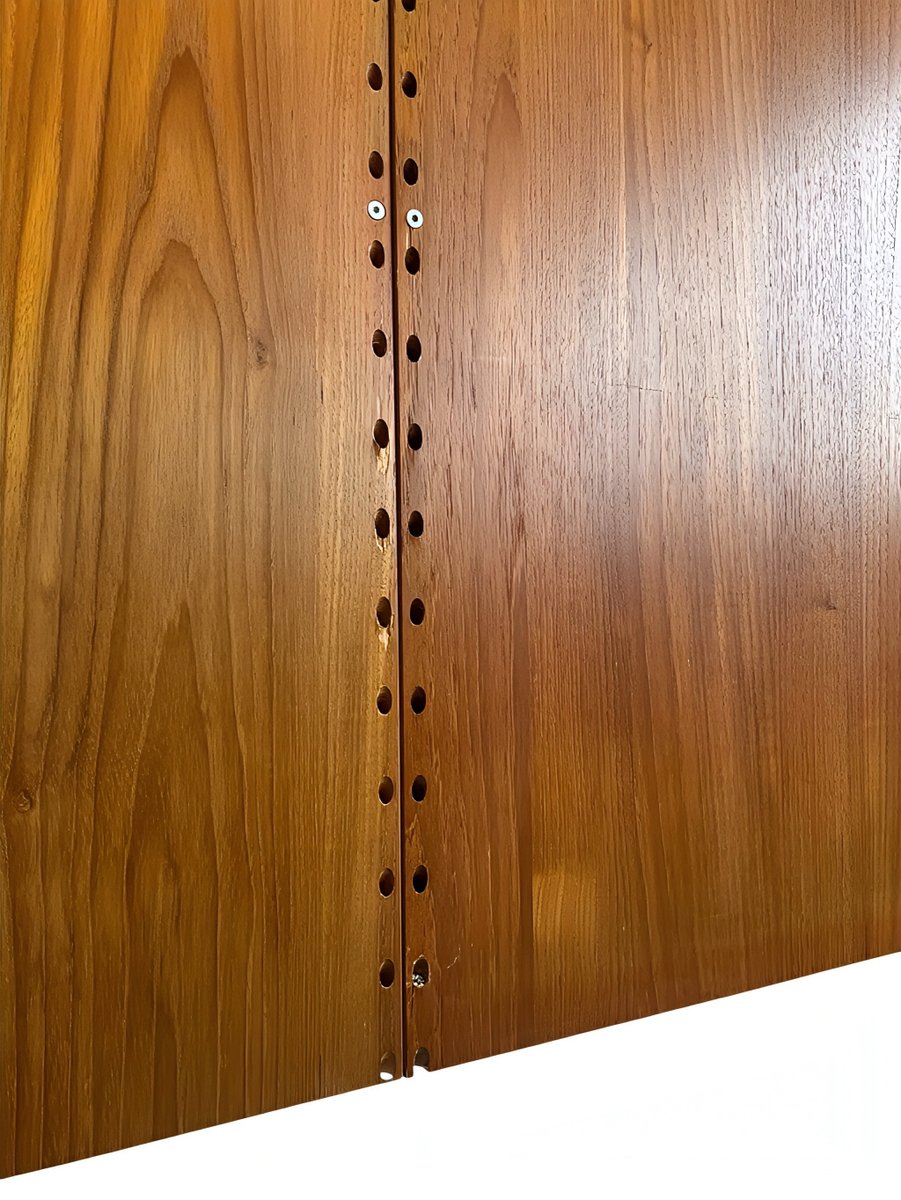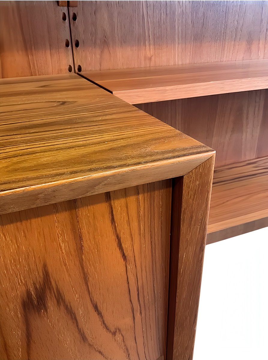 These are isolated minor to medium surface scratches, small dents/nicks, minor imperfections in the real wood veneer (mostly angular), and color variations in the teak wood due to light and use, especially—as is often the case—on the panels (see photos above). However, these flaws are less visible and noticeable with everyday use once the frame and shelves are installed. As long-time dealers, we consider the overall condition to be above average.