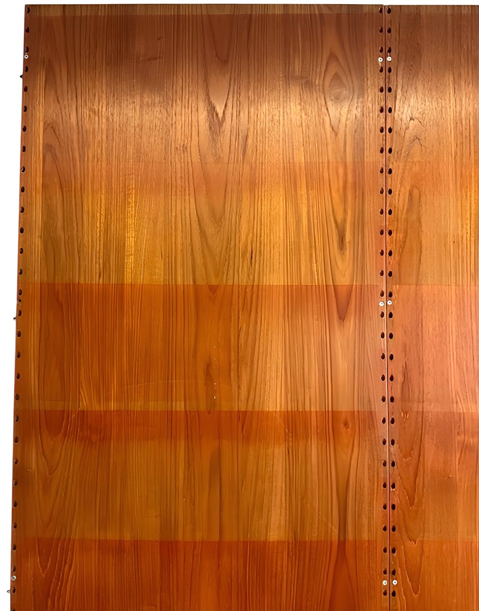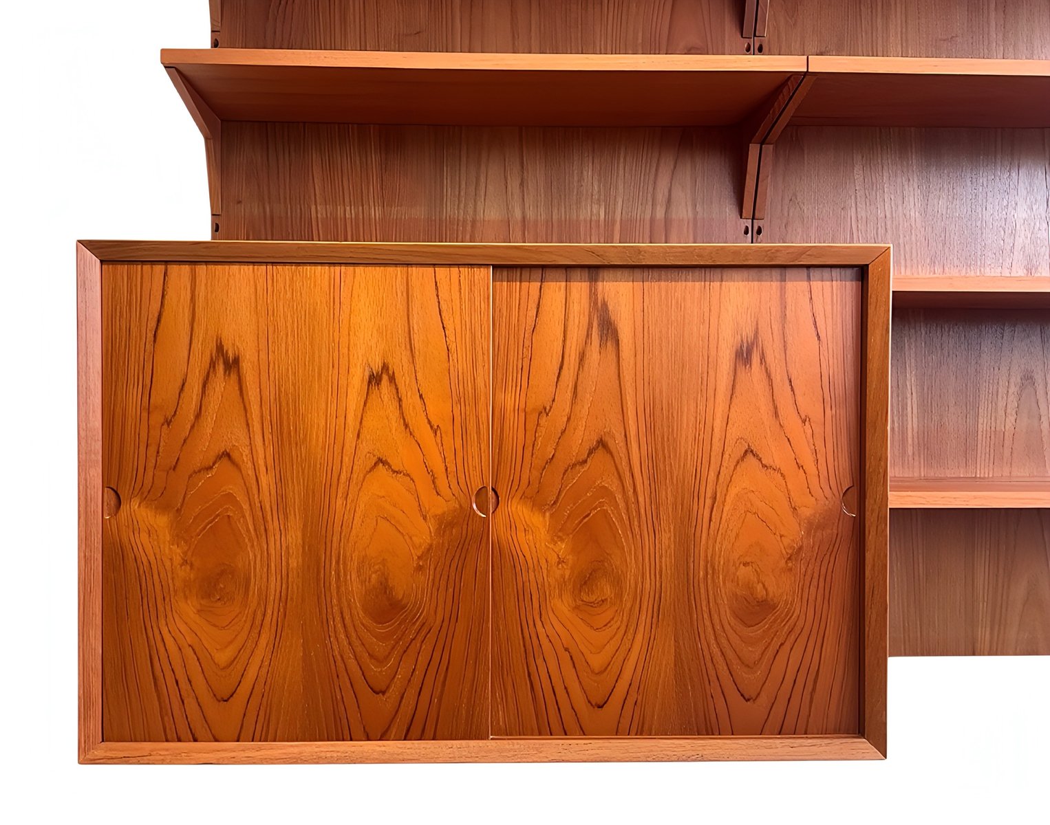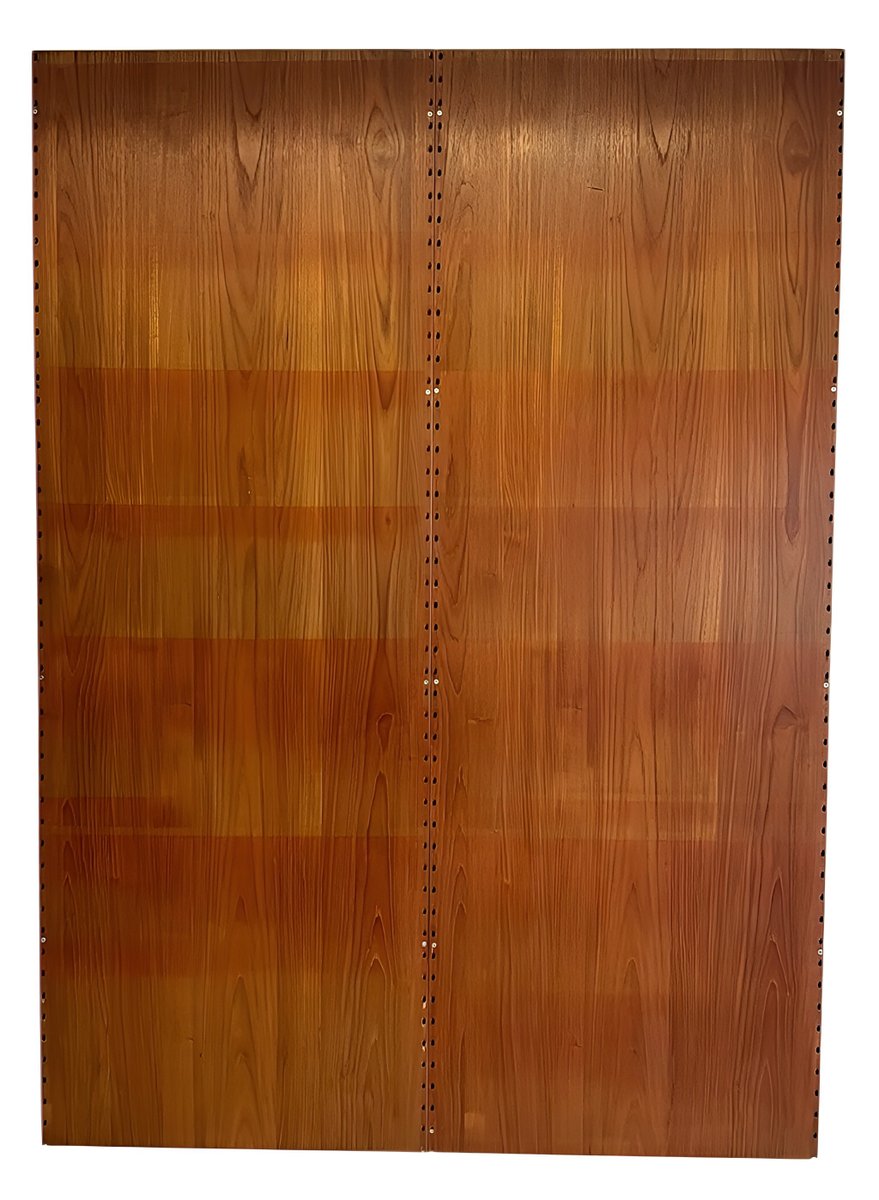 These are isolated minor to medium surface scratches, small dents/nicks, minor imperfections in the real wood veneer (mostly angular), and color variations in the teak wood due to light and use, especially—as is often the case—on the panels (see photos above). However, these flaws are less visible and noticeable with everyday use once the frame and shelves are installed. As long-time dealers, we consider the overall condition to be above average.