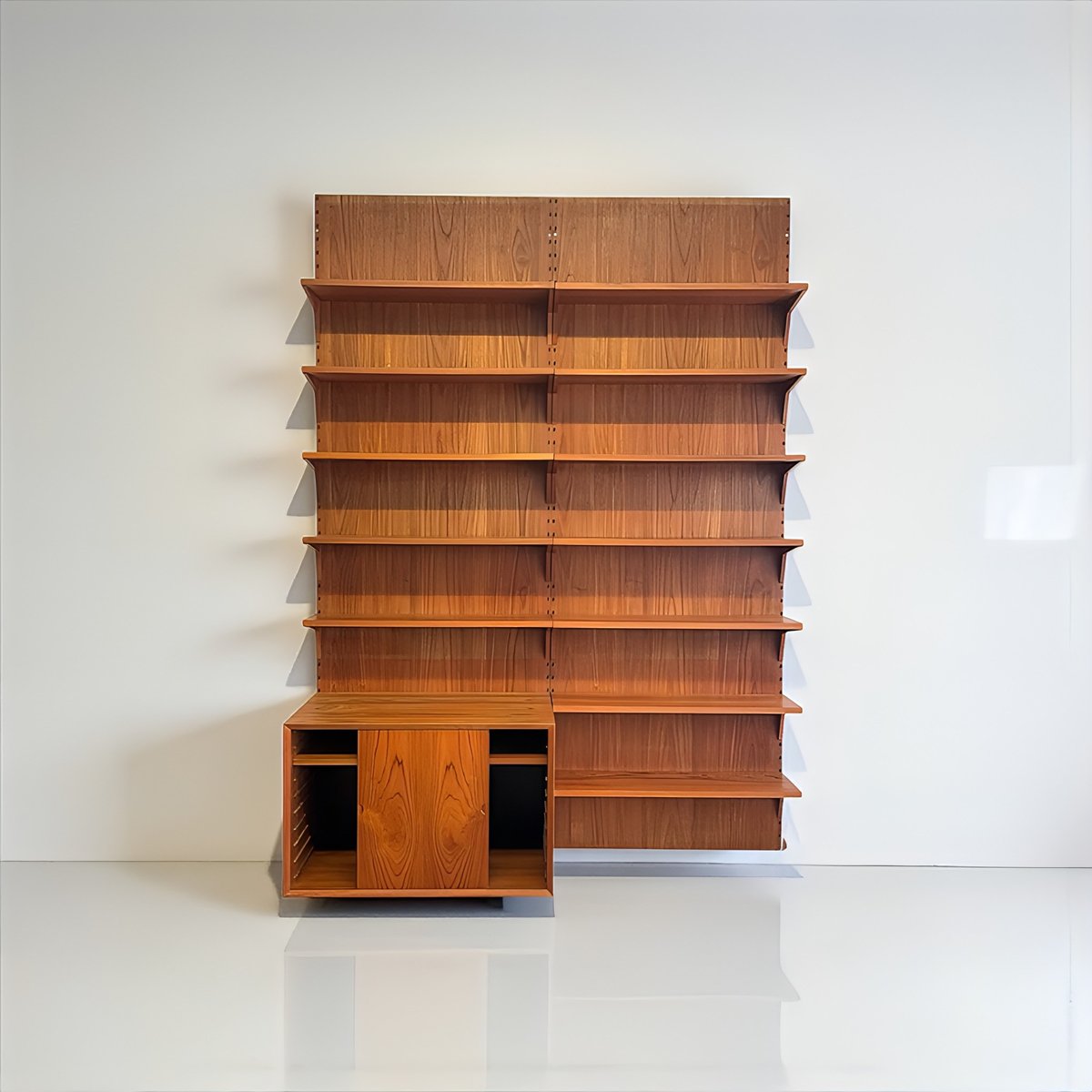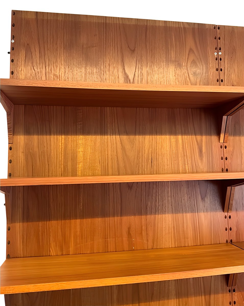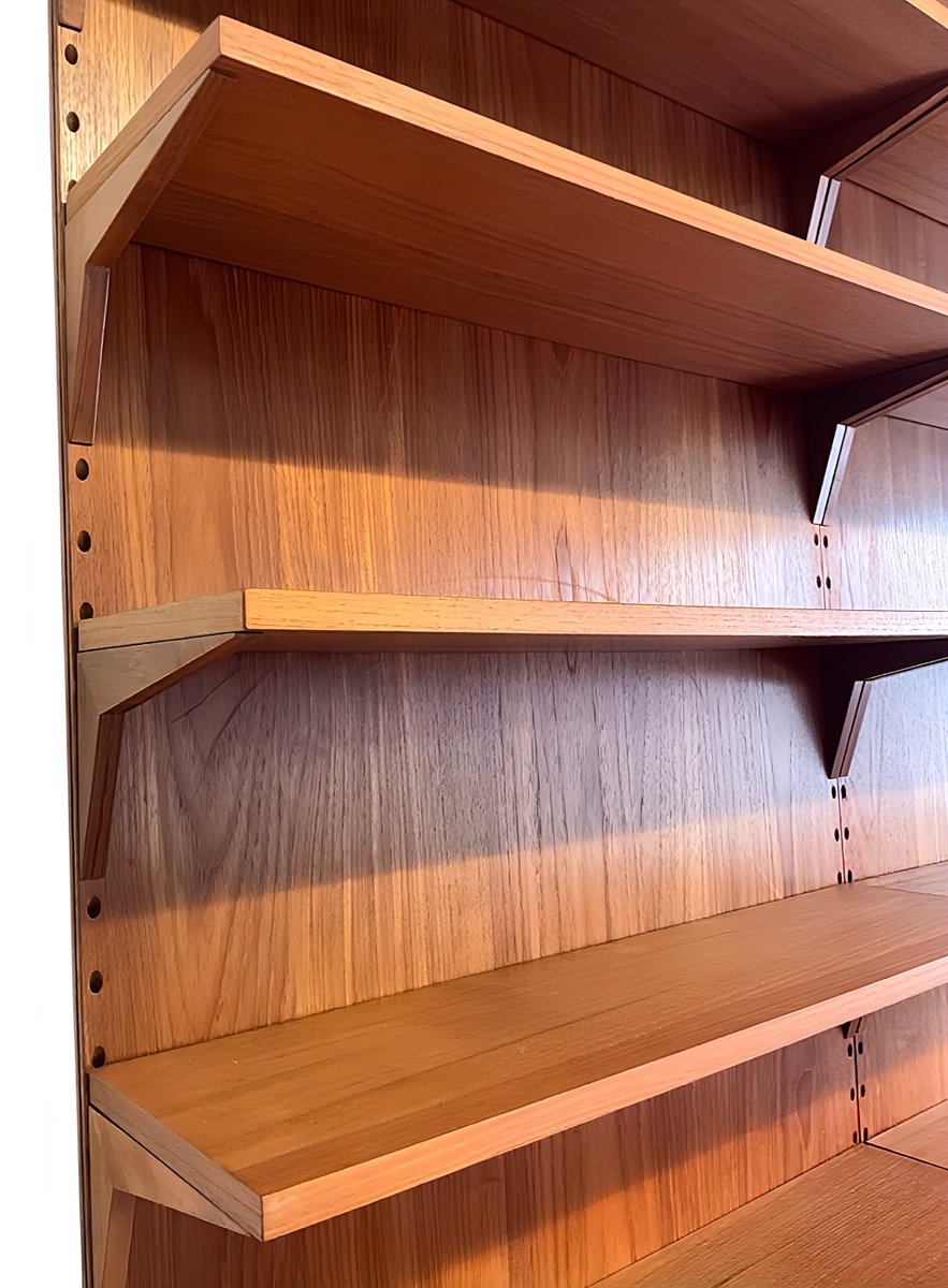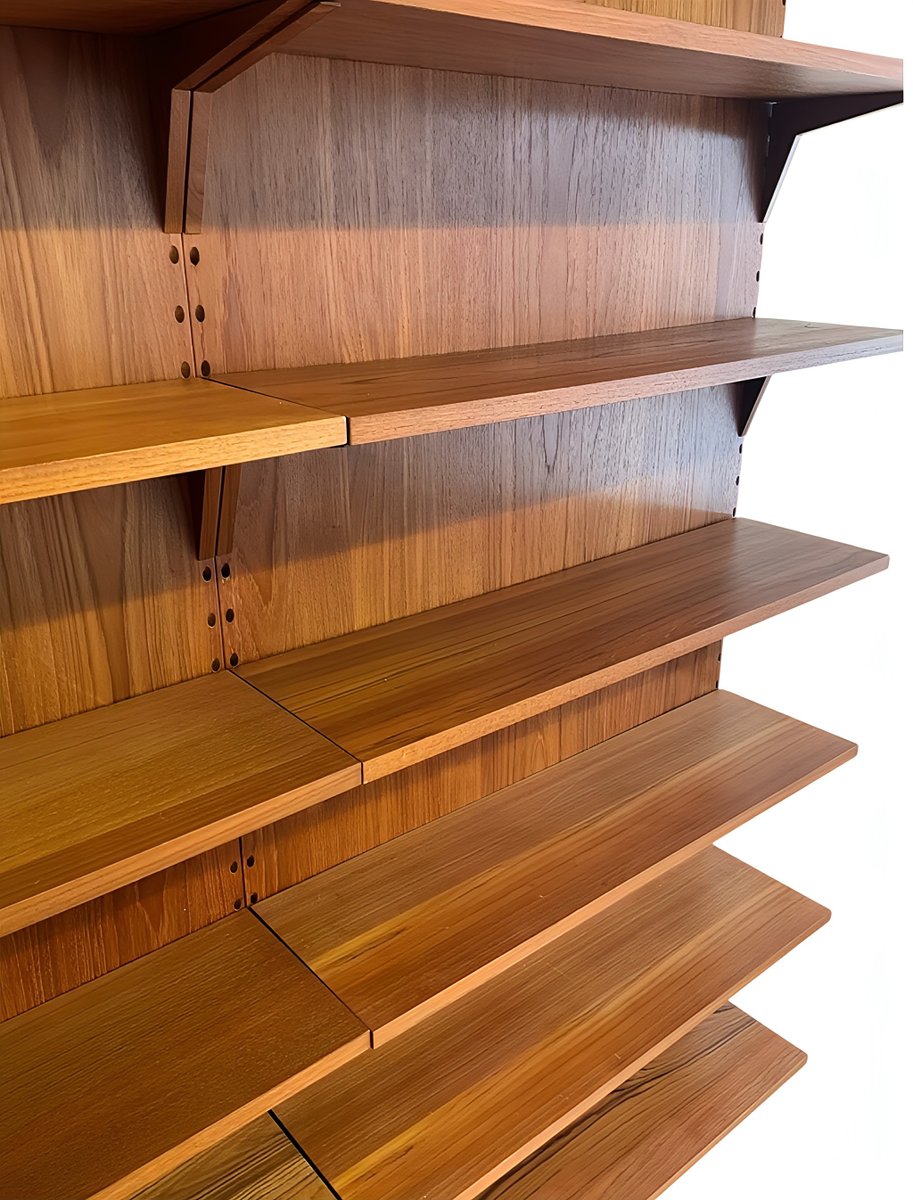 Le système d'étagères ROYAL est un joyau vintage et un classique du design du modernisme du milieu du siècle. Conçu par Poul Cadovius (1958) au Danemark, le meuble d'étagères ROYAL impressionne par son design moderne et intemporel. Cette configuration comprend un meuble spacieux avec des portes coulissantes pratiques et 12 étagères avec des supports assortis, ce qui confère à ce meuble d'étagères CADO sa modernité, sa légèreté et son exclusivité.